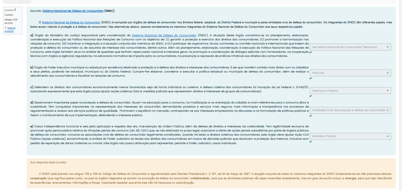 Questão Assunto: Sistema Nacional de Defesa do Consumidor (SNDC) Correto Atingiu 5.00 de O Sistema Nacional de Defesa do Consumidor (SNDC) é composto por de defesa do consumidor nos federal, estadual, do Distrito Federal e municipal e pelas entidades civis de defesa do Os integrantes do SNDC têm diferentes mas Marcar todos atuam visando à proteção e defesa do consumidor. Nas alternativas abaixo, associe corretamente os membros integrantes do Sistema Nacional de Defesa do Consumidor aos seus respectivos papéis. a) do Ministério da Justiça responsável pela coordenação do Sistema Nacional de Defesa do Consumidor (SNDC). A atuação deste órgão concentra-se no planejamento, elaboração, coordenação e execução da Politica Nacional das Relações de Consumo com os objetivos de: (i) garantir a proteção e exercicio dos direitos dos consumidores; (ii) promover a harmonização nas relações de consumo; (iii) incentivar a integração e a atuação conjunta dos membros do SNDC; (iv) participar de organismos, comissões ou nacionais e internacionais que tratem da proteção e defesa do consumidor ou de assuntos de interesse dos consumidores, dentre outros. Além do planejamento, elaboração, coordenação e execução da Politica Nacional das Relações de Secretaria Nacional do Consumidor (Senacon) Consumo, este órgão também atua na de questões que tenham repercussão nacional e interesse geral, na promoção e coordenação de diálogos setoriais com na cooperação técnica com órgãos e reguladoras, na advocacia normativa de impacto para os consumidores, na prevenção e repressão de práticas infrativas direitos dos consumidores. b) do Poder Executivo municipal ou estadual por destinado à proteção e à defesa dos direitos e interesses dos consumidores. ele que mantém contato mais direto com os cidadãos e seus pleitos, podendo ser estadual, municipal ou do Distrito Federal. elaborar, coordenar e executar politica estadual ou municipal de defesa do consumidor, além de realizar PROCON atendimento aos consumidores e fiscalizar as relações de consumo. c) Defendem os direitos dos consumidores economicamente menos favorecidos seja de forma individual ou A defesa coletiva dos consumidores foi inovação da Lei Federal n. 11.448/07, autorizando expressamente que este órgão possa ajuizar ações coletivas (isto é, medidas judiciais que representam direitos e interesses de grupos de consumidores). Defensoria Pública d) Desenvolvem importante papel na proteção e defesa do Atuam na educação para consumo, na mobilização e na orientação do cidadão e criam referências para consumo ético e sustentável. conquistas importantes na representação dos interesses do consumidor, demandando produtos e serviços mais seguros, mais informação e transparência nos processos de regulamentação e acesso aos serviços públicos de qualidade. Promovem equilibrio no mercado, contrapondo-se aos interesses empresariais na discussão e formulação de politicas públicas e Entidades Civis de proteção e defesa do consumidor fazem monitoramento de sua implementação, defendendo interesse público. e) Possui independência funcional e zela pela aplicação e respeito das leis, manutenção da Ordem Pública, além da defesa de direitos e interesses da coletividade Tem legitimidade exclusiva de promover ação penal pública relativa infrações penais de consumo (art. 80, CDC) que, se não efetivada no prazo legal, autorizará a oferta de ações penais subsidiárias por parte de órgãos públicos de defesa do consumidor, inclusive as associações civis de defesa do consumidor legalmente Quando há lesão a direitos coletivos dos este órgão deve ajuizar Ação Civil Público Pública (ações encaminhando à análise do Poder Judiciário as lesões aos direitos dos consumidores em busca de decisões judiciais que alcancem a proteção dos inclusive com pedido de reparação de danos materiais ou morais. Este órgão não possui atribuição para representar, perante Poder Judiciário, casos Sua resposta correta. O SNDC está previsto nos artigos 105 e 106 do Codigo de Defesa do Consumidor e regulamentado pelo Decreto Presidencial n. 2.181, de 20 de março de 1997. A atuação conjunta de todos membros integrantes do SNDC fundamenta-se em premissas básicas: cooperação (que significa operar na qual integrados se somam na promoção da defesa do consumidor; solidariedade, para que as atividades coletivas não sejam exercidas isoladamente, mas em grau de auxilio e sinergia, para que haja intercâmbio de experiências, ensinamentos, informações e forças. Importante ressaltar que entre eles não ha hierarquia ou subordinação.