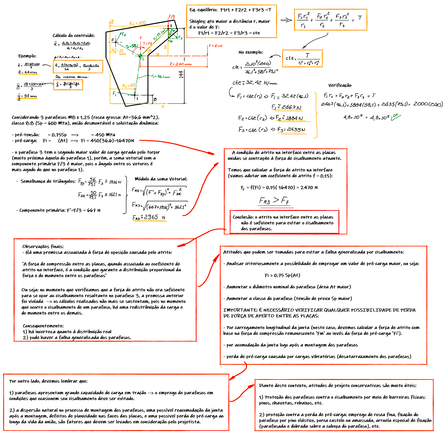 Eq. equilíbrio: F/3 T Shigley: ato maior a distância r, maior 3 é valor de F: Cálculo do centroide: F2 2 F F3 Exemplo: 56 No exemplo: T C 3 34 3 Da mesma 144 Verificação 3 18 Considerando 3 parafusos 1,25 (rosca grossa: At=36,6 mm^2), classe 8.8 (Sp união desmontável e solicitação dinâmica: F3=2435N pré-tensão: 450 pré-carga: Fi Fi parafuso 3 tem segundo maior valor de carga gerada pelo torçor A condição de atrito na interface entre as placas (muito próxima àquela do parafuso porém, a soma vetorial com a unidas se contrapõe à força de cisalhamento atuante. componente primária F/3 é maior, pois ângulo entre vetores é mais agudo do que no parafuso 1). Temos que calcular a força de atrito na interface (vamos adotar coeficiente de atrito 0,15): Semelhança de triângulos: 56 1816 Módulo da soma Vetorial: 50 FR3 Componente primária: F'=F/3 N Conclusão: atrito na interface entre as placas não é suficiente para evitar cisalhamento dos parafusos. Observações finais: Há uma premissa assoaciada à força de oposição causada pelo atrito: Atitudes que podem ser tomadas para evitar a falha generalizada por cisalhamento: força de compressão entre as placas, quando associada ao coeficiente de Analisar criteriosamente a possibilidade de empregar valor de pré-carga maior, on seja: atrito na interface, é a condição que garante a distribuição proporcional da força e do momento entre parafusos' Aumentar diâmetro nominal do parafuso (área At maior) seja: no momento que verificamos que a força de atrito não era suficiente para se opor cisalhamento resultante no parafuso a premissa anterior Aumentar a classe do parafuso (tensão de prova Sp maior) foi violada cálculos realizados não mais se sustentam, pois no momento que ocorre cisalhamento de um parafuso, há uma redistribuição da carga e IMPORTANTE: É NECESSÁRIO VERIFICAR QUALQUER POSSIBILIDADE DE PERDA do momento entre demais. DE FORÇA DE APERTO ENTRE AS PLACAS: Consequentemente: Por carregamento longitudinal da junta (neste caso, devemos calcular a força de atrito com 1) há incerteza quanto à distribuição real base na forca de compressão remanescente 'Fm' ao invés da força de pré-carga 'Fi'). 2) pode haver a falha generalizada dos parafusos. por acomodação da junta logo após a montagem dos parafusos perda de pré-carga causada por cargas vibratórias (desatarraxamento dos parafusos) Por outro lado, devemos lembrar que: Diante deste contexto, atitudes de projeto conservativas são muito úteis: 1) parafusos apresentam grande capacidade de carga em tração emprego de parafusos em condições que ocasionem seu cisalhamento deve ser evitado. 1) Proteção dos parafusos contra D cisalhamento por meio de barreiras físicas: pinos, chavetas, rebaixos, etc. 2) a dispersão natural no processo de montagem dos parafusos, uma possível reacomodação da junta após a montagem, defeitos de planicidade has faces das placas, e uma possivel perda de pré-carga 2) proteção contra a perda de pré-carga: emprego de rosca fina, fixação do longo da vida da união, são fatores que devem ser levados em consideração pelo projetista. parafuso por pino elástico, porca castelo amassada, arruela especial de fixação (parafusada e dobrada sobre a cabeça do parafuso), etc.