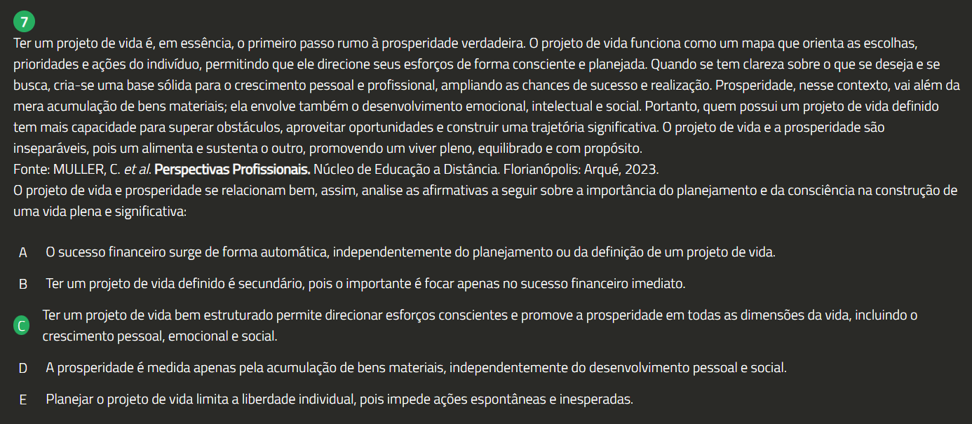 7 Ter um projeto de vida é, em essência, 0 primeiro passo rumo à prosperidade verdadeira. 0 projeto de vida funciona como um mapa que orienta as escolhas, prioridades e ações do indivíduo, permitindo que ele direcione seus esforços de forma consciente e planejada. Quando se tem clareza sobre 0 que se deseja e se busca, cria-se uma base sólida para 0 crescimento pessoal e profissional, ampliando as chances de sucesso e realização. Prosperidade, nesse contexto, vai além da mera acumulação de bens materiais; ela envolve também 0 desenvolvimento emocional, intelectual e social. Portanto, quem possui um projeto de vida definido tem mais capacidade para superar obstáculos, aproveitar oportunidades e construir uma trajetória significativa. 0 projeto de vida e a prosperidade são inseparáveis, pois um alimenta e sustenta 0 outro, promovendo um viver pleno, equilibrado e com propósito. Fonte: MULLER, et al. Perspectivas Profissionais. Núcleo de Educação a Distância. Florianópolis: Arqué, 2023. 0 projeto de vida e prosperidade se relacionam bem, assim, analise as afirmativas a seguir sobre a importância do planejamento e da consciência na construção de uma vida plena e significativa: A 0 sucesso financeiro surge de forma automática, independentemente do planejamento ou da definição de um projeto de vida. B Ter um projeto de vida definido é secundário, pois 0 importante é focar apenas no sucesso financeiro imediato. Ter um projeto de vida bem estruturado permite direcionar esforços conscientes e promove a prosperidade em todas as dimensões da vida, incluindo 0 crescimento pessoal, emocional e social. D A prosperidade é medida apenas pela acumulação de bens materiais, independentemente do desenvolvimento pessoal e social. E Planejar 0 projeto de vida limita a liberdade individual, pois impede ações espontâneas e inesperadas.