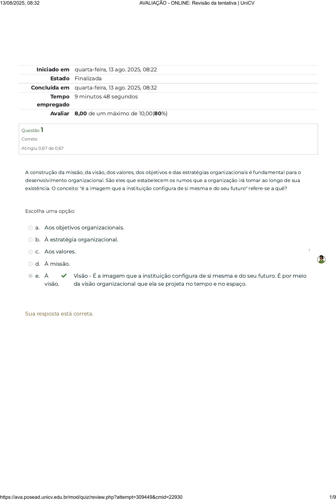 Iniciado em quarta-feira, 13 ago. 2025, 08:22 Estado Finalizada Concluída em quarta-feira, 13 ago. 2025, 08:32 Tempo empregado 9 minutos 48 segundos Avaliar 8,00 de um máximo de 10,00(80%) Questão 1 Correto Atingiu 0,67 de 0,67 Escolha uma opção: A construção da missão, da visão, dos valores, dos objetivos e das estratégias organizacionais é fundamental para o desenvolvimento organizacional. São eles que estabelecem os rumos que a organização irá tomar ao longo de sua existência. O conceito: "é a imagem que a instituição configura de si mesma e do seu futuro" refere-se a quê? a. Aos objetivos organizacionais. b. À estratégia organizacional. c. Aos valores. d. À missão. e. À visão. Visão - É a imagem que a instituição configura de si mesma e do seu futuro. É por meio da visão organizacional que ela se projeta no tempo e no espaço. Sua resposta está correta. 1 13/08/2025, 08:32 AVALIAÇÃO - ONLINE: Revisão da tentativa | UniCV https://ava.posead.unicv.edu.br/mod/quiz/review.php?attempt=309449&cmid=22930 1/9 Questão 2 Correto Atingiu 0,66 de 0,66 Questão 3 Correto Atingiu 0,67 de 0,67 Escolha uma opção: É o principal modelo de gestão que articula e promove o bom relacionamento entre as pessoas e as empresas, promovendo assim, um equilíbrio entre os interesses de ambas as partes. Assinale a alternativa que representa o modelo referido nessa afirmativa: a. Modelo de gestão financeira b. Modelo de gestão estratégica c. Modelo de gestão de pessoas A gestão de pessoas atribui ainda uma visão estratégica desse relacionamento, proporcionando condições de obtenção do que as duas partes tem de melhor a oferecer uma para a outra, dentro da enorme complexidade e subjetividade que essa relação apresenta. d. Modelo de gestão contemporânea e. Modelo de gestão empresarial Sua resposta está correta. Escolha uma opção: A gestão de pessoas, ao longo do tempo, vem sofrendo modificações importantes. No período de 1950 a 1965, qual era o foco organizacional? a. Foco administrativo. b. Foco mecanicista. Foco mecanicista - De 1950 a 1965. c. Foco na contabilidade. d. Foco estratégico. e. Foco nas questões legais. Sua resposta está correta. 1 13/08/2025, 08:32 AVALIAÇÃO - ONLINE: Revisão da tentativa | UniCV https://ava.posead.unicv.edu.br/mod/quiz/review.php?attempt=309449&cmid=22930 2/9 Questão 4 Correto Atingiu 0,67 de 0,67 Questão 5 Correto Atingiu 0,67 de 0,67 Escolha uma opção: A Gestão de Pessoas é baseada em quatro características elementares. Qual das afirmativas abaixo representa a característica em que os colaboradores são vistos como pessoas que possuem competências indispensáveis ao crescimento da organização? a. As pessoas como ativadoras de recursos organizacionais. b. As pessoas como talentos fornecedores de competências. As pessoas como talentos fornecedores de competências, possuem competências indispensáveis ao crescimento da organização. Dessa forma, valorizar as pessoas que já estão inseridas no contexto da organização, retendo esses talentos é uma forma de manter sua competitividade. c. As pessoas como parceiras da organização. d. As pessoas como seres humanos. e. As pessoas como o capital humano das organizações. Sua resposta está correta. Escolha uma opção: Para que a organização possa promover uma melhoria da qualidade de vida no trabalho dos seus colaboradores, os gestores precisam estar atentos a alguns riscos que afetam a saúde dos colaboradores em uma organização. Das alternativas abaixo, qual representa os riscos que afetam o lado psicossocial dos colaboradores? a. Riscos químicos. b. Carga de trabalho física, mental, cognitiva e psíquica. A carga de trabalho física, mental, cognitiva e psíquica está diretamente relacionada ao desgaste físico, metal cognitivo e psicológico decorrente das atribuições de cada indivíduo. c. Riscos biológicos. d. Riscos físicos. e. Riscos de acidente no trabalho. Sua resposta está correta. 1 13/08/2025, 08:32 AVALIAÇÃO - ONLINE: Revisão da tentativa | UniCV https://ava.posead.unicv.edu.br/mod/quiz/review.php?attempt=309449&cmid=22930 3/9 Questão 6 Correto Atingiu 0,66 de 0,66 Questão 7 Correto Atingiu 0,66 de 0,66 Escolha uma opção: São muitos os fatores internos e externos que podem influenciar os índices de absenteísmo em uma organização. Que fator se configura em uma das maiores causas de ausências dos colaboradores, na medida em que pode tornar o ambiente de trabalho insuportável? a. A falta de condições adequadas de trabalho. b. O clima organizacional. c. O assédio moral. Assédio moral – O assédio moral configura-se em uma das maiores causas de ausências dos colaboradores, uma vez que pode tornar o ambiente de trabalho insuportável para quem é assediado. d. A qualidade de vida no trabalho. e. A liderança. Sua resposta está correta. Escolha uma opção: Getúlio Vargas acreditava que a burocracia idealizada por Weber, considerando sua rigidez e hierarquia, seria capaz de regular a máquina administrativa brasileira. O Departamento Administrativo do Setor Público (DASP) apoiou a implementação da burocratização no país. Vargas tinha, ainda, como objetivos: a. Resolver com maior agilidade as demandas da sociedade, insatisfeita com os serviços oferecidos pela administração pública. b. Criação do Comitê de Simplificação da Burocracia (CoSB). c. Constituir uma estrutura administrativa bem organizada, instituir uma política de pessoal baseada no mérito, terminar com o nepotismo e com a corrupção. Constituir uma estrutura administrativa bem organizada, instituir uma política de pessoal baseada no mérito, terminar com o nepotismo e com a corrupção eram objetivos de Vargas. d. Diminuir as diferenças salariais existentes entre os servidores do setor público e os cargos equivalentes no setor privado. e. Criação da Secretaria da Modernização da Reforma Administrativa (Semor). Sua resposta e