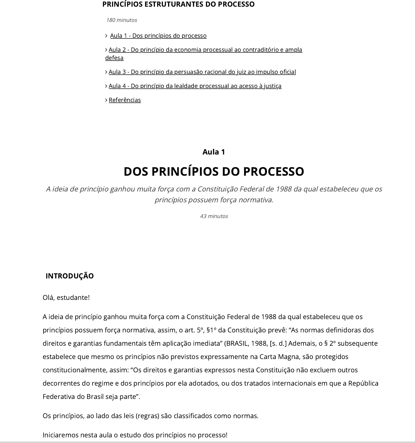 03/04/2024, 13:45 wlldd_231_u2_teo_ger_pro https://www.avaeduc.com.br/mod/url/view.php?id=3315116 1/33 INTRODUÇÃO Olá, estudante! A ideia de princípio ganhou muita força com a Constituição Federal de 1988 da qual estabeleceu que os princípios possuem força normativa, assim, o art. 5º, §1º da Constituição prevê: “As normas de�nidoras dos direitos e garantias fundamentais têm aplicação imediata” (BRASIL, 1988, [s. d.] Ademais, o § 2º subsequente estabelece que mesmo os princípios não previstos expressamente na Carta Magna, são protegidos constitucionalmente, assim: “Os direitos e garantias expressos nesta Constituição não excluem outros decorrentes do regime e dos princípios por ela adotados, ou dos tratados internacionais em que a República Federativa do Brasil seja parte”. Os princípios, ao lado das leis (regras) são classi�cados como normas. Iniciaremos nesta aula o estudo dos princípios no processo! Aula 1 DOS PRINCÍPIOS DO PROCESSO A ideia de princípio ganhou muita força com a Constituição Federal de 1988 da qual estabeleceu que os princípios possuem força normativa. 43 minutos PRINCÍPIOS ESTRUTURANTES DO PROCESSO Aula 1 - Dos princípios do processo Aula 2 - Do princípio da economia processual ao contraditório e ampla defesa Aula 3 - Do princípio da persuasão racional do juiz ao impulso o�cial Aula 4 - Do princípio da lealdade processual ao acesso à justiça Referências 180 minutos 03/04/2024, 13:45 wlldd_231_u2_teo_ger_pro https://www.avaeduc.com.br/mod/url/view.php?id=3315116 2/33 PRINCÍPIOS E REGRAS: CONCEITO E DIFERENCIAÇÃO. PRINCÍPIOS CONSTITUCIONAIS E INFRACONSTITUCIONAIS DO PROCESSO Princípio é uma norma. Princípio é uma fonte do direito, assim como é a lei, a doutrina, os enunciados de súmula, os precedentes e a jurisprudência. Os princípios como norma, constituem fonte de direito para que o Poder Judiciário os aplique na solução das causas que lhe são submetidas. Contudo, para que se possa entender a estrutura principiológica e mesmo o grau de incidência dos princípios no sistema processual civil – e em que medida eles convivem com as regras (leis) – é importante re�etir, novamente, sobre a (estreita) relação entre o direito processual e o direito constitucional. Assim, a Constituição, em sua função de tutelar o ordenamento, estabelece as diretrizes e os contornos da vida do processo. Não apenas enunciando os princípios a serem seguidos, mas na estruturação do Poder Judiciário, na �xação de competência, na previsão de determinados recursos e medidas judiciais, entre outros. No entanto, essa função constitucional não se dá apenas de cima para baixo. Ou seja, não apenas a Constituição alimentará o processo com regras, princípios e diretrizes. O vetor pode ser visto pelo outro lado: o processo poderá mudar as características da Constituição. Essa condição é muito evidente se se imaginar que as decisões exaradas pelos Tribunais, nos seus mais diversos níveis, podem mudar a interpretação de determinados dispositivos constitucionais. Veja-se que o magistrado, com fundamentos válidos no próprio ordenamento (regras postas e princípios), altera o modo de ser da Constituição. Essa atuação, vista no cotidiano forense com base nas decisões judiciais, pode ser denominada indireta. Porém, existe uma forma de atuação direta nos casos de controle difuso (demanda cujo controle de constitucionalidade será feito por qualquer magistrado incidenter tantum) ou concentrado (demanda em que o objeto litigioso é a própria questão da constitucionalidade da norma). Pois bem. É importante estabelecer uma premissa: conquanto o Brasil tenha sido, ao longo de sua história, considerado um país �liado à escola do civil law (e, portanto, de tradição legalista, fruto em boa parte da herança do Estado Liberal do século XIX), nos tempos atuais chegou-se à conclusão de que a simples utilização da lei seja insu�ciente ou inapta para solucionar todas as questões com as quais o Poder Judiciário se depara diante de uma necessidade do direito material. Essa inaptidão decorre de três fatores principais que não exaurem, evidentemente, todas as situações possíveis: a) a multiplicidade de situações encontradiças no direito material, que torna �sicamente impossível ao legislador abranger uma área tão extensa de conduta. É dizer, a lei não pode, não consegue e (por que não dizer) não quer solucionar todas as situações carecedoras de tutela. Mas é fato que toda sociedade deve ser regida pelo direito (ubi societas ibi ius); b) as constantes alterações do direito material decorrentes de novas relações, mudanças de costumes e ideologias, novas tecnologias, eventos da natureza, sociedade da informação entre outros. É fato que a notória burocracia na cadeia produtiva de uma lei no Congresso é in�nitamente mais lenta que as inúmeras mudanças que ocorrem na sociedade; e c) a intrínseca 03/04/2024, 13:45 wlldd_231_u2_teo_ger_pro https://www.avaeduc.com.br/mod/url/view.php?id=3315116 3/33 Imprimir impossibilidade de a lei ater-se a minúcias e situações particulares, já que desenvolvida e engendrada para ser geral e abstrata. A generalidade e a abstração nem sempre conseguem solucionar a questão posta em juízo, pois a norma não se “enquadra” de forma perfeita ao caso. É nessa situação que se revela a importância capital dos princípios, não apenas para ordenar o sistema, mas também para interpretar ou complementar nos casos de lacuna, dubiedade, vagueza ou imperfeição legislativa. É dessa forma que não se pode aceitar que os princípios sejam meros instrumentos de supressão de lacunas (como erroneamente se apresenta no art. 4o da LINDB da qual: “art. 4o Quando a lei for omissa, o juiz decidirá o caso de acordo com a analogia, os costumes e os princípios gerais de direito”) (BRASIL, 1942, [s. d.]). Princípios fazem 