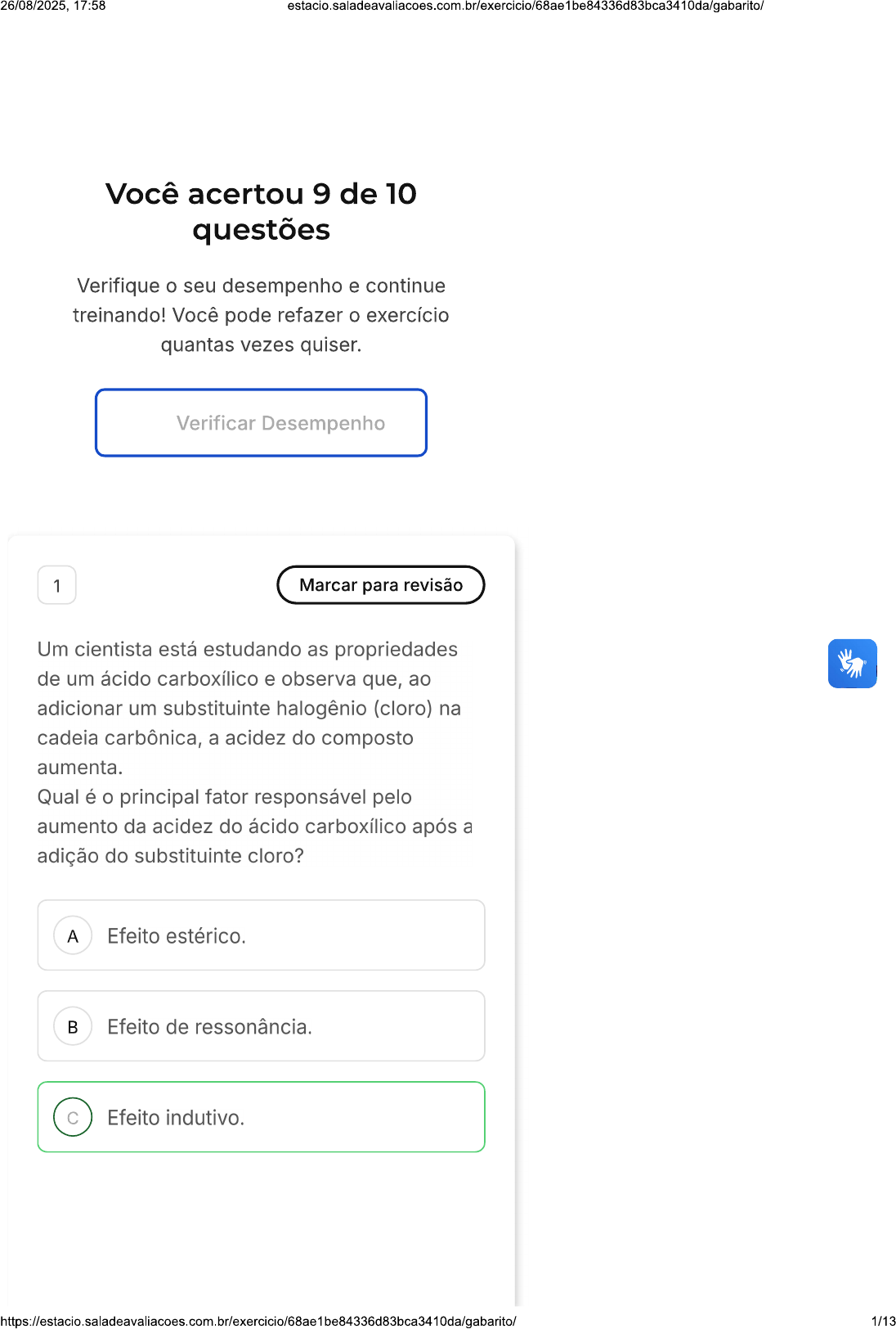 26/08/2025, 17:58 estacio.saladeavaliacoes.com.br/exercicio/68ae1be84336d83bca3410da/gabarito/ Você acertou 9 de 10 questões Verifique seu desempenho e continue treinando! Você pode refazer exercício quantas vezes quiser. Verificar Desempenho 1 Marcar para revisão Um cientista está estudando as propriedades de um ácido carboxílico e observa que, ao adicionar um substituinte halogênio (cloro) na cadeia carbônica, a acidez do composto aumenta. Qual é principal fator responsável pelo aumento da acidez do ácido carboxílico após a adição do substituinte cloro? A Efeito estérico. Efeito de ressonância. c Efeito indutivo. 1/1326/08/2025, 17:58 estacio.saladeavaliacoes.com.br/exercicio/68ae1be84336d83bca3410da/gabarito/ D Efeito hidrofóbico. E Efeito pi-pi. Resposta correta Parabéns, você selecionou a alternativa correta. Confira gabarito comentado! Gabarito Comentado efeito indutivo ocorre quando um substituinte eletronegativo, como cloro, é adicionado à cadeia carbônica de um ácido carboxílico. Esse substituinte atrai densidade eletrônica para si, aumentando a acidez do ácido ao estabilizar melhor ânion carboxilato formado após a ionização. 2 Marcar para revisão Um estudante de química prepara uma solução aquosa de ácido acético. Ele observa que, apesar de ser um ácido, a solução não conduz eletricidade tão eficientemente quanto uma solução de ácido clorídrico. Qual característica do ácido acético explica sua menor eficiência em conduzir eletricidade em comparação com ácido clorídrico? 2/1326/08/2025, 17:58 A Menor grau de ionização. Maior peso molecular. c Maior polaridade. D Menor ponto de ebulição. E Maior solubilidade em água. Resposta correta Parabéns, você selecionou a alternativa correta. Confira gabarito comentado! Gabarito Comentado ácido acético é um ácido fraco, que significa que ele se ioniza menos em solução aquosa em comparação com um ácido forte como ácido clorídrico. Este menor grau de ionização resulta em menos íons livres na solução, o que diminui a eficiência da solução em conduzir eletricidade. 3 Marcar para revisão Uma equipe de químicos está convertendo um ácido carboxílico em um cloreto de ácido para aumentar sua reatividade. Eles utilizam um reagente específico para facilitar essa conversão. https://estacio.saladeavaliacoes.com.br/exercicio/68ae1be84336d83bca3410da/gabarito/ 3/1326/08/2025, 17:58 estacio.saladeavaliacoes.com.br/exercicio/68ae1be84336d83bca3410dagabarito/ Qual reagente é comumente usado para converter um ácido carboxílico em cloreto de ácido? A Hidróxido de sódio. Cloreto de tionila. c Éter dietílico. D Ácido sulfúrico. E Hidróxido de potássio. Resposta correta Parabéns, você selecionou a alternativa correta. Confira gabarito comentado! Gabarito Comentado cloreto de tionila é frequentemente utilizado para converter ácidos carboxílicos em cloretos de ácido. Este reagente é eficaz devido à sua capacidade de facilitar a reação de substituição, formando um cloreto de ácido mais reativo. 4 Marcar para revisão Identifique os compostos A e da reação abaixo: 4/1326/08/2025, 17:58 0 1. 0 1. 50% KoH, refluxo Et0 OEt 2.A OEt 2. diluído reflluxo CH₃ A = cloreto de n-pentila / = ácido 2- A metil-hexanóico. A = 1-bromobutano / = hexanoato de etila. A = cloreto de n-butila / = hexanoato c de etila. A = ácido butanoico / = ácido D haxanóico. A = 1-bromobutano / = ácido E hexanóico. Resposta correta Parabéns, você selecionou a alternativa correta. Confira gabarito comentado! Gabarito Comentado A resposta correta é: A = I-bromobutano / = ácido hexanóico. 5 Marcar para revisão Um grupo de pesquisa está analisando a formação de anidridos a partir de cloretos de acila. Eles planejam estudar a reação do cloreto 5/1326/08/2025, 17:58 estacio.saladeavaliacoes.com.br/exercicio/68ae1be84336d83bca3410da/gabarito/ de acila com um ácido carboxílico específico sob condições controladas. Qual produto é esperado da reação de um cloreto de acila com um ácido carboxílico? A Amida. Éster. c Anidrido. D Álcool. E Cloreto de acila. Resposta correta Parabéns, você selecionou a alternativa correta. Confira gabarito comentado! Gabarito Comentado A reação de um cloreto de acila com um ácido carboxílico geralmente resulta na formação de anidridos. Esta é uma rota sintética importante para a preparação de anidridos usados em diversas aplicações químicas. As outras opções, como amidas, ésteres, álcoois e cloretos de acila, não são os produtos principais desta reação específica. 6/1326/08/2025, 17:58 6 Marcar para revisão Em uma análise de substâncias orgânicas, um químico identifica um composto com um grupo carboxila e um grupo amino na mesma molécula, indicando que se trata de um aminoácido. Qual característica estrutural distingue um aminoácido de outros tipos de ácidos carboxílicos? Lista de exercícios Ácidos... T Sair B Presença de um grupo amino. Questão 8 de 10 c Ausência de duplas ligações. 1 2 3 4 5 D Estrutura cíclica. 6 7 8 9 10 Corretas (9) E Ausência de grupo carboxila. Incorretas (1) Em branco (0) Resposta correta Parabéns, você selecionou a alternativa correta. Confira gabarito comentado! Gabarito Comentado A característica estrutural que distingue um aminoácido de outros ácidos carboxílicos é a presença de um grupo amino. Além do grupo carboxila, que é comum a todos os ácidos carboxílicos, os aminoácidos 7/1326/08/2025, 17:58 possuem um grupo amino, essencial para sua função biológica. 7 Marcar para revisão Uma reação importante dos ácidos carboxílicos e de seus derivados é a substituição nucleofílica. Os derivados de ácidos, tais como os cloretos de acila, são muito reativos e, por essa razão, são utilizados na obtenção de derivados de ácido como os ésteres, anidridos e amidas. Considere a síntese do acetato de etila a partir do cloreto de acetila e etanol,