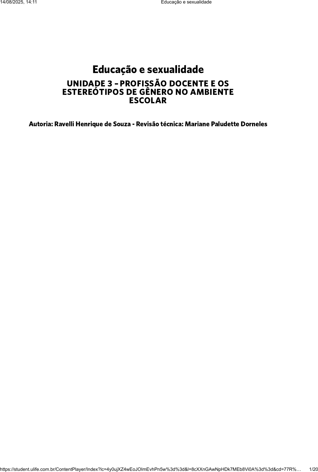 Autoria: Ravelli Henrique de Souza - Revisão técnica: Mariane Paludette Dorneles Educação e sexualidade UNIDADE 3 – PROFISSÃO DOCENTE E OS ESTEREÓTIPOS DE GÊNERO NO AMBIENTE ESCOLAR 14/08/2025, 14:11 Educação e sexualidade https://student.ulife.com.br/ContentPlayer/Index?lc=4y0ujXZ4wEoJOImEvhPn5w%3d%3d&l=8cXXnGAwNpHDk7MEb8Vi0A%3d%3d&cd=77R%… 1/20 Os discursos sobre as relações de gênero e as questões sobre a educação sexual permeiam, no século 21, todas as instituições disciplinares, principalmente a escola. Assim, professores precisam investir na formação continuada e se especializarem como profissionais qualificados a fim de entender as subjetividades humanas para desconstruir os estereótipos de gênero no ambiente educacional. Dito isso, em tempos contemporâneos, esta unidade traz as seguintes problematizações: Como pensar as relações de gênero e o papel dos(as) educadores(as) no ambiente escolar? Quais as problemáticas de gênero na educação infantil em relação à profissão docente? Brinquedos e cores têm gênero? Como desconstruir atividades generificadas na escola? Como efetivar a educação plural na escola além das normalizações curriculares? Com o objetivo de responder a essas problemáticas nos tópicos a seguir, desejo a você, estudante, bons estudos! Introdução 3.1 Relações de gênero e o papel dos(as) educadores(as) no ambiente escolar Ao iniciar esta sessão, é importante ressaltar o pensamento de Furlani (2016) ao afirmar que as relações de gênero e de sexualidade, assim como o desenvolvimento integral e psicossexual das crianças, devem ser olhadas por um processo educativo contínuo, mas que sejam reconhecidas de forma diferenciada. Isso significa dizer que se prezam as relações subjetivas e plurais, mas com objetivos específicos em relação ao ser e ao saber, além do processo ensino-aprendizagem. Ao ler essas informações, muitos profissionais em formação inicial ou em formação continuada perguntarão: “Como devo iniciar a efetivação da educação plural diante das dificuldades contemporâneas que a escola enfrenta?” 14/08/2025, 14:11 Educação e sexualidade https://student.ulife.com.br/ContentPlayer/Index?lc=4y0ujXZ4wEoJOImEvhPn5w%3d%3d&l=8cXXnGAwNpHDk7MEb8Vi0A%3d%3d&cd=77R%… 2/20 #PraCegoVer: a figura mostra algumas pessoas com um símbolo de interrogação diante do rosto, indagando como iniciar a discussão sobre representação de gênero e educação sexual no ambiente escolar. É fato que, para muitos professores, principalmente aqueles que não investiram em uma formação continuada de qualidade, seja por meio de cursos de curta, média e longa duração, seja por meio de especializações latu ou stricto sensu, é muito dificultoso tratar sobre educação sexual e identidade de gênero em sala de aula, pois, “[...] quando se trata de dar início a uma prática docente de planejamento de implementação de atividades no campo da educação sexual muitos/as educadores/as não sabem por onde começar” (FURLANI, 2016, p. 87). Desse modo, é importante reforçar “[...] que trabalhar as relações de gênero na escola é uma atitude necessária que precisa ser aprimorada a cada dia” (TEIXEIRA; MAGNABOSCO, 2010, p. 51). Segundo a autora, ao se referir ao aprimoramento atitudinal, ela afirma que é preciso conceber práticas pedagógicas inovadoras, que partam de um pensamento crítico e reflexivo, sem atribuir papéis sexuais ou de gênero às crianças colaborando com a construção da autonomia e da emancipação humana dos alunos de maneira positiva e plural. Nesse sentido de educação para as pluralidades, podemos exemplificar relatos sobre as questões de gênero interligadas à tomada de decisão docente. Assim, em concordância com os estudos de Furlani (2016) e os de Teixeira e Magnabosco (2010), é muito comum que, desde a educação infantil, a partir aproximadamente dos seis anos de idade, meninos e meninas toquem seus corpos e o de seus colegas; tendam a se masturbar quando sentem excitação sexual, sendo reprimidos por tal ato; brincam, com base em figuras simbólicas sobre a vida adulta, de serem namorados, pois estão em pleno processo de desenvolvimento de sua sexualidade. Porém, quando esses exemplos acontecem em sala de aula, é fidedigno afirmar que os(as) professores(as), ao verem tais atos, “[...] muitas das vezes, [...] encaminham para a coordenação da escola e dizem não saber como agir diante dessa situação” (TEIXEIRA; MAGNABOSCO, 2010, p. 51). As autoras ainda relatam que, na maioria das vezes, os professores(as) ao acreditarem que a situação é inadequada, tendem a demonstrar sentimentos de raiva e atitude disciplinadoras, colocando os alunos de castigo ou “[...] ensinando o modo correto de se comportar” perante a sociedade normativa. Figura 1 - Representação de professores indagando como iniciar as discussões sobre a temática de representação de gênero e educação sexual no ambiente escolar Fonte: Fizkes, Shutterstock, 2020. 14/08/2025, 14:11 Educação e sexualidade https://student.ulife.com.br/ContentPlayer/Index?lc=4y0ujXZ4wEoJOImEvhPn5w%3d%3d&l=8cXXnGAwNpHDk7MEb8Vi0A%3d%3d&cd=77R%… 3/20 É possível evidenciar que professores(as), ao atribuir o que meninas e meninos devem fazer, trabalham com relações de gênero com papéis sexuais, fazendo com que a violência simbólica se efetive no ambiente escolar desde a tenra idade. “Trata-se de uma forma de negar o corpo e a sexualidade da criança, com o suposto intuito de preservar a infância. A sexualidade seria, desta perspectiva, um atributo dos adultos (TEIXEIRA; MAGNABOSCO, 2010, apud BARROSO, 1980, p. 45). Cabe aqui ressaltar que os estudiosos, ao se referirem a um estudo da década de 1980, mostram que a proliferação da repressão sexual continua a se proliferar nos dias de hoje. Para se iniciar uma educação plural, previamente, o profissional docente deve refletir sobre a su