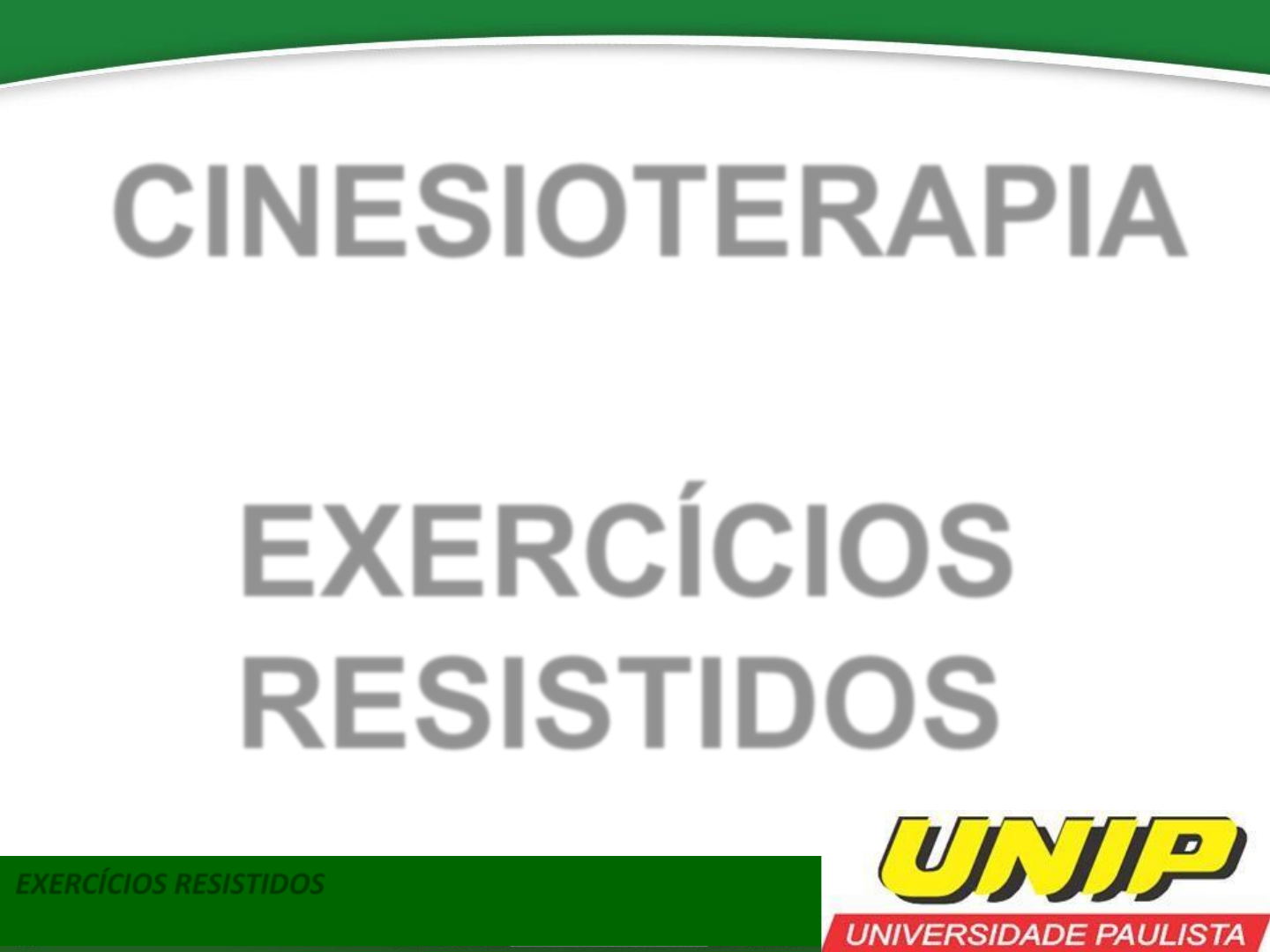 CINESIOTERAPIA EXERCÍCIOS RESISTIDOS Prof. Dr. Rubens dos Santos Rosa EXERCÍCIOS RESISTIDOS CONCEITO Aplicação de uma força externa a um braço de alavanca do corpo para opor a uma força de contração muscular. Pela ação da força oposta, aumenta a tensão no interior do músculo EXERCÍCIOS RESISTIDOS OU TREINAMENTO RESISTIDO É qualquer forma de exercício ativo no qual uma: contração muscular dinâmica (concêntrica /excêntrica) ou estática (isométrica) é resistida por uma força externa, aplicada manual ou mecanicamente. na maioria das vezes as resistências são pesos realizados contra uma resistência graduável (AMERICAN COLLEGE OF SPORTS MEDICINE 2009, KISNER e COLBY, 2009) EXERCÍCIOS RESISTIDOS OU TREINAMENTO RESISTIDO A força externa dos exercícios resistidos pode ser: ✓O próprio peso do segmento corporal, ✓Força da gravidade, ✓Resistência manual (do terapeuta ou de si próprio), ✓Pesos externos , ✓Elásticos, ✓Molas. EXERCÍCIOS RESISTIDOS OU TREINAMENTO RESISTIDO Os exercícios são considerados parte integrante dos atuais programas de condicionamento físico e reabilitação, principalmente para adultos e idosos. Estes exercícios favorecem a melhora da: ✓ Força e resistência muscular, ✓ Mantém e melhoram a massa corporal magra (POLLOCK et al., 1998; KISNER, 1992; SANTAREM, 1999; MONTEIRO, 1997; BARBOSA et al., 2000), ✓ Melhora a coordenação, ✓ Melhora a velocidade de reação, ✓ Melhora a velocidade, ✓ Melhora o equilíbrio, ✓ Previne e trata lesões e deficiências físicas (PEARL, 1996). EXERCÍCIOS RESISTIDOS OU TREINAMENTO RESISTIDO Para que todos esses benefícios sejam atingidos é preciso que o treinamento seja fundamentado em princípios científicos e pedagógicos. (KISNER, 1992; PEARL, 1996; FLECK et al., 1999; POLLOCK et al., 1986; SANTAREM, 1985; 1999; ANDERSON et al., 1995; LEIGTHON, 1987WIRHED, 1986; MONTEIRO, 1997; SHARKEY, 1998; CAILLIET, 1974). Uma vez compreendidos são os responsáveis pela autonomia do terapeuta-treinador em poder criar suas próprias metodologias de treinamento baseado nos conhecimentos até então existentes. EXERCÍCIOS RESISTIDOS OU TREINAMENTO RESISTIDO EXERCÍCIOS COM RESISTENCIA MECÂNICA Definição Qualquer forma de exercício em que a resistência (carga do exercício) é aplicada por algum tipo de equipamento Os termos mais usados são: ✓Treinamento resistido ✓Treinamento com pesos ✓Treinamento de força EXERCÍCIOS RESISTIDOS OU TREINAMENTO RESISTIDO MECANICAMENTE Características É um componente integral da reabilitação, e dos programas de condicionamento para pessoas de todas as idades É utilizado para eliminar ou reduzir déficits de: força-potência-resistência muscular à fadiga EXERCÍCIOS RESISTIDOS OU TREINAMENTO RESISTIDO MECANICAMENTE Vantagens ✓Estabelece uma média basal quantitativa do desempenho muscular ✓ São mais apropriados durante a fase intermediária e avançada da reabilitação quando o grau de força muscular é 4/5. ✓Podem ser usadas cargas de exercícios maiores ✓ Os aumentos nos níveis de resistência podem ser incrementados e quantitativamente documentados ✓A melhora efetiva é uma fonte de motivação para o paciente ✓São úteis para melhorar a força muscular estática e dinâmica ✓Acrescentam variedade a uma programa de exercício resistido ✓São práticos para melhorar a resistência muscular à fadiga ✓Alguns equipamentos fornecem resistência variável ao longo da ADM ✓O treinamento resistido de alta velocidade é possível ✓São apropriados para exercício independente em um programa domiciliar, após a supervisão do terapeuta EXERCÍCIOS RESISTIDOS OU TREINAMENTO RESISTIDO MECANICAMENTE Desvantagens ✓ Não são apropriados quando o músculo está muito fraco ou quando os tecidos estão em estágio muito precoces de cicatrização ✓ Os equipamentos fornecem resistência externa constante colocam carga máxima no músculo em apenas um ponto da ADM ✓Gasto com compra e manutenção dos equipamentos EXERCÍCIOS RESISTIDOS OU TREINAMENTO RESISTIDO MECANICAMENTE BRODY e HALL (2012) TIPOS DE EXERCÍCIOS RESISTIDOS MECANICAMENTE TIPOS DE EXERCÍCIOS RESISTIDOS MECANICAMENTE TIPOS DE EXERCÍCIOS RESISTIDOS MECANICAMENTE EXERCÍCIOS COM RESISTENCIA MANUAL Definição É uma forma de exercício ativo resistido A força e a resistência é aplicada pelo fisioterapeuta contra uma contração dinâmica ou estática EXERCÍCIOS RESISTIDOS OU TREINAMENTO RESISTIDO MANUALMENTE Características ✓Quando o movimento articular é permitido, a resistência é geralmente aplicada ao longo da ADM disponível ✓Os exercícios são feitos nos planos anatômicos de movimento ✓ Um músculo específico também pode ser fortalecido resistindo-se à sua ação ✓Nos programas de reabilitação, o exercícios resistido, pode vir antes dos exercícios ativos-assistidos e ativos EXERCÍCIOS RESISTIDOS OU TREINAMENTO RESISTIDO MANUALMENTE Considerações especiais para o fisioterapeuta ✓ Escolha uma maca de tratamento adequada para posicionar o paciente ✓A maca deve ter a altura apropriada ou se for o caso ajuste a altura da maca ✓Favorecer o uso de uma mecânica corporal correta ✓ Posicione-se perto do paciente para evitar sobre carga em sua coluna lombar e maximizar o controle dos MMSS e MMII do paciente ✓Use uma base de apoio alargada para manter uma postura estável enquanto a resistência manual é aplicada. EXERCÍCIOS RESISTIDOS OU TREINAMENTO RESISTIDO MANUALMENTE Vantagens ✓ São mais efetivos durante os estágios iniciais da reabilitação quando os músculos ainda estão fracos (grau de força menor que 4/5) ✓São forma efetivas de exercícios de transição dos movimentos assistidos para mecanicamente resistidos ✓A resistência é graduada de forma mais precisa do que a resistência mecânica ✓A resistência é ajustada ao longo da ADM ✓ O músculo trabalha de forma máxima em todas as porções