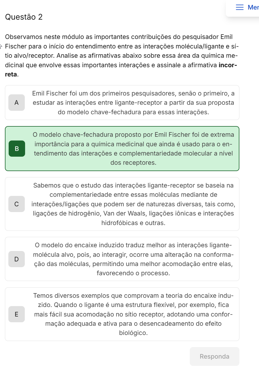 Mer Questão 2 Observamos neste módulo as importantes contribuições do pesquisador Emil Fischer para início do entendimento entre as interações molécula/ligante e sí- tio alvo/receptor. Analise as afirmativas abaixo sobre essa área da química me- dicinal que envolve essas importantes interações e assinale a afirmativa incor- reta. Emil Fischer foi um dos primeiros pesquisadores, senão primeiro, a A estudar as interações entre ligante-receptor a partir da sua proposta do modelo chave-fechadura para essas interações. modelo chave-fechadura proposto por Emil Fischer foi de extrema importância para a química medicinal que ainda é usado para en- tendimento das interações e complementariedade molecular a nível dos receptores. Sabemos que estudo das interações ligante-receptor se baseia na entre essas moléculas mediante de C interações/ligações que podem ser de naturezas diversas, tais como, ligações de hidrogênio, Van der Waals, ligações iônicas e interações hidrofóbicas e outras. modelo do encaixe induzido traduz melhor as interações ligante- molécula alvo, pois, ao interagir, ocorre uma alteração na conforma- D ção das moléculas, permitindo uma melhor acomodação entre elas, favorecendo processo. Temos diversos exemplos que comprovam a teoria do encaixe indu- zido. Quando ligante é uma estrutura flexível, por exemplo, fica E mais fácil sua acomodação no sítio receptor, adotando uma confor- mação adequada e ativa para desencadeamento do efeito biológico. Responda