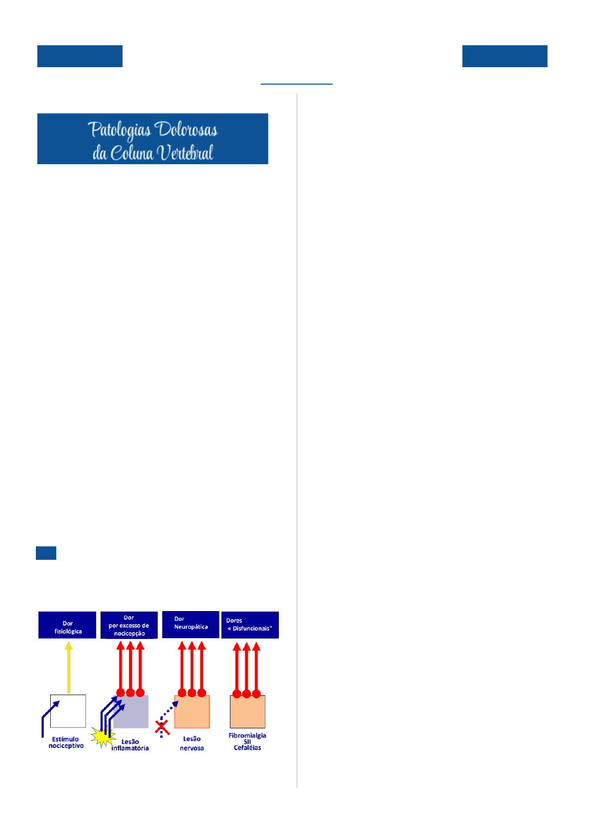Samara e Sarah | @fisios.tododia Fisi�t�a�ia d� A�ar��h� L�c�m�t� 8º semestre -06.08.2024- Lombalgia e cervicalgia não são diagnósticos, mas sim queixas. É importante especificar a causa, como, por exemplo: lombalgia inespecífica, por osteoartrose, por trauma ou por crise de hérnia de disco. Lombalgia/cervicalgia inespecífica é uma condição que geralmente dura até duas semanas e pode ocorrer sem um fator causador claro, podendo estar relacionada a múltiplos fatores. O estresse emocional, por sua vez, é uma causa frequente de cervicalgia. Uma hérnia de disco nem sempre é a responsável pela dor, o que pode resultar em erros médicos devido à falta de uma avaliação adequada e ao uso excessivo de exames de imagem, levando a cirurgias desnecessárias. A dor é causada pela inflamação resultante da compressão, e não pela hérnia em si. Dor É uma experiência sensitiva e emocional desgaradavel associada ou descrita em termos de lesão tecidual. Dor fisiológica: é uma resposta normal do corpo a lesões ou ameaças à integridade física. Geralmente é temporária e desaparece à medida que o corpo se cura. É um mecanismo de proteção essencial, pois nos impede de repetir comportamentos que podem causar mais danos. Dor nociceptiva: causada por condições ou lesões inflamatórias, resulta na liberação de substâncias nociceptivas inflamatórias, levando a uma resposta reacional periférica. Dor neuropática: é um tipo de dor que ocorre devido a lesões nos nervos, como aquelas que podem ocorrer em pessoas amputadas. Dores disfuncionais/nociplásticas: esse tipo de dor está associado a um desarranjo no processamento central da dor, como ocorre em condições como fibromialgia e cefaleias. Essas dores resultam de alterações na modulação das vias centrais que interpretam a dor, envolvendo áreas importantes do encéfalo. - Sem componente periférico; - Dores agudas podem evoluir para esse tipo, especialmente quando se tornam crônicas - O tratamento é mais complexo Dor mista: é um tipo de dor que combina características de dor nociceptiva e dor neuropática. Exemplo: Cervicobraquialgia, lombociatalgia e dor oncológica Lombociatalgia: dor lombar irradiada para o trajeto do nervo ciático; Ciatalgia: se não houver dor relatada na região lombar, apenas no trajeto do nervo ciático 1 Samara e Sarah | @fisios.tododia Fisi�t�a�ia d� A�ar��h� L�c�m�t� 8º semestre Cervicobraquialgia: dor cervical irradiada para MS Paciente com queixas bilaterais e com a mesma característica de sintomas deve-se investigar se o problema é central, na coluna. Sintomas concomitantes significativos - Dificuldade para dormir - Falta energia - Sonolência - Dificuldades em concentração - Depressão - Ansiedade - Apetite diminuído Esse aspecto biopsicossocial pode indicar que a dor é nociplástica. Causas - Doenças degenerativas (osteoartorse - sobreuso) - Doenças inflamatórias - Doenças traumáticas - Infecções - tumores - Osteoporose: em si não causa dor, mas o pcte em fase avançada tem fx e gera dor - Postura inadequada: sobrecarga postural - Lesões dos tecidos moles (mm, ligamentos e tendões) Tratamento - Depende da patologia de base - O repouso não é indicado, pois leva a restrição da participação social, levando muitas vezes a piora do quadro; A depender do caso, como em crise de dor por compressão discal, indica-se o repouso, mas em situações extremas - Medicação (antiinflamatório, analgésio, miorelaxantes) - Programas de fisioterapia - Cirurgia: a depender da situação, mas deve-se tentar a reabilitação antes por meio de atividade física O paciente geralmente experimenta um pico de dor durante a crise. Após esse período, entra em remissão, que é o momento ideal para manter uma boa qualidade de vida, incluindo a prática de exercícios físicos. Com o tempo, os picos de dor podem ocorrer com mais frequência, especialmente se bons hábitos não forem adotados. O tempo necessário para sair do pico de dor varia de pessoa para pessoa e depende da causa subjacente da dor. Embora a remissão possa ser acelerada com o uso de medicamentos, é importante notar que pode haver casos em que a remissão demore mais a acontecer, mesmo com tratamento. Boas práticas/ evidências de práticas para dores musculoesqueléticas - Cuidado centrado no paciente - Rastrear fatores psicossociais - Realizar exame físico - Monitorar progresso do pcte - Fornecer educação, informação, exercícios e atividade física - Terapia manual é coadjuvante de outros tratamentos - Oferecer cuidados não cirúrgicos de alta qualidade antes da cirurgia - Manter os pctes no trabalho Patologias dolorosas da coluna: HÉRNIAS DE DISCO Hérnia: O núcleo pulposo pode se deslocar da região central, seja total ou parcialmente. Esse deslocamento pode causar compressão nos nervos, especialmente se ocorrer para a parte posterior, podendo até comprimir a 2 Samara e Sarah | @fisios.tododia Fisi�t�a�ia d� A�ar��h� L�c�m�t� 8º semestre medula espinhal. Essa compressão desencadeia um processo inflamatório, que, por sua vez, resulta em dor. Disco vertebral: Absorve e distribui carga, com força axial (de cima para baixo) que dissipa a carga para coluna e MMII. O chão, por sua vez, empurra a carga de baixo para cima, ou seja, dos MMII para a coluna, que também é responsável pela dissipação dessa força. Centro: O centro da coluna intervertebral é composto pelo núcleo pulposo e pelo anel fibroso, que mantém o núcleo em sua posição central. O núcleo se movimenta de acordo com os movimentos da coluna: na extensão, tende a se deslocar para frente, sendo controlado pela ação do anel fibroso, que impede o deslocamento excessivo. Na flexão, o núcleo se move para trás, sendo novamente contido pelo anel. Durante a rotação à direita, o núcleo tende a se deslocar para a esquerda, mas o anel também segura 
