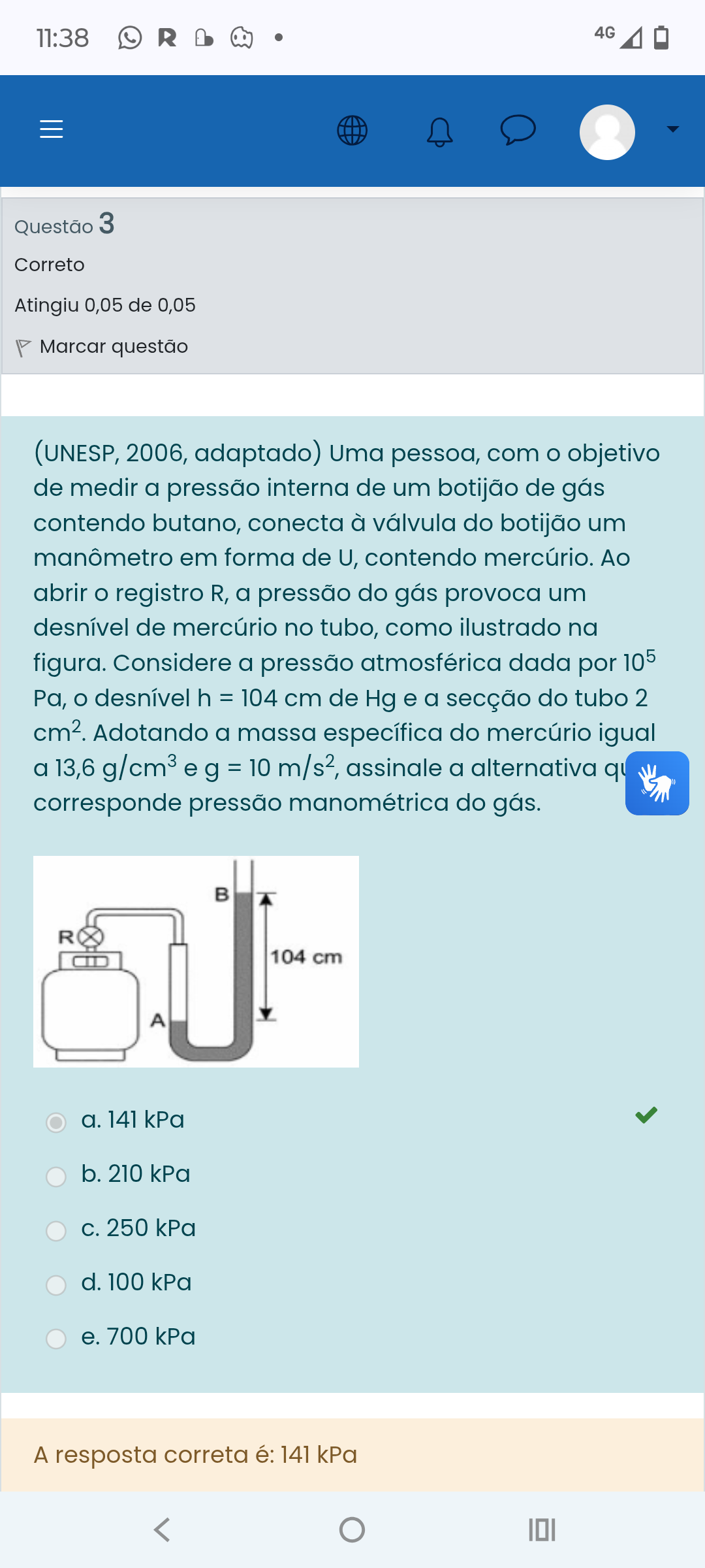 11:38 R 4G Questão 3 Correto Atingiu 0,05 de 0,05 Marcar questão (UNESP, 2006, adaptado) Uma pessoa, com objetivo de medir a pressão interna de um botijão de gás contendo butano, conecta à válvula do botijão um manômetro em forma de U, contendo mercúrio. abrir registro R, a pressão do gás provoca um desnível de mercúrio no tubo, como ilustrado na figura. Considere a pressão atmosférica dada por 10⁵ Pa, desnível h = 104 cm de Hg e a secção do tubo 2 cm². Adotando a massa específica do mercúrio igual a 13,6 g/cm³ e g = 10 assinale a alternativa qu corresponde pressão manométrica do gás. R 104 cm A a. 141 kPa b. 210 kPa 250 kPa d. 100 kPa e. 700 kPa resposta correta é: 141 kPa