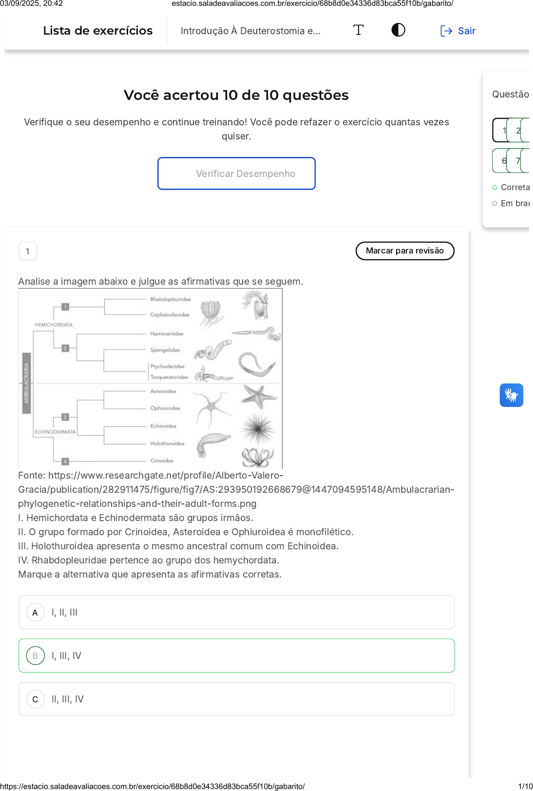 Você acertou 10 de 10 questões Verifique o seu desempenho e continue treinando! Você pode refazer o exercício quantas vezes quiser. Verificar Desempenho A B C 1 Marcar para revisão Analise a imagem abaixo e julgue as afirmativas que se seguem. Fonte: https://www.researchgate.net/profile/Alberto-Valero- Gracia/publication/282911475/figure/fig7/AS:293950192668679@1447094595148/Ambulacrarian- phylogenetic-relationships-and-their-adult-forms.png I. Hemichordata e Echinodermata são grupos irmãos. II. O grupo formado por Crinoidea, Asteroidea e Ophiuroidea é monofilético. III. Holothuroidea apresenta o mesmo ancestral comum com Echinoidea. IV. Rhabdopleuridae pertence ao grupo dos hemychordata. Marque a alternativa que apresenta as afirmativas corretas. I, II, III I, III, IV II, III, IV Questão Correta Em bran 1 2 6 7 Lista de exercícios Introdução À Deuterostomia e… Sair 03/09/2025, 20:42 estacio.saladeavaliacoes.com.br/exercicio/68b8d0e34336d83bca55f10b/gabarito/ https://estacio.saladeavaliacoes.com.br/exercicio/68b8d0e34336d83bca55f10b/gabarito/ 1/10 D E A B C I, II, IV III, IV Resposta correta Parabéns, você selecionou a alternativa correta. Confira o gabarito comentado! Gabarito Comentado O grupo formado por Crinoidea, Asteroidea e Ophiuroidea é polifilético. Percebam que, além da distância entre os clados, existem outros ancestrais comuns ao longo do processo. 2 Marcar para revisão Durante um registro de fotografias subaquáticas, um mergulhador observou um grupo de pequenos indivíduos parecidos com plantas, sendo devorados por algumas tartarugas que se aproximavam do recife onde se encontravam. Analisando mais de perto o resultado da predação, o mergulhador ficou em dúvida se aquela população teria sido reduzida drasticamente da região. Fonte: https://www.shutterstock.com/pt/image-photo/feather-stars-on-tropical-coral-reef- 220756984 Observe a imagem fotográfica tirada antes do processo predatório e marque a alternativa que apresenta o destino dessa população destes seres vivos, ou seja, se haverá redução drástica da população, morte ou regeneração. Será reduzida, já que ao se alimentar dessas estruturas, as tartarugas comem os pontos não regenerativos de alguns crinoides. Essas estruturas são cnidários, antozoários, que apresentam grande capacidade regenerativa, portanto não sofrerão redução. Como esses indivíduos foram predados e seus corpos concentram-se nestas estruturas tentaculares, eles vão acabar morrendo. 03/09/2025, 20:42 estacio.saladeavaliacoes.com.br/exercicio/68b8d0e34336d83bca55f10b/gabarito/ https://estacio.saladeavaliacoes.com.br/exercicio/68b8d0e34336d83bca55f10b/gabarito/ 2/10 D E A B C D E Os crinoides da foto não terão sua população reduzida. Eles apresentam capacidade de regeneração de seus braços. Com isso, em pouco tempo, estarão regenerados. Estes seres são poliquetas tubulares que se encontram desprotegidos fora de seus tubos. Por isso, foram predados e sua população será reduzida. Resposta correta Parabéns, você selecionou a alternativa correta. Confira o gabarito comentado! Gabarito Comentado Na imagem observamos equinodermos crinoides. Eles apresentam grande capacidade regenerativa, podendo recuperar suas estruturas perdidas, como os braços em forma de plumas que se assemelham às plantas. 3 Marcar para revisão (IFBA/2010 - adaptada) O IBGE elaborou um mapa que localiza as 238 espécies e subespécies aquáticas em risco de extinção no território brasileiro. O mapa revela que 79 espécies ameaçadas são invertebrados aquáticos, como estrelas e ouriços-do-mar. As outras 159 englobam peixes de água doce e salgada. Segundo o levantamento, São Paulo é o estado com mais espécies em risco de extinção, seguido de Rio de Janeiro, Rio Grande do Sul e Bahia. Os principais fatores são: a destruição dos habitats dos animais, a poluição e a pesca indiscriminada. (IBGE 2009, p.17). IBGE, Fauna Ameaçada de Extinção - Invertebrados Aquáticos e Peixes. Rio de Janeiro: IBGE. 2009. Sobre os equinodermos, grupo do qual fazem parte estrelas e ouriços-do-mar, marque a alternativa correta. A maioria dos indivíduos adultos apresentam simetria bilateral, enquanto as larvas apresentam simetria pentarradial. Os machos inserem suas gônadas no interior dos ovários das fêmeas realizando, assim, a fecundação interna. Os equinodermos são animais exclusivamente marinhos e possuem sistema hidrovascular relacionado com a captura de alimento e a locomoção. A reprodução desses animais é basicamente assexuada e o desenvolvimento é direto. As estrelas e os ouriços-do-mar são animais estritamente herbívoros, alimentando-se de algas presentes no plâncton. 03/09/2025, 20:42 estacio.saladeavaliacoes.com.br/exercicio/68b8d0e34336d83bca55f10b/gabarito/ https://estacio.saladeavaliacoes.com.br/exercicio/68b8d0e34336d83bca55f10b/gabarito/ 3/10 A B C D E Resposta correta Parabéns, você selecionou a alternativa correta. Confira o gabarito comentado! Gabarito Comentado Os equinodermos são animais exclusivamente marinhos e possuem sistema hidrovascular relacionado com a captura de alimento e a locomoção. Podem apresentar, quando adultos, simetria pentarradial e têm o estágio larval bilateral. A fertilização neste grupo será sempre externa. Fazem reprodução tanto assexuada quanto sexuada. Apresentam desenvolvimento indireto, mas também pode ocorrer a incubação com desenvolvimento direto. As estrelas-do- mar são predadores oportunistas, se alimentando de outros animais e também de carniça. 4 Marcar para revisão Registros fósseis indicam que Hemichordata Enteropneustas mantinham uma relação simbiótica com vermes anelídeos poliquetos, vivendo nos mesmos canais e trocando favores entre si. Para conseguir separar os dois indivíduos habitantes de tubos, os pesquisadores deveriam observar, principalmente a estrutura corporal do enteropneusta dividida em prossoma, mesossoma e metassoma.