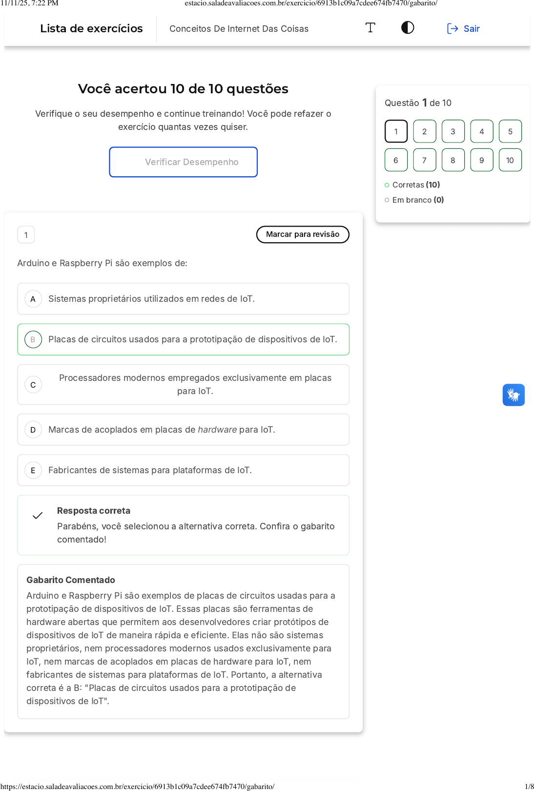 Você acertou 10 de 10 questões Verifique o seu desempenho e continue treinando! Você pode refazer o exercício quantas vezes quiser. Verificar Desempenho A B C D E 1 Marcar para revisão Arduino e Raspberry Pi são exemplos de: Sistemas proprietários utilizados em redes de IoT. Placas de circuitos usados para a prototipação de dispositivos de IoT. Processadores modernos empregados exclusivamente em placas para IoT. Marcas de acoplados em placas de hardware para IoT. Fabricantes de sistemas para plataformas de IoT. Resposta correta Parabéns, você selecionou a alternativa correta. Confira o gabarito comentado! Gabarito Comentado Arduino e Raspberry Pi são exemplos de placas de circuitos usadas para a prototipação de dispositivos de IoT. Essas placas são ferramentas de hardware abertas que permitem aos desenvolvedores criar protótipos de dispositivos de IoT de maneira rápida e eficiente. Elas não são sistemas proprietários, nem processadores modernos usados exclusivamente para IoT, nem marcas de acoplados em placas de hardware para IoT, nem fabricantes de sistemas para plataformas de IoT. Portanto, a alternativa correta é a B: "Placas de circuitos usados para a prototipação de dispositivos de IoT". Questão 1 de 10 Corretas (10) Em branco (0) 1 2 3 4 5 6 7 8 9 10 Lista de exercícios Conceitos De Internet Das Coisas Sair 11/11/25, 7:22 PM estacio.saladeavaliacoes.com.br/exercicio/6913b1c09a7cdee674fb7470/gabarito/ https://estacio.saladeavaliacoes.com.br/exercicio/6913b1c09a7cdee674fb7470/gabarito/ 1/8 A B C D E A B C 2 Marcar para revisão Marque a opção que não representa uma plataforma de IoT: Salesforce IoT Cloud Arduino NANO 33 IoT Arduino Cloud IoT IBM Watson IoT platform Cisco IoT Cloud Connect Resposta correta Parabéns, você selecionou a alternativa correta. Confira o gabarito comentado! Gabarito Comentado A alternativa correta é o Arduino NANO 33 IoT. Embora o Arduino NANO 33 IoT seja um hardware que suporta a Internet das Coisas (IoT), ele não é uma plataforma de IoT em si. As plataformas de IoT, como Salesforce IoT Cloud, Arduino Cloud IoT, IBM Watson IoT platform e Cisco IoT Cloud Connect, são sistemas operacionais que permitem a interação entre dispositivos IoT, facilitando a coleta, o armazenamento e a análise de dados. 3 Marcar para revisão No contexto da plataforma de IoT do Google, provisionamento significa ... Processo de segurança destinado a detectar dispositivos com baixa performance. Processo de entrega dos serviços adquiridos na plataforma. Processo de envio de mensagens de controle para os dispositivos. 11/11/25, 7:22 PM estacio.saladeavaliacoes.com.br/exercicio/6913b1c09a7cdee674fb7470/gabarito/ https://estacio.saladeavaliacoes.com.br/exercicio/6913b1c09a7cdee674fb7470/gabarito/ 2/8 D E A B C D E Processo de adoção/registro dos equipamentos até que eles estejam prontos para uso. Processo de registro dos sensores em outras plataformas de IoT. Resposta correta Parabéns, você selecionou a alternativa correta. Confira o gabarito comentado! Gabarito Comentado O termo "provisionamento", no contexto da plataforma de IoT do Google, refere-se ao processo de adoção ou registro dos equipamentos até que eles estejam prontos para uso. Isso significa que, antes de um dispositivo poder ser usado na plataforma, ele precisa passar por um processo de configuração e registro, que é o que chamamos de provisionamento. Portanto, a alternativa D é a correta. 4 Marcar para revisão Considere o protocolo HTTP/HTTPS. Qual das alternativas abaixo está incorreta? Implementa filas por tópicos. HTTP é considerado inseguro. É um protocolo que não guarda estados (stateless communication). Funciona por meio de requisições e respostas (requests, responses) sob a camada TCP. O HTTPS é uma extensão de segurança do protocolo HTTP. Resposta correta Parabéns, você selecionou a alternativa correta. Confira o gabarito comentado! Gabarito Comentado A alternativa A está incorreta porque o protocolo HTTP/HTTPS não implementa filas por tópicos. O HTTP/HTTPS é um protocolo de transferência de hipertexto que é usado para transferir dados na web. Ele não tem a funcionalidade de implementar filas por tópicos. As outras alternativas estão corretas: o HTTP é considerado inseguro, o protocolo 11/11/25, 7:22 PM estacio.saladeavaliacoes.com.br/exercicio/6913b1c09a7cdee674fb7470/gabarito/ https://estacio.saladeavaliacoes.com.br/exercicio/6913b1c09a7cdee674fb7470/gabarito/ 3/8 A B C D E A B não guarda estados, funciona por meio de requisições e respostas sob a camada TCP e o HTTPS é uma extensão de segurança do protocolo HTTP. 5 Marcar para revisão Assinale a alternativa incorreta sobre a plataforma da Microsoft para IoT. A autenticação e a autorização são feitas pelo módulo active directory. O módulo DocumentDB armazena os metadados, enquanto o módulo LogicApp faz a integração com sistemas de backend. O módulo IoT Hub suporta os protocolos de comunicação MQTT, HTTP/HTTPS e AMQP. Não há limites para o número de dispositivos que pode gerenciar. É a plataforma líder de mercado e possui a maior variedade de oferta de serviços. Resposta correta Parabéns, você selecionou a alternativa correta. Confira o gabarito comentado! Gabarito Comentado A alternativa E é a incorreta. Embora a plataforma da Microsoft para IoT seja uma das mais robustas e completas do mercado, não é correto afirmar que ela é a líder de mercado e possui a maior variedade de oferta de serviços. Existem outras plataformas, como a AWS IoT e a Google Cloud IoT, que também possuem uma ampla gama de serviços e competem diretamente com a Microsoft no mercado de IoT. 6 Marcar para revisão Assinale a opção incorreta sobre a placa ESP8266. Possui capacidade de comunicação wi-fi nativa. Possui um processador RISK denominado Tensilica. 11/11/25, 7:22 PM estacio.saladeavaliacoes.com.br/exercicio/6913b1c09a7cdee674fb7470/gabarito/ https://estacio.saladeavaliacoes.