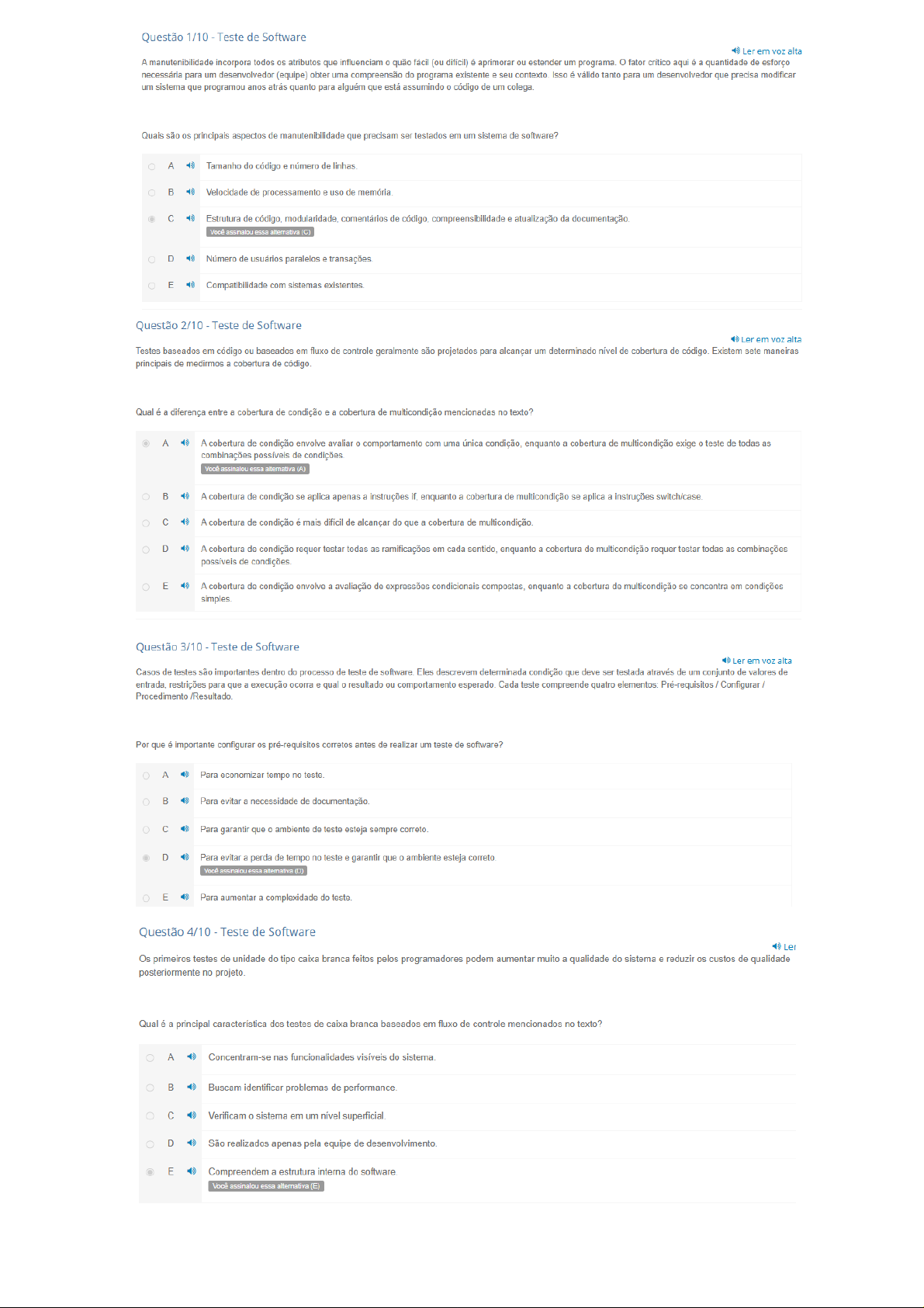 Questão 1/10 - Teste de Software Ler em voz alta A manutenibilidade incorpora todos atributos que influenciam 0 quão fácil (ou difícil) é aprimorar ou estender um programa. fator crítico aqui é a quantidade de esforço necessária para um desenvolvedor (equipe) obter uma compreensão do programa existente e seu contexto. Isso é válido tanto para um desenvolvedor que precisa modificar um sistema que programou anos atrás quanto para alguém que está assumindo 0 código de um colega. Quais são principais aspectos de manutenibilidade que precisam ser testados em um sistema de software? A Tamanho do código e número de Velocidade de processamento e uso de memória. Estrutura de código, modularidade, comentários de código, compreensibilidade e atualização da documentação. Você assinalou essa alternativa (C) D Número de usuários paralelos e transações. E Compatibilidade com sistemas existentes. Questão 2/10 - Teste de Software Ler em voz alta Testes baseados em código ou baseados em fluxo de controle geralmente são projetados para alcançar um determinado nível de cobertura de código. Existem sete maneiras principais de medirmos a cobertura de código. Qual é a diferença entre a cobertura de condição e a cobertura de multicondição mencionadas no texto? A A cobertura de condição envolve avaliar comportamento com uma única condição, enquanto a cobertura de multicondição exige 0 teste de todas as combinações possíveis de condições. Você assinalou essa alternativa (A) A cobertura de condição se aplica apenas a instruções if, enquanto a cobertura de multicondição se aplica a instruções A cobertura de condição é mais difícil de alcançar do que a cobertura de A cobertura de condição requer testar todas as ramificações em cada sentido, enquanto a cobertura de multicondição requer testar todas as combinações possíveis de condições. E A cobertura de condição envolve a avaliação de expressões condicionais compostas, enquanto a cobertura de multicondição se concentra em condições simples. Questão 3/10 Teste de Software Ler em voz alta Casos de testes são importantes dentro do processo de teste de software. Eles descrevem determinada condição que deve ser testada através de um conjunto de valores de entrada, restrições para que a execução ocorra e qual 0 resultado ou comportamento esperado. Cada teste compreende quatro elementos: Pré-requisitos / Configurar Procedimento Por que é importante configurar os pré-requisitos corretos antes de realizar um teste de software? A Para economizar tempo no teste. Para evitar a necessidade de documentação. Para garantir que 0 ambiente de teste esteja sempre D Para evitar a perda de tempo no teste e garantir que 0 ambiente esteja correto. Você assinalou essa alternativa E Para aumentar a complexidade do teste. Questão 4/10 Teste de Software Ler Os primeiros testes de unidade do tipo caixa branca feitos pelos programadores podem aumentar muito a qualidade do sistema e reduzir custos de qualidade posteriormente no projeto. Qual é a principal característica dos testes de caixa branca baseados em fluxo de controle mencionados no texto? A Concentram-se nas funcionalidades visíveis do Buscam identificar problemas de C Verificam 0 sistema em um nível superficial. D São realizados apenas pela equipe de desenvolvimento. E Compreendem a estrutura interna do software. Você assinalou essa alternativa (E)Questão 5/10 Teste de Software Ler em voz alta Os testes não funcionais são testes que verificam várias características de um software, e não precisamos compreender as regras de negócio. Tais testes complementam os testes funcionais e outros. que são requisitos não funcionais em relação a um sistema de software? A São os requisitos que descrevem como 0 sistema deve se comportar em relação a características como desempenho, segurança e usabilidade. Você assinalou essa alternativa (A) São os requisitos que descrevem as regras de negócio do sistema. São os requisitos que definem a funcionalidade principal do sistema. D São os requisitos que detalham as etapas do desenvolvimento do E São os requisitos que descrevem as interações do sistema com outros sistemas. Questão 6/10 Teste de Software Ler em voz alta Os testes de regressão são uma prática crucial no desenvolvimento e manutenção de software, utilizados após alterações serem feitas em um sistema ou aplicativo. principal objetivo desses testes é assegurar um aspecto crítico do software antes que ele seja liberado para 0 próximo estágio do processo de lançamento ou para produção. Qual das seguintes opções melhor descreve esse objetivo primordial dos testes de regressão? A Otimização dos custos associados ao processo de teste. Detecção rápida de defeitos introduzidos por mudanças recentes. Confirmação de que as atualizações não comprometem a funcionalidade existente do Você assinalou essa alternativa (C) D Avaliação de recursos específicos que foram recentemente desenvolvidos ou modificados. E Realização eficiente de testes manuais ou agendados durante períodos fora do horário de pico. Questão 7/10 Teste de Software Ler em voz alta São várias técnicas de teste estático que diferem em sua profundidade, nos recursos que requerem (pessoas e tempo) e nos objetivos que perseguem. Qual das seguintes afirmações sobre as técnicas de teste estático está correta? A "Revisão" e "inspeção" são termos usados exclusivamente para descrever a análise estática de produtos de trabalho. "Revisão" é um termo geral para todas as técnicas de análise estática, enquanto "inspeção" se refere apenas à execução formal de um teste estático. Você assinalou essa alternativa (B) Todas as técnicas de teste estático são executadas por meio de ferramentas de automação. D A análise estática é a única técnica de teste estático mencionada no texto. E "Inspeção" é um ter