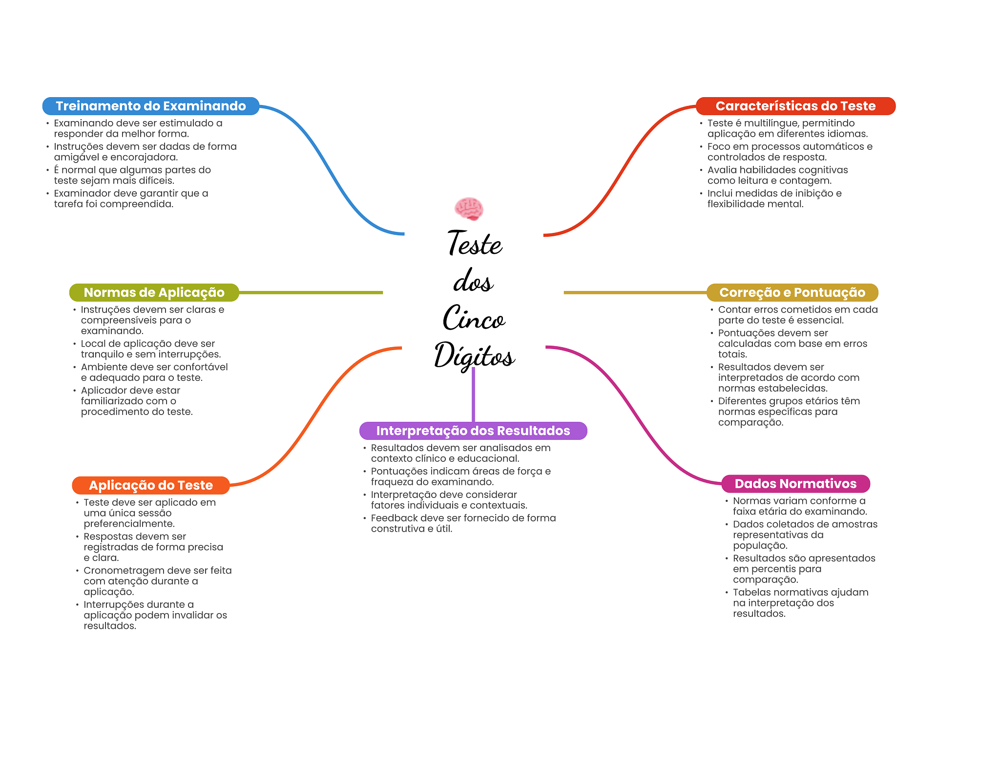 Treinamento do Examinando Características do Teste Examinando deve ser estimulado a Teste é multilíngue, permitindo responder da melhor forma. aplicação em diferentes idiomas. Instruções devem ser dadas de forma Foco em processos automáticos e amigável e encorajadora. controlados de resposta. É normal que algumas partes do Avalia habilidades cognitivas teste sejam mais difíceis. como leitura e contagem. Examinador deve garantir que a Inclui medidas de inibição e tarefa foi compreendida. flexibilidade mental. Teste dos Normas de Aplicação Correção e Pontuação Instruções devem ser claras e compreensíveis para Cinco Contar erros cometidos em cada parte do teste é essencial. examinando. Pontuações devem ser Local de aplicação deve ser calculadas com base em erros tranquilo e sem interrupções. Ambiente deve ser confortável totais. Resultados devem ser e adequado para teste. interpretados de acordo com Aplicador deve estar normas estabelecidas. familiarizado com Diferentes grupos etários têm procedimento do teste. normas específicas para comparação. Interpretação dos Resultados Resultados devem ser analisados em contexto clínico e educacional. Pontuações indicam áreas de força e Aplicação do Teste fraqueza do examinando. Dados Normativos Interpretação deve considerar Teste deve ser aplicado em fatores individuais e contextuais. Normas variam conforme a uma única sessão faixa etária do examinando. Feedback deve ser fornecido de forma preferencialmente. construtiva e útil. Dados coletados de amostras Respostas devem ser representativas da registradas de forma precisa população. e clara. Resultados são apresentados Cronometragem deve ser feita em percentis para com atenção durante a comparação. aplicação. Tabelas normativas ajudam Interrupções durante a na interpretação dos aplicação podem invalidar resultados. resultados.