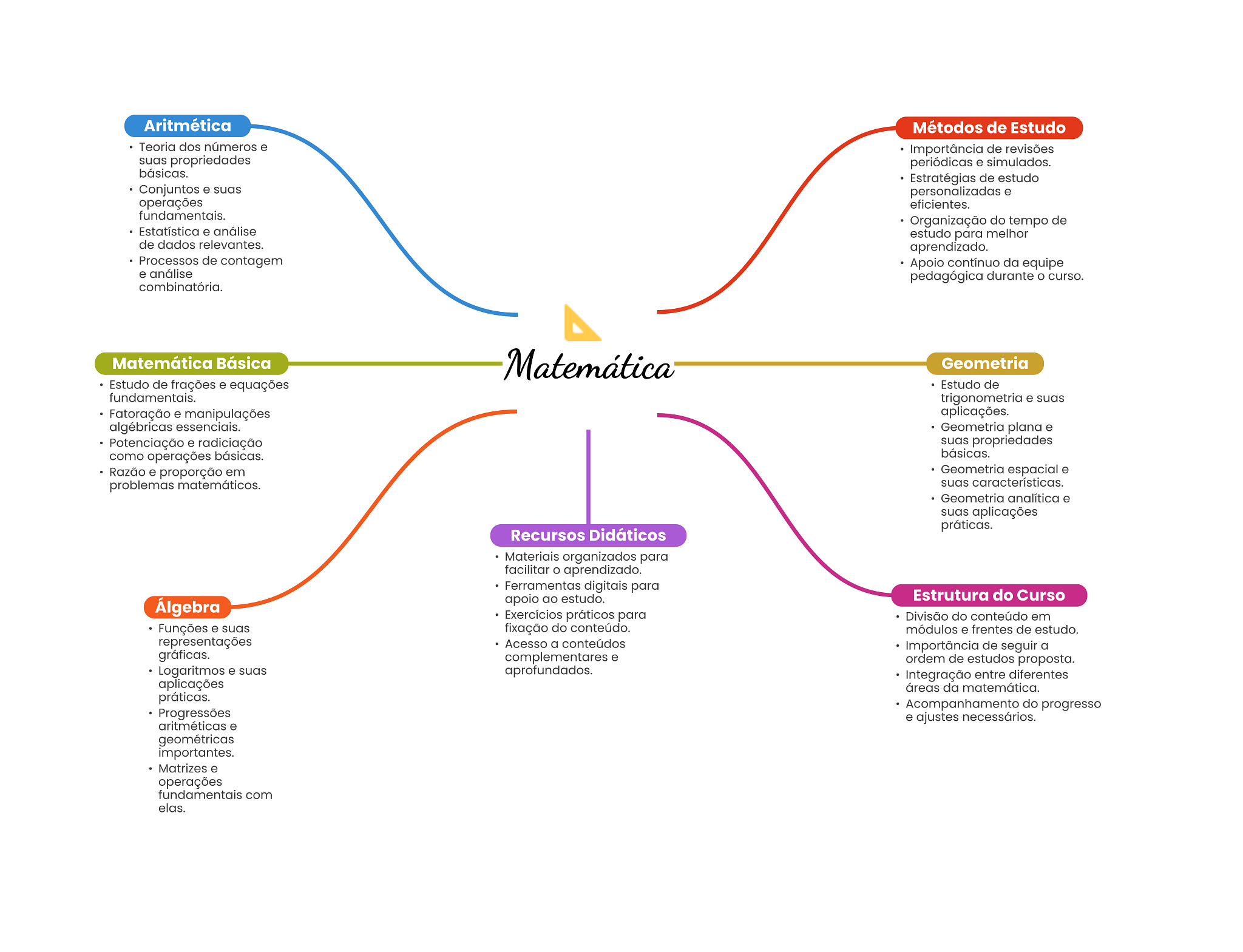 Aritmética Métodos de Estudo Teoria dos números e Importância de revisões suas propriedades periódicas e simulados. básicas. Estratégias de estudo Conjuntos e suas personalizadas e operações eficientes. fundamentais. Organização do tempo de Estatística e análise estudo para melhor de dados relevantes. aprendizado. Processos de contagem Apoio contínuo da equipe e análise pedagógica durante curso. combinatória. Matemática Básica Matemática Geometria Estudo de frações e equações Estudo de fundamentais. trigonometria e suas Fatoração e manipulações aplicações. algébricas essenciais. Geometria plana e Potenciação e radiciação suas propriedades como operações básicas. básicas. Razão e proporção em Geometria espacial e problemas matemáticos. suas características. Geometria analítica e suas aplicações práticas. Recursos Didáticos Materiais organizados para facilitar aprendizado. Ferramentas digitais para apoio ao estudo. Estrutura do Curso Álgebra Exercícios práticos para Divisão do conteúdo em Funções e suas fixação do conteúdo. módulos e frentes de estudo. representações Acesso a conteúdos Importância de seguir a gráficas. complementares e ordem de estudos proposta. Logaritmos e suas aprofundados. Integração entre diferentes aplicações áreas da matemática. práticas. Acompanhamento do progresso Progressões e ajustes necessários. aritméticas e geométricas importantes. Matrizes e operações fundamentais com elas.