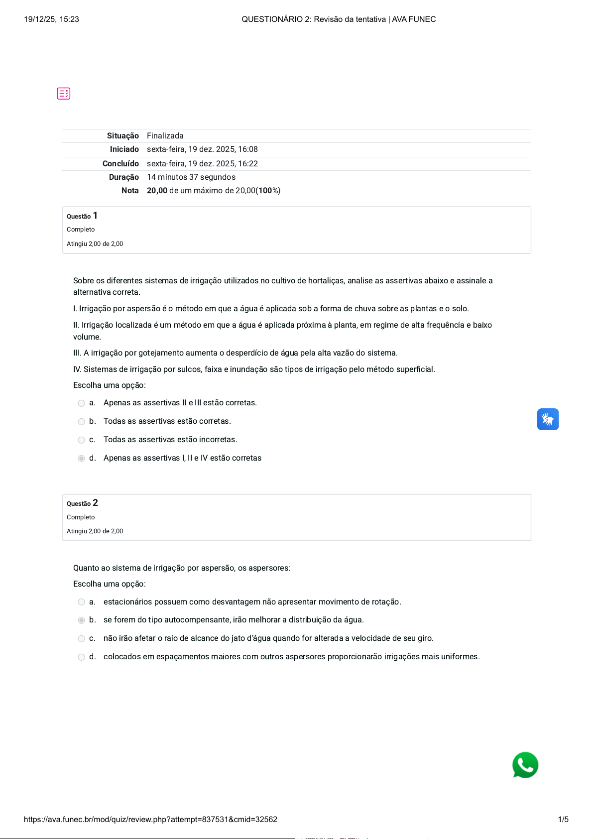 Situação Finalizada Iniciado sexta-feira, 19 dez. 2025, 16:08 Concluído sexta-feira, 19 dez. 2025, 16:22 Duração 14 minutos 37 segundos Nota 20,00 de um máximo de 20,00(100%) Questão 1 Completo Atingiu 2,00 de 2,00 Questão 2 Completo Atingiu 2,00 de 2,00 Sobre os diferentes sistemas de irrigação utilizados no cultivo de hortaliças, analise as assertivas abaixo e assinale a alternativa correta. I. Irrigação por aspersão é o método em que a água é aplicada sob a forma de chuva sobre as plantas e o solo. II. Irrigação localizada é um método em que a água é aplicada próxima à planta, em regime de alta frequência e baixo volume. III. A irrigação por gotejamento aumenta o desperdício de água pela alta vazão do sistema. IV. Sistemas de irrigação por sulcos, faixa e inundação são tipos de irrigação pelo método superficial. Escolha uma opção: a. Apenas as assertivas II e III estão corretas. b. Todas as assertivas estão corretas. c. Todas as assertivas estão incorretas. d. Apenas as assertivas I, II e IV estão corretas Quanto ao sistema de irrigação por aspersão, os aspersores: Escolha uma opção: a. estacionários possuem como desvantagem não apresentar movimento de rotação. b. se forem do tipo autocompensante, irão melhorar a distribuição da água. c. não irão afetar o raio de alcance do jato d’água quando for alterada a velocidade de seu giro. d. colocados em espaçamentos maiores com outros aspersores proporcionarão irrigações mais uniformes. 19/12/25, 15:23 QUESTIONÁRIO 2: Revisão da tentativa | AVA FUNEC https://ava.funec.br/mod/quiz/review.php?attempt=837531&cmid=32562 1/5 Questão 3 Completo Atingiu 2,00 de 2,00 Questão 4 Completo Atingiu 2,00 de 2,00 A irrigação localizada compreende os sistemas de irrigação nos quais a água é aplicada ao solo, diretamente sobre a região radicular, em pequenas intensidades, porém com alta frequência, de modo que mantenha a umidade do solo na zona radicular próxima à capacidade de campo. Sobre as principais vantagens da irrigação localizada, analisar os itens abaixo: I. Adaptação a diferentes tipos de solos e topografias. II. Maior eficiência no controle fitossanitário. III. Utilização com água salina ou em solos salinos. IV. Economia de mão de obra. Estão CORRETOS: Escolha uma opção: a. Somente os itens II e III. b. Todos os itens c. Somente os itens I, II e IV. d. Somente os itens I e IV. Com o clima cada vez mais instável e o crescimento cada vez maior da seca no estado do Paraná, muitas pessoas têm recorrido aos métodos de irrigação para auxiliar na produção. Existem diversos tipos de irrigação usados hoje na agricultura, relacione as colunas e assinale a alternativa com a sequência correta. 1. Irrigação superficial. 2. Irrigação por aspersão. 3. Irrigação localizada. ( ) O problema maior desse sistema é que ocorre um crescimento na quantidade de doenças na planta ( ) O método de irrigação mais assertivo, na maioria das vezes, é mais aplicado em culturas perenes e frutíferas. ( ) Existe um grande risco de erosão no solo devido à alta quantidade de água depositada no mesmo local. Escolha uma opção: a. 3 1 2 b. 1 2 3 c. 1 3 2 d. 2 3 1 19/12/25, 15:23 QUESTIONÁRIO 2: Revisão da tentativa | AVA FUNEC https://ava.funec.br/mod/quiz/review.php?attempt=837531&cmid=32562 2/5 Questão 5 Completo Atingiu 2,00 de 2,00 Questão 6 Completo Atingiu 2,00 de 2,00 O método de irrigação é a parte mais importante do processo, para que haja uma escolha correta, devem ser levados em consideração alguns fatores, sobre esses fatores, informe se é verdadeiro (V) ou falso (F) para o que se afirma e assinale a alternativa com a sequência correta. ( ) A declividade do terreno não é algo importante independentemente do método que será utilizado, o sistema se adequa ao tipo de solo. ( ) É muito importante conhecer o clima da região, para saber qual a necessidade real da irrigação. ( ) Mesmo que o local não tenha uma boa disponibilidade de água superficial, mas tenha a ocorrência de água no subsolo já é o suficiente. ( ) O tipo de solo e a velocidade de absorção da água é de suma importância para a aplicação do sistema. Escolha uma opção: a. FVFV b. FVVV c. FFFF d. VVVV A irrigação é uma tecnologia imprescindível no processo de aumento da produção de bens agrícolas, sendo a sua adoção dependente da disponibilidade hídrica de cada região. Leia atentamente as afirmativas a seguir sobre os principais métodos de irrigação. I- Na irrigação de subsuperfície ou subterrânea a água é aplicada abaixo da superfície do solo, dentro do volume explorado pelas raízes das plantas. II- Na irrigação localizada a aplicação da água é realizada em uma área extensa da superfície do solo, ultrapassando a área sombreada pela copa das plantas. III- A irrigação de superfície é quando se utiliza a superfície do solo de forma parcial ou total para a aplicação da água por ação da gravidade. IV- Na irrigação por aspersão a água é aplicada sobre a folhagem da cultura e acima do solo. Assinale a alternativa CORRETA. Escolha uma opção: a. Apenas as afirmativas II, III e IV estão corretas. b. As afirmativas I, II, III e IV estão corretas. c. Apenas as afirmativas I e IV estão corretas. d. Apenas as afirmativas I, III e IV estão corretas. 19/12/25, 15:23 QUESTIONÁRIO 2: Revisão da tentativa | AVA FUNEC https://ava.funec.br/mod/quiz/review.php?attempt=837531&cmid=32562 3/5 Questão 7 Completo Atingiu 2,00 de 2,00 Questão 8 Completo Atingiu 2,00 de 2,00 Questão 9 Completo Atingiu 2,00 de 2,00 Sobre o tema de irrigação e drenagem, assinale a alternativa correta. Escolha uma opção: a. Doenças – por conta da quantidade de água no sistema, a incidência de doenças e pragas diminui em grandes níveis. b. Salinidade – a quantidade de fertilizantes que são aplicados ao sistema aumenta a quantidade de sais. c