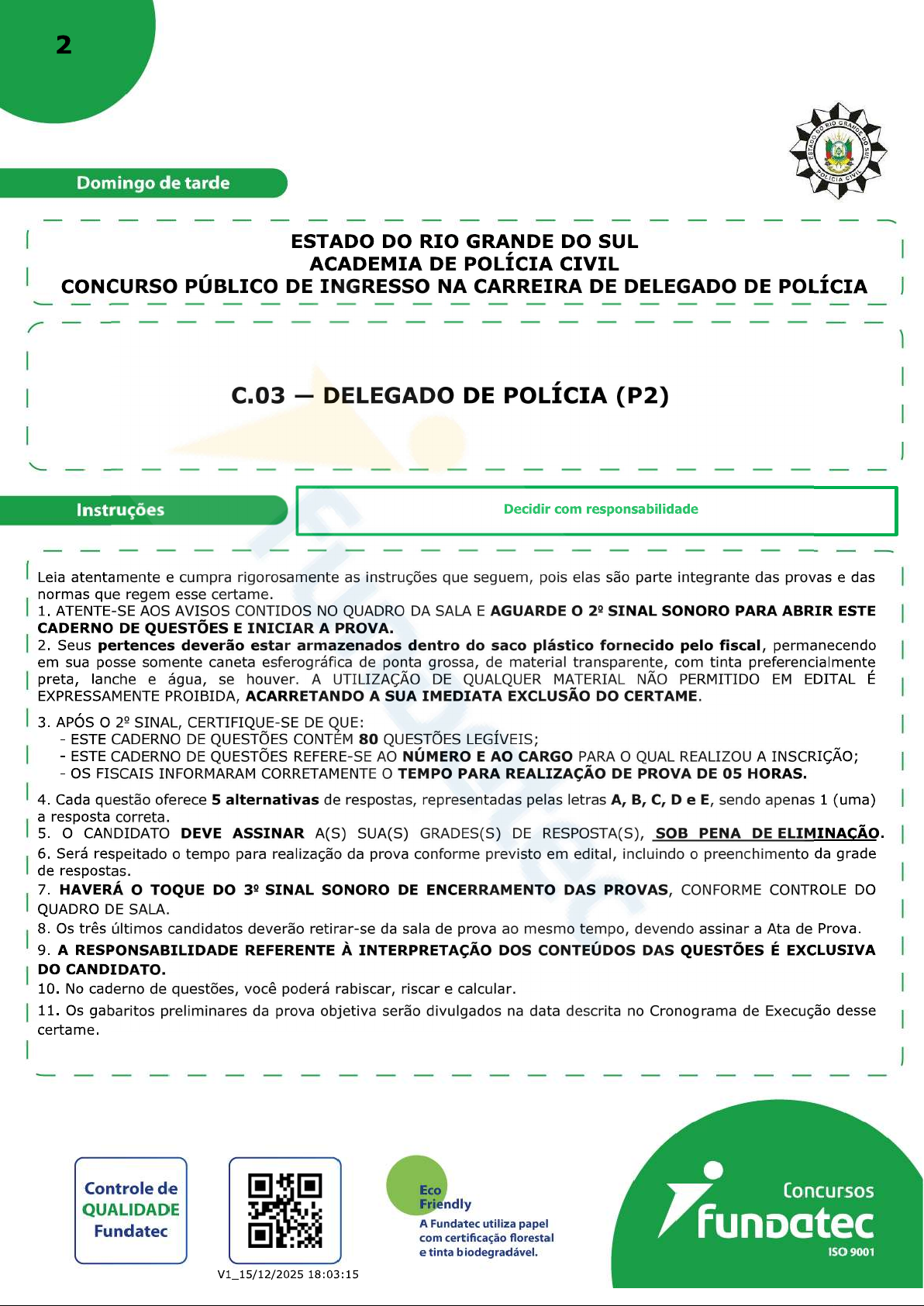 2 GRANDE Domingo de tarde ESTADO DO RIO GRANDE DO SUL ACADEMIA DE POLÍCIA CIVIL CONCURSO PÚBLICO DE INGRESSO NA CARREIRA DE DELEGADO DE POLÍCIA C.03 DELEGADO DE POLÍCIA (P2) Instruções Decidir com responsabilidade Leia atentamente e cumpra rigorosamente as instruções que seguem, pois elas são parte integrante das provas e das normas que regem esse certame. 1. ATENTE-SE AOS AVISOS CONTIDOS NO QUADRO DA SALA E AGUARDE SINAL SONORO PARA ABRIR ESTE CADERNO DE QUESTÕES E INICIAR A PROVA. 2. Seus pertences deverão estar armazenados dentro do saco plástico fornecido pelo fiscal, permanecendo em sua posse somente caneta esferográfica de ponta grossa, de material transparente, com tinta preferencialmente preta, lanche e água, se houver. A UTILIZAÇÃO DE QUALQUER MATERIAL NÃO PERMITIDO EM EDITAL É EXPRESSAMENTE PROIBIDA, ACARRETANDO A SUA IMEDIATA EXCLUSÃO DO CERTAME. 3. APÓS SINAL, CERTIFIQUE-SE DE QUE: ESTE CADERNO DE QUESTÕES CONTÉM 80 QUESTÕES LEGÍVEIS; ESTE CADERNO DE QUESTÕES REFERE-SE NÚMERO E CARGO PARA O QUAL REALIZOU A INSCRIÇÃO; - FISCAIS INFORMARAM CORRETAMENTE TEMPO PARA REALIZAÇÃO DE PROVA DE 05 HORAS. 4. Cada questão oferece 5 alternativas de respostas, representadas pelas letras c, D e E, sendo apenas 1 (uma) a resposta correta. 5. CANDIDATO DEVE ASSINAR A(S) SUA(S) GRADES(S) DE RESPOSTA(S), SOB PENA DE ELIMINAÇÃO. 6. Será respeitado tempo para realização da prova conforme previsto em edital, incluindo preenchimento da grade de respostas. 7. HAVERÁ TOQUE DO SINAL SONORO DE ENCERRAMENTO DAS PROVAS, CONFORME CONTROLE DO QUADRO DE SALA. 8. Os três últimos candidatos deverão retirar-se da sala de prova ao mesmo tempo, devendo assinar a Ata de Prova. 9. A RESPONSABILIDADE REFERENTE À INTERPRETAÇÃO DOS CONTEÚDOS DAS QUESTÕES É EXCLUSIVA DO CANDIDATO. 10. No caderno de questões, você poderá rabiscar, riscar e calcular. 11. Os gabaritos preliminares da prova objetiva serão divulgados na data descrita no Cronograma de Execução desse certame. Controle de Eco Concursos QUALIDADE Friendly Fundatec A Fundatec utiliza papel fundatec com certificação florestal e tinta biodegradável. ISO 9001 V1_15/12/2025 18:03:15RASCUNHO Utilize esse espaço para anotar suas respostas *A anotação neste rascunho NÃO substitui preenchimento da grade de respostas. 01 02 03 04 05 06 07 08 09 10 11 12 13 14 15 16 17 18 19 20 21 22 23 24 25 26 27 28 29 30 31 32 33 34 35 36 37 38 39 40 41 42 43 44 45 46 47 48 49 50 51 52 53 54 55 56 57 58 59 60 61 62 63 64 65 66 67 68 69 70 71 72 73 74 75 76 77 78 79 80 81 82 83 84 85 86 87 88 89 90 91 92 93 94 95 96 97 98 99 10016/12/2025 11:16:39 NOÇÕES DE TECNOLOGIA APLICÁVEIS À INVESTIGAÇÃO CRIMINAL QUESTÃO 01 É um mecanismo técnico destinado a garantir a integridade de dados, permitindo verificar se um arquivo digital não sofreu alterações desde sua coleta até sua apresentação em juízo. O trecho refere-se ao(à): A) Hash. B) Mixer. C) Log de auditoria. D) Chave simétrica. E) Proxy. QUESTÃO 02 Sobre o Marco Civil da Internet (Lei nº 12.965/2014), que estabelece princípios, garantias, direitos e deveres para uso da internet no Brasil, analise as assertivas a abaixo: I. provedor de conexão à internet será corresponsabilizado civilmente por danos decorrentes de conteúdo gerado por terceiros. II. A garantia do direito à privacidade e à liberdade de expressão nas comunicações é condição para o pleno exercício do direito de acesso à internet. III. A disponibilização ao requerente dos registros de acesso a aplicações de internet cujo provedor dessas aplicações seja constituído na forma de pessoa jurídica e que exerça essa atividade de forma organizada, profissionalmente e com fins econômicos poderá ser realizada a qualquer tempo, sem necessidade de autorização judicial. Quais estão corretas? A) Apenas I. B) Apenas II. C) Apenas I e II. D) Apenas II e III. E) I, II e III. QUESTÃO 03 Analise a sentença abaixo: A Deep Web e a Dark Web são uma parte da internet não indexada por motores de busca (1ª parte). A Deep Web é acessível por navegadores comuns (2ª parte), enquanto a Dark Web é uma pequena parte dentro da Deep Web que exige o uso de softwares específicos para acesso, como o Autopsy (3ª parte). Quais partes estão corretas? A) Apenas a parte. B) Apenas a parte. C) Apenas a e a partes. D) Apenas a e a partes. E) Todas as partes. QUESTÃO 04 No âmbito de investigações criminais, ainda são desafios da aplicação da Inteligência Artificial (IA), EXCETO: A) Garantir sigilo e conformidade com a LGPD. B) Evitar discriminação e vieses sociais. C) Assegurar a integridade da prova gerada. D) Eliminar a supervisão humana em decisões críticas. E) Lidar com a estagnação da capacidade de computação para processar de dados. Execução: Fundatec C.03 DELEGADO DE POLÍCIA (P2)16/12/2025 11:16:39 QUESTÃO 05 Em relação à classificação de crimes cibernéticos, assinale a alternativa que melhor define um crime cibernético próprio. A) Utiliza a internet como meio para cometer um crime comum como roubo, ameaça ou falsidade ideológica. B) É praticado somente em redes locais que não possuem acesso à internet. C) Tem a vingança como principal agente motivador, focando na exposição da vítima a uma situação vexatória. D) Acontece somente online, abrangendo atos como a inserção de dados falsos em sistemas e a invasão de dispositivo informático. E) É executado por alguém com profundo conhecimento em tecnologia e que explora sistemas para descobrir falhas de segurança. DIREITO PENAL QUESTÃO 06 No que concerne às funções e às características do Direito Penal, analise as assertivas abaixo: I. Direito Penal possui função promocional, consistindo esta na utilização do sistema punitivo como instrumento de transformação social e incentivo a comportamentos desejados pelo Estado, superando a mera proteção de bens jurídicos. II. caráter fragmentário do D