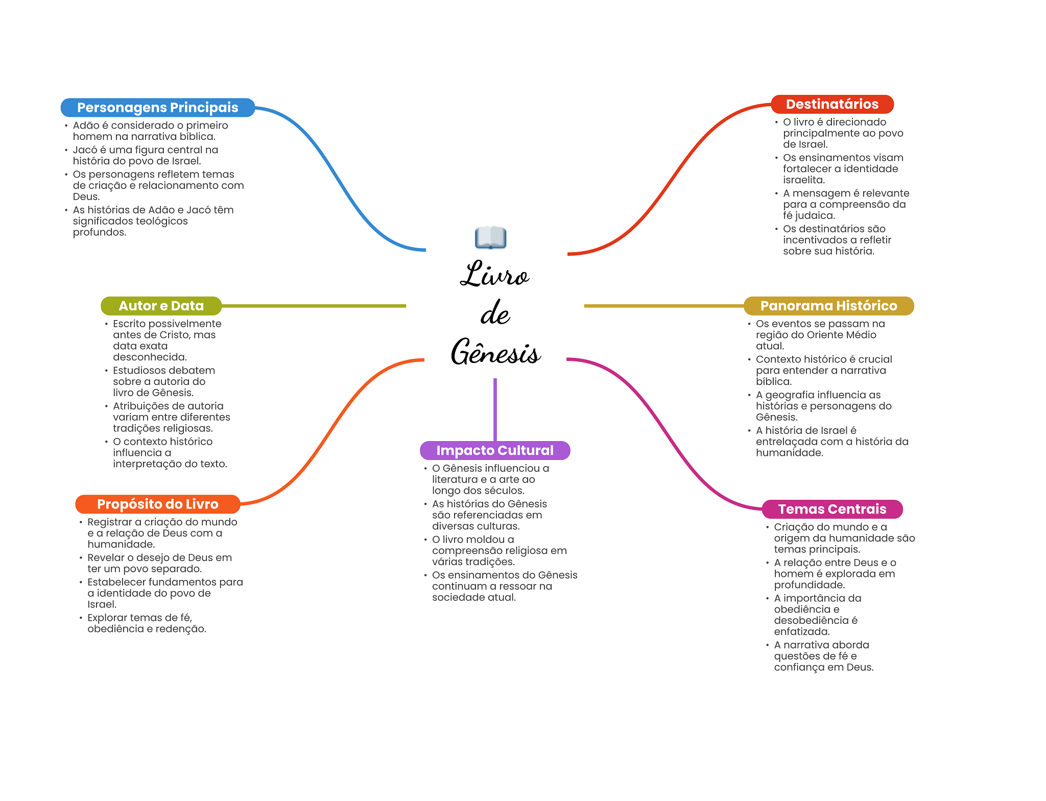 Personagens Principais Destinatários Adão é considerado primeiro livro é direcionado homem na narrativa bíblica. principalmente ao povo de Israel. Jacó é uma figura central na história do povo de Israel. Os ensinamentos visam fortalecer a identidade Os personagens refletem temas israelita. de criação e relacionamento com Deus. A mensagem é relevante As histórias de Adão e Jacó têm para a compreensão da significados teológicos fé judaica. profundos. Os destinatários são incentivados a refletir sobre sua história. Livro Autor e Data de Panorama Histórico Escrito possivelmente Os eventos se passam na antes de Cristo, mas região do Oriente Médio data exata desconhecida. Gênesis atual. Contexto histórico é crucial Estudiosos debatem para entender a narrativa sobre a autoria do bíblica. livro de Gênesis. A geografia influencia as Atribuições de autoria histórias e personagens do variam entre diferentes Gênesis. tradições religiosas. A história de Israel é contexto histórico entrelaçada com a história da influencia a Impacto Cultural humanidade. interpretação do texto. Gênesis influenciou a literatura e a arte ao longo dos séculos. Propósito do Livro As histórias do Gênesis Temas Centrais são referenciadas em Registrar a criação do mundo diversas culturas. Criação do mundo e a e a relação de Deus com a humanidade. livro moldou a origem da humanidade são compreensão religiosa em temas principais. Revelar desejo de Deus em várias tradições. A relação entre Deus e ter um povo separado. Os ensinamentos do Gênesis homem é explorada em Estabelecer fundamentos para continuam a ressoar na profundidade. a identidade do povo de sociedade atual. Israel. A importância da obediência e Explorar temas de fé, desobediência é obediência e redenção. enfatizada. A narrativa aborda questões de fé e confiança em Deus.
