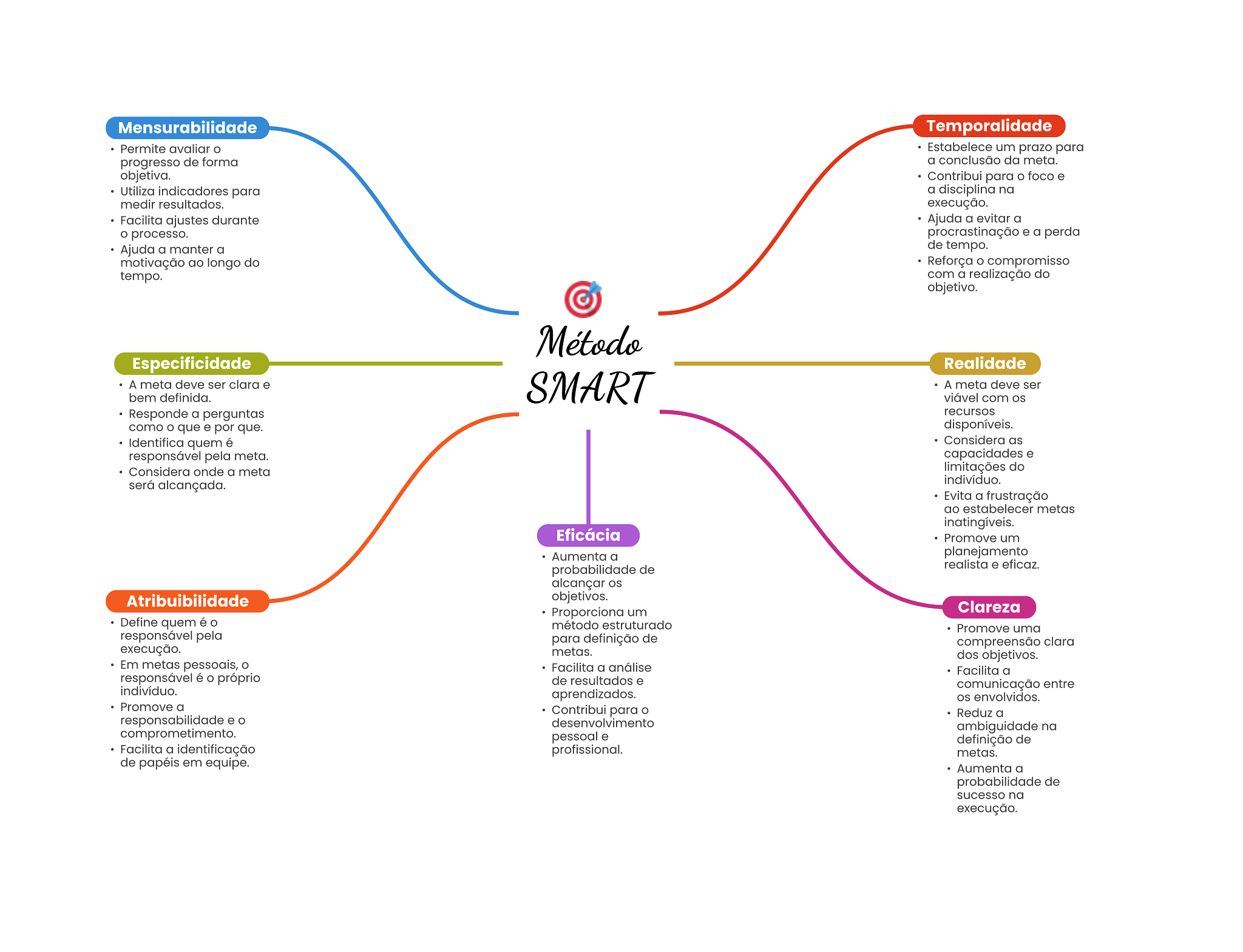 Mensurabilidade Temporalidade Permite avaliar Estabelece um prazo para progresso de forma a conclusão da meta. objetiva. Contribui para foco e Utiliza indicadores para a disciplina na medir resultados. execução. Facilita ajustes durante Ajuda a evitar a processo. procrastinação e a perda Ajuda a manter a de tempo. motivação ao longo do Reforça compromisso tempo. com a realização do objetivo. Método Especificidade Realidade A meta deve ser clara e SMART A meta deve ser bem definida. viável com Responde a perguntas recursos como que e por que. disponíveis. Identifica quem é Considera as responsável pela meta. capacidades e Considera onde a meta limitações do será alcançada. indivíduo. Evita a frustração ao estabelecer metas inatingíveis. Eficácia Promove um Aumenta a planejamento probabilidade de realista e eficaz. alcançar OS Atribuibilidade objetivos. Proporciona um Clareza Define quem é método estruturado Promove uma responsável pela para definição de compreensão clara execução. metas. dos objetivos. Em metas pessoais, Facilita a análise Facilita a responsável é próprio de resultados e indivíduo. comunicação entre aprendizados. envolvidos. Promove a Contribui para Reduz a responsabilidade e desenvolvimento ambiguidade na comprometimento. pessoal e definição de Facilita a identificação profissional. metas. de papéis em equipe. Aumenta a probabilidade de sucesso na execução.