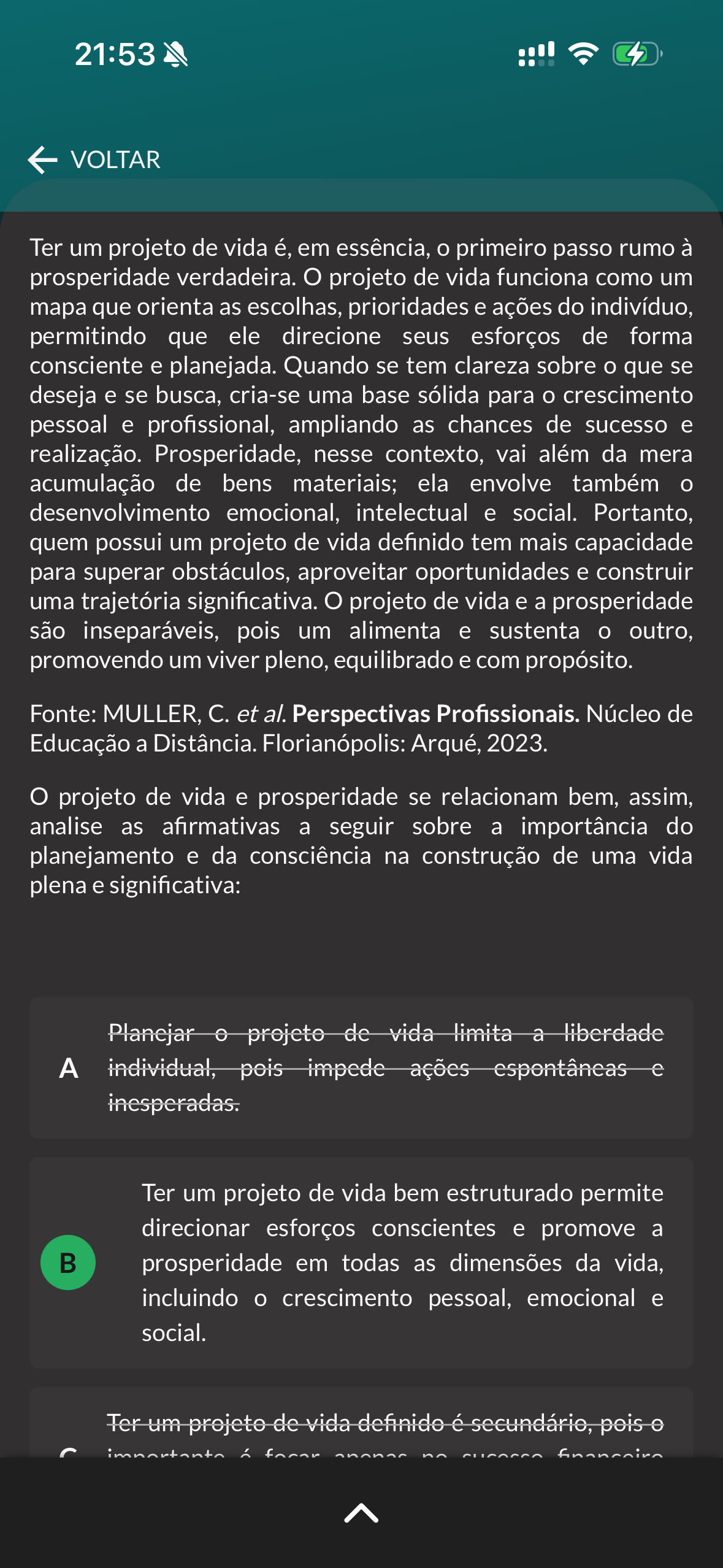 21:53 VOLTAR Ter um projeto de vida é, em essência, primeiro passo rumo à prosperidade verdadeira. projeto de vida funciona como um mapa que orienta as escolhas, prioridades e ações do indivíduo, permitindo que ele direcione seus esforços de forma consciente e planejada. Quando se tem clareza sobre que se deseja e se busca, cria-se uma base sólida para crescimento pessoal e profissional, ampliando as chances de sucesso e realização. Prosperidade, nesse contexto, vai além da mera acumulação de bens materiais; ela envolve também desenvolvimento emocional, intelectual e social. Portanto, quem possui um projeto de vida definido tem mais capacidade para superar obstáculos, aproveitar oportunidades e construir uma trajetória significativa. projeto de vida e a prosperidade são inseparáveis, pois um alimenta e sustenta outro, promovendo um viver pleno, equilibrado e com propósito. Fonte: MULLER, et al. Perspectivas Profissionais. Núcleo de Educação a Distância. Florianópolis: Arqué, 2023. projeto de vida e prosperidade se relacionam bem, assim, analise as afirmativas a seguir sobre a importância do planejamento e da consciência na construção de uma vida plena e significativa: Planejar projeto de vida limita a liberdade A individual, pois impede ações espontâncas e inesperadas. Ter um projeto de vida bem estruturado permite direcionar esforços conscientes e promove a B prosperidade em todas as dimensões da vida, incluindo crescimento pessoal, emocional e social. Ter um projeto de vida definido é secundário, pois