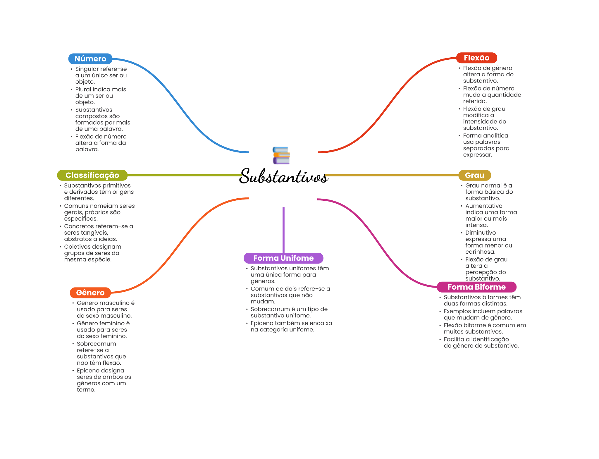 Número Flexão Singular refere-se Flexão de gênero a um único ser ou altera a forma do objeto. substantivo. Plural indica mais Flexão de número de um ser ou muda a quantidade objeto. referida. Substantivos Flexão de grau compostos são modifica a formados por mais intensidade do de uma palavra. substantivo. Flexão de número Forma analítica altera a forma da usa palavras palavra. separadas para expressar. Classificação Substantivos Grau Substantivos primitivos Grau normal é a e derivados têm origens forma básica do diferentes. substantivo. Comuns nomeiam seres Aumentativo gerais, próprios são indica uma forma específicos. maior ou mais Concretos referem-se a intensa. seres tangíveis, Diminutivo abstratos a ideias. expressa uma Coletivos designam forma menor ou grupos de seres da carinhosa. mesma espécie. Forma Unifome Flexão de grau Substantivos unifomes têm altera a uma única forma para percepção do gêneros. substantivo. Gênero Comum de dois refere-se a Forma Biforme substantivos que não Substantivos biformes têm Gênero masculino é mudam. duas formas distintas. usado para seres Sobrecomum é um tipo de do sexo masculino. substantivo unifome. Exemplos incluem palavras que mudam de gênero. Gênero feminino é Epiceno também se encaixa Flexão biforme é comum em usado para seres na categoria unifome. muitos substantivos. do sexo feminino. Sobrecomum Facilita a identificação refere-se a do gênero do substantivo. substantivos que não têm flexão. Epiceno designa seres de ambos gêneros com um termo.