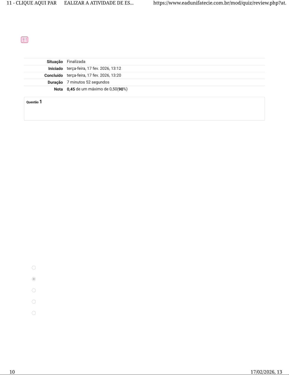 Finalizada terça-feira, 17 fev. 2026, 13:12 terça-feira, 17 fev. 2026, 13:20 7 minutos 52 segundos de um máximo de 0,50( %) Completo Atingiu 0,05 de 0,05 Com a ampliação do acesso à internet nos últimos anos e o aumento da con�ança dos consumidores em fazer compras on- line, houve o surgimento e crescimento de marketplaces on-line, chamados também de e-marketplaces. Deste modo, analise as a�rmativas abaixo: I. Os Marketplaces são mercados ou espaços físicos ou digitais que unem diversos vendedores ou fornecedores. II. Um shopping center com suas tradicionais lojas físicas de diversos segmentos diferentes em um só lugar pode ser considerado um Marketplace. III. Alguns sites de marketplace são destinados para que pessoas físicas possam comprar e vender produtos para outras pessoas, basta fazer um cadastro e anunciar um produto para outros usuários do site e encontrar alguém que queira comprar. Nesses casos, existem opções de anúncios gratuitos e pagos. Alguns exemplos desse tipo de marketplace são: OLX, ENJOEI, E-Bay, etc. IV. Os marketplaces são uma oportunidade para pequenas empresas que, sem ter nenhum estoque ou loja física, podem montar suas lojas virtuais em grandes plataformas de varejo on-line e contar com benefícios em relação ao marketing, comunicação e toda a infraestrutura, como o atendimento ao consumidor, sistemas de pagamento e tudo que esteja relacionado ao uso de uma plataforma tecnológica de ponta para a venda dos produtos. Assinale a alternativa correta: a. Apenas as a�rmativas I, II e IV estão corretas. b. As a�rmativas I, II, III e IV estão corretas. c. Apenas a a�rmativa II é correta. d. Apenas as a�rmativas III e IV estão corretas. e. Apenas as a�rmativas I e II estão corretas. Sua resposta está correta. AA11 - CLIQUE AQUI PARA REALIZAR A ATIVIDADE DE ES... https://www.eadunifatecie.com.br/mod/quiz/review.php?at... 1 of 10 17/02/2026, 13:25 null null null Completo Atingiu 0,05 de 0,05 Paradoxo pode ser um novo pensamento, proposição ou argumento que contraria os princípios básicos e gerais que costumam orientar uma opinião já concebida, uma crença ou uma �loso�a. Seria, também, nova compreensão ou situação que desa�a e impõe a conceitos e ideias compreendidos e compartilhados pela maioria das pessoas de uma sociedade ou de um segmento. Para ilustrar esse momento de mudanças ou ruptura do marketing digital, Kotler (2017, p. 37- 42) elaborou três paradoxos, que, segundo o autor, desa�am e rompem com os princípios básicos do marketing. Diante disso, analise as a�rmativas abaixo: I. A interação on-line versus a interação o�ine: A interação on-line substitui a interação o�ine. II. Consumidor informado versus consumidor distraído: A alta conectividade e o número crescente de estímulos que os consumidores recebem a todo momento, traz esse segundo paradoxo, em um momento da história do marketing onde nunca o consumidor teve acesso a tanta informação sobre produtos, marcas, direitos e a opinião de outros consumidores e, ao mesmo tempo, esse excesso de informação causa distração e falta de engajamento, a �delidade às marcas é algo cada vez mais raro. III. Defesa negativa versus defesa positiva: A internet empoderou os consumidores, que cada vez mais utilizam as redes sociais para expressar suas opiniões sobre suas experiências com marcas, produtos e serviços. Assinale a alternativa correta: a. Apenas as a�rmativas II e III estão corretas. b. Apenas a a�rmativa II é correta. c. Apenas a a�rmativa I está correta. d. As a�rmativas I, II e III estão corretas. e. Apenas as a�rmativas I e II estão corretas. Sua resposta está correta. AA11 - CLIQUE AQUI PARA REALIZAR A ATIVIDADE DE ES... https://www.eadunifatecie.com.br/mod/quiz/review.php?at... 2 of 10 17/02/2026, 13:25 null null null Completo Atingiu 0,00 de 0,05 Os mecanismos de segurança da informação envolvem tanto a segurança física quanto a segurança de software. Os controles físicos são barreiras que limitam o contato ou acesso direto à informação, ou a infraestrutura (que garante a existência da informação) que a suporta. Já os controles de software ou controles lógicos são barreiras que impedem ou limitam o acesso à informação, que está em ambiente controlado, geralmente eletrônico, e que, de outro modo, �caria exposta à alteração não autorizada por elemento mal-intencionado. Sendo assim, existem ainda alguns métodos de proteção, também chamados de autorização ou controle de acesso, que têm sido desenvolvidos para resolver os problemas de segurança. Analise as a�rmativas abaixo: I. Esquemas de senha; II. Sistemas biométricos; III. Segurança através da con�ança; IV. Segurança fundamentada na obscuridade. Assinale a alternativa correta: a. Apenas as a�rmativas II e III estão corretas. b. Apenas as a�rmativas I e II estão corretas. c. Apenas a a�rmativa II é correta. d. As a�rmativas I, II, III e IV estão corretas. e. Apenas as a�rmativas I e IV estão corretas. Sua resposta está incorreta. AA11 - CLIQUE AQUI PARA REALIZAR A ATIVIDADE DE ES... https://www.eadunifatecie.com.br/mod/quiz/review.php?at... 3 of 10 17/02/2026, 13:25 null null null Completo Atingiu 0,05 de 0,05 De acordo com Albertin (1998, p. 53) os aspectos físicos de segurança incluem o controle do acesso físico ao equipamento. “Uma organização precisa determinar quem pode andar em suas dependências e a quais áreas se pode ter acesso permitido”. Sendo assim, analise e julgue as a�rmativas abaixo com “V” para verdadeiro e “F” para falso: ( ) O �rewalls é uma forma de identi�cação das pessoas que estão liberadas para utilização do sistema de informação por meio de identi�cações físicas e comportamentais. ( ) O controle de acesso pode ser compreendido como sendo o conjunto de políticas e métodos que a empresa adota para evitar que pessoas indevidas 