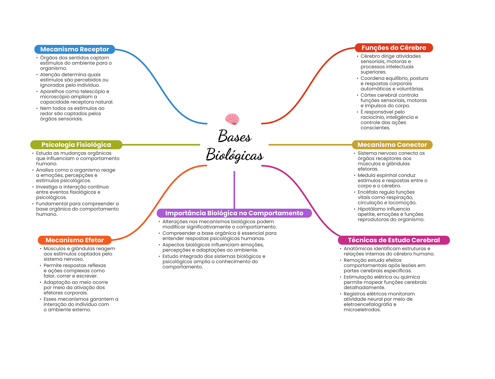 Mecanismo Receptor Funções do Cérebro Órgãos dos sentidos captam Cérebro dirige atividades estímulos do ambiente para sensoriais, motoras e organismo. processos Atenção determina quais superiores. estímulos são percebidos ou Coordena equilíbrio, postura ignorados pelo indivíduo. e respostas corporais automáticas e voluntárias. Aparelhos como telescópio e microscópio ampliam a Córtex cerebral controla capacidade receptora natural. funções sensoriais, motoras Nem todos OS estímulos ao e impulsos do corpo. redor são captados pelos É responsável pelo órgãos sensoriais. raciocínio, inteligência e controle das ações conscientes. Bases Psicologia Fisiológica Mecanismo Conector Estuda as mudanças orgânicas Biológicas Sistema nervoso conecta que influenciam O comportamento órgãos receptores aos humano. músculos e glândulas Analisa como organismo reage efetoras. a emoções, percepções e Medula espinhal conduz estímulos psicológicos. estímulos e respostas entre Investiga a interação contínua corpo e O cérebro. entre eventos fisiológicos e Encéfalo regula funções psicológicos. vitais como respiração, Fundamental para compreender a circulação e locomoção. base orgânica do comportamento Hipotálamo influencia humano. Importância Biológica no Comportamento apetite, emoções e funções Alterações nos mecanismos biológicos podem reprodutoras do organismo. modificar significativamente comportamento. Compreender a base orgânica é essencial para Mecanismo Efetor entender respostas psicológicas humanas. Técnicas de Estudo Cerebral Aspectos biológicos influenciam emoções, Músculos e glândulas reagem percepções e adaptações ao ambiente. Anatômicas identificam estruturas e aos estímulos captados pelo Estudo integrado dos sistemas biológicos e relações internas do cérebro humano. sistema nervoso. psicológicos amplia conhecimento do Remoção estuda efeitos Permite respostas reflexas comportamento. comportamentais após lesões em e ações complexas como partes cerebrais específicas. falar, correr e escrever. Estimulação elétrica ou química Adaptação ao meio ocorre permite mapear funções cerebrais por meio da ativação dos detalhadamente. efetores corporais. Registros elétricos monitoram Esses mecanismos garantem a atividade neural por meio de interação do indivíduo com eletroencefalografia e ambiente externo. microeletrodos.
