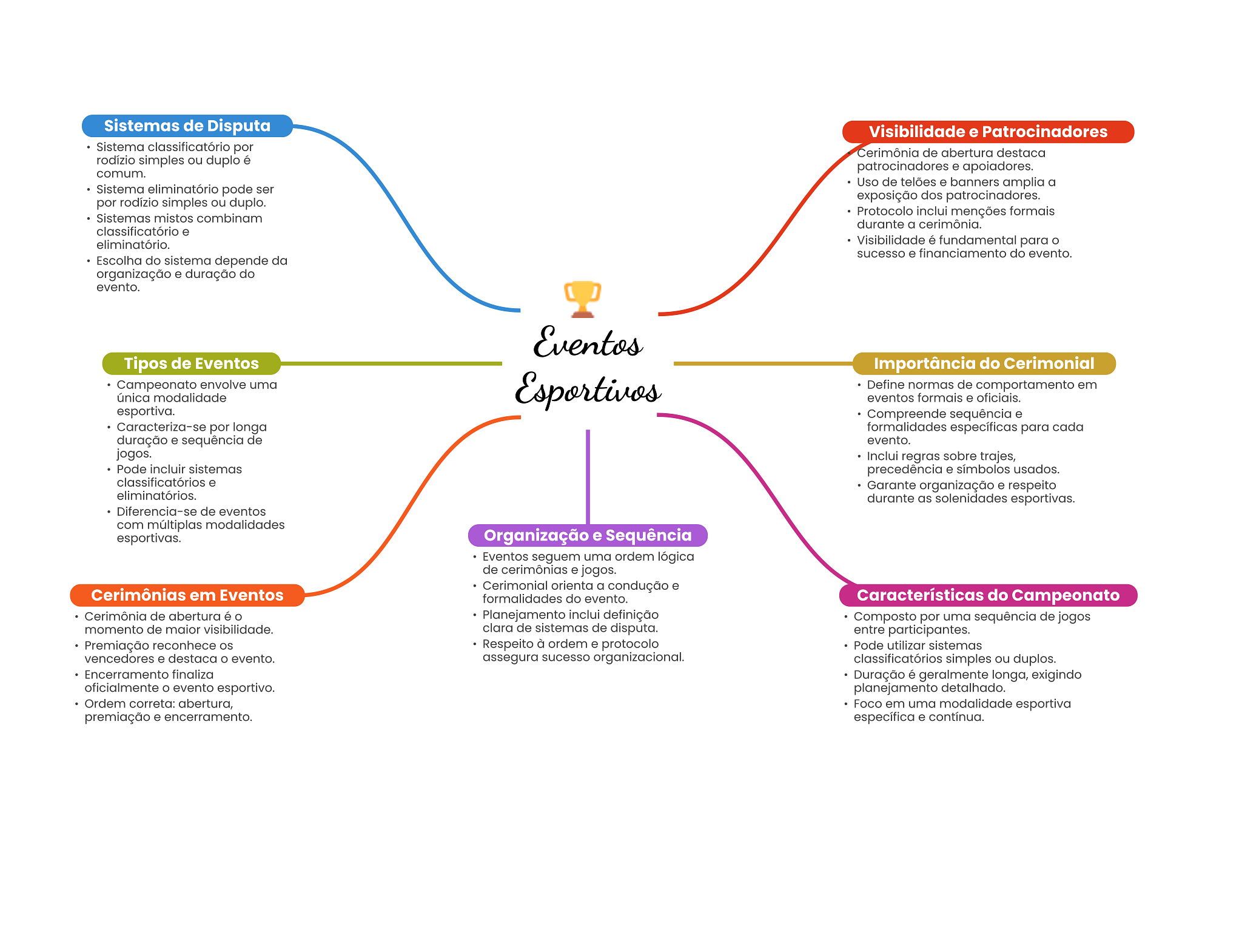 Sistemas de Disputa Visibilidade e Patrocinadores Sistema classificatório por Cerimônia de abertura destaca rodízio simples ou duplo é patrocinadores e apoiadores. comum. Uso de telões e banners amplia a Sistema eliminatório pode ser exposição dos patrocinadores. por rodízio simples ou duplo. Sistemas mistos combinam Protocolo inclui menções formais durante a cerimônia. classificatório e eliminatório. Visibilidade é fundamental para sucesso e financiamento do evento. Escolha do sistema depende da organização e duração do evento. Eventos Tipos de Eventos Importância do Cerimonial Campeonato envolve uma Esportivos Define normas de comportamento em única modalidade eventos formais e oficiais. esportiva. Compreende sequência e Caracteriza-se por longa formalidades específicas para cada duração e sequência de evento. jogos. Inclui regras sobre trajes, Pode incluir sistemas precedência e símbolos usados. classificatórios e Garante organização e respeito eliminatórios. durante as solenidades esportivas. Diferencia-se de eventos com múltiplas modalidades esportivas. Organização e Sequência Eventos seguem uma ordem lógica de cerimônias e jogos. Cerimonial orienta a condução e Cerimônias em Eventos formalidades do evento. Características do Campeonato Cerimônia de abertura é Planejamento inclui definição Composto por uma sequência de jogos momento de maior visibilidade. clara de sistemas de disputa. entre participantes. Premiação reconhece Respeito à ordem e protocolo Pode utilizar sistemas vencedores e destaca evento. assegura sucesso organizacional. classificatórios simples ou duplos. Encerramento finaliza Duração é geralmente longa, exigindo oficialmente O evento esportivo. planejamento detalhado. Ordem correta: abertura, Foco em uma modalidade esportiva premiação e encerramento. específica e contínua.