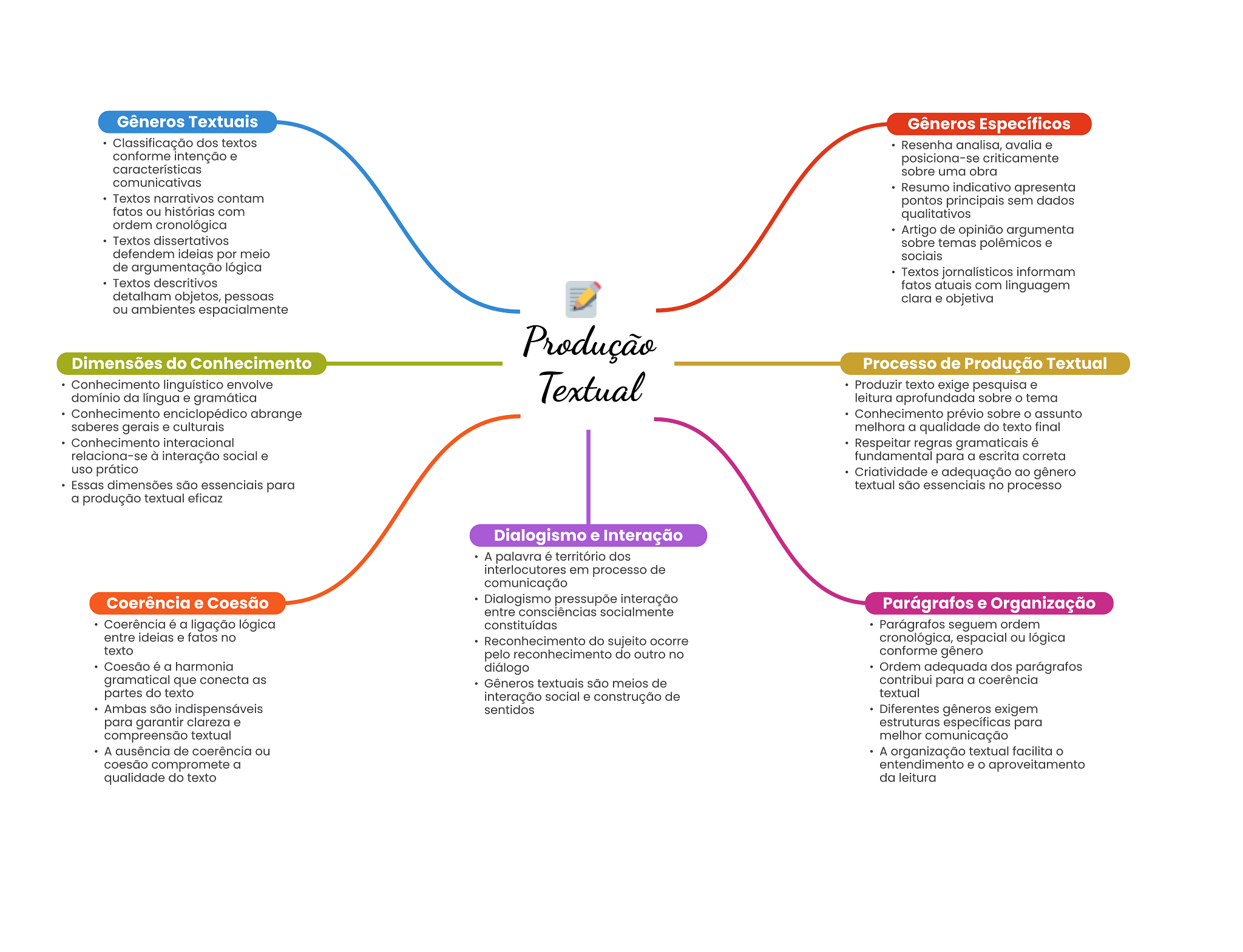 Gêneros Textuais Gêneros Específicos Classificação dos textos Resenha analisa, avalia e conforme intenção e posiciona-se criticamente características sobre uma obra comunicativas Resumo indicativo apresenta Textos narrativos contam pontos principais sem dados fatos ou histórias com qualitativos ordem cronológica Artigo de opinião argumenta Textos dissertativos sobre temas polêmicos e defendem ideias por meio sociais de argumentação lógica Textos jornalísticos informam Textos descritivos fatos atuais com linguagem detalham objetos, pessoas clara e objetiva ou ambientes espacialmente Produção Dimensões do Conhecimento Processo de Produção Textual Conhecimento linguístico envolve Textual Produzir texto exige pesquisa e domínio da língua e gramática leitura aprofundada sobre tema Conhecimento enciclopédico abrange Conhecimento prévio sobre O assunto saberes gerais e culturais melhora a qualidade do texto final Conhecimento interacional Respeitar regras gramaticais é relaciona-se à interação social e fundamental para a escrita correta uso prático Criatividade e adequação ao gênero Essas dimensões são essenciais para textual são essenciais no processo a produção textual eficaz Dialogismo e Interação A palavra é território dos interlocutores em processo de comunicação Coerência e Coesão Dialogismo pressupõe interação entre consciências socialmente Parágrafos e Organização Coerência é a ligação lógica constituídas Parágrafos seguem ordem entre ideias e fatos no Reconhecimento do sujeito ocorre cronológica, espacial ou lógica texto pelo reconhecimento do outro no conforme gênero Coesão é a harmonia diálogo Ordem adequada dos parágrafos gramatical que conecta as Gêneros textuais são meios de contribui para a coerência partes do texto interação social e construção de textual Ambas são indispensáveis sentidos Diferentes gêneros exigem para garantir clareza e estruturas específicas para compreensão textual melhor comunicação A ausência de coerência ou A organização textual facilita coesão compromete a entendimento e aproveitamento qualidade do texto da leitura