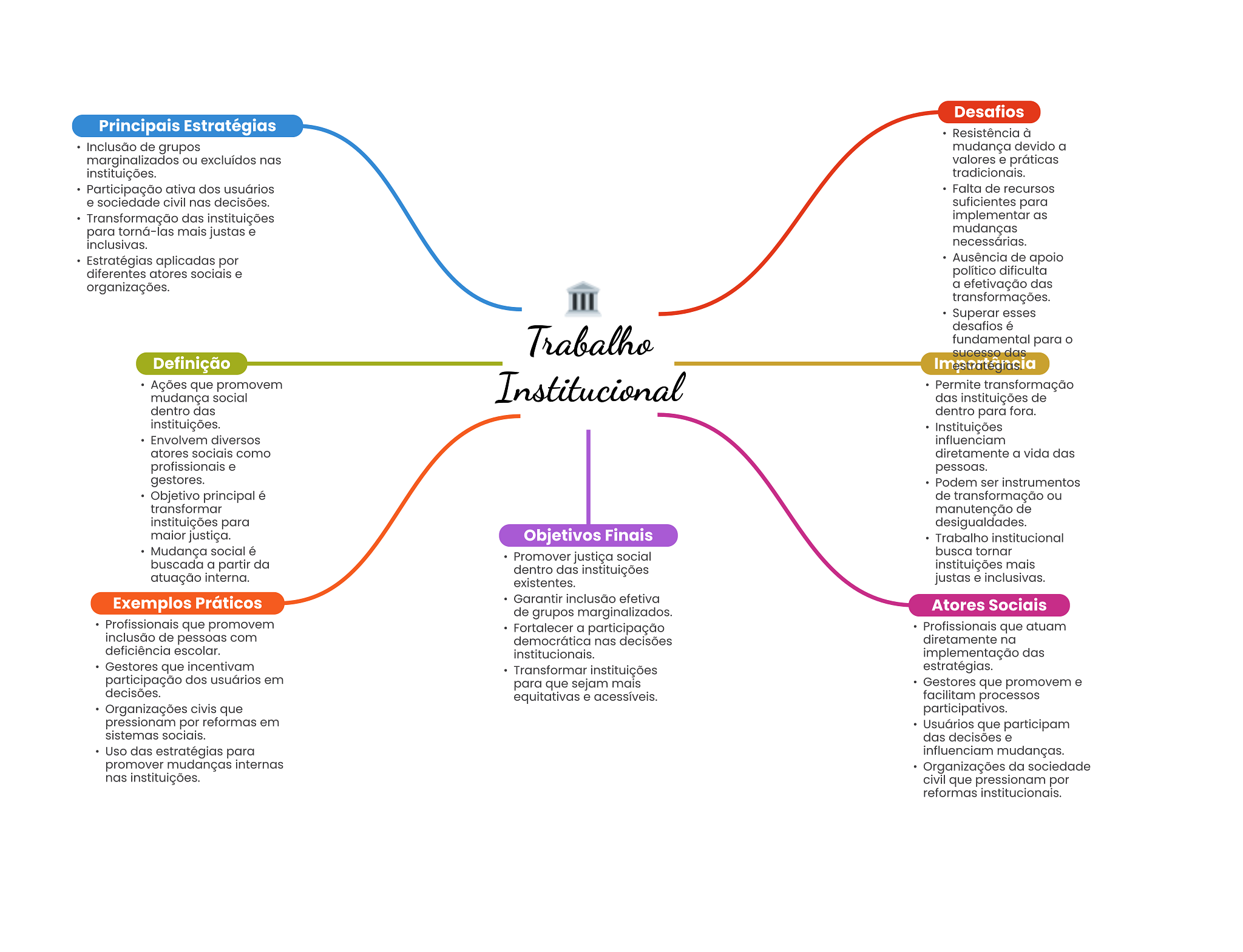 Desafios Principais Estratégias Resistência à Inclusão de grupos mudança devido a marginalizados ou excluídos nas valores e práticas instituições. tradicionais. Participação ativa dos usuários Falta de recursos e sociedade civil nas decisões. suficientes para Transformação das instituições implementar as para torná-las mais justas e mudanças inclusivas. necessárias. Estratégias aplicadas por Ausência de apoio diferentes atores sociais e político dificulta organizações. a efetivação das transformações. Superar esses desafios é Trabalho fundamental para O sucesso das Definição Ações que promovem mudança social Institucional Permite transformação das instituições de dentro das dentro para fora. instituições. Instituições Envolvem diversos influenciam atores sociais como diretamente a vida das profissionais e pessoas. gestores. Podem ser instrumentos Objetivo principal é de transformação ou transformar manutenção de instituições para desigualdades. maior justiça. Objetivos Finais Trabalho institucional Mudança social é Promover justiça social busca tornar buscada a partir da dentro das instituições instituições mais atuação interna. existentes. justas e inclusivas. Exemplos Práticos Garantir inclusão efetiva Atores Sociais de grupos marginalizados. Profissionais que promovem Fortalecer a participação Profissionais que atuam inclusão de pessoas com democrática nas decisões diretamente na deficiência escolar. institucionais. implementação das Gestores que incentivam Transformar instituições estratégias. participação dos usuários em para que sejam mais Gestores que promovem e decisões. equitativas e acessíveis. facilitam processos Organizações civis que participativos. pressionam por reformas em Usuários que participam sistemas sociais. das decisões e Uso das estratégias para influenciam mudanças. promover mudanças internas Organizações da sociedade nas instituições. civil que pressionam por reformas institucionais.