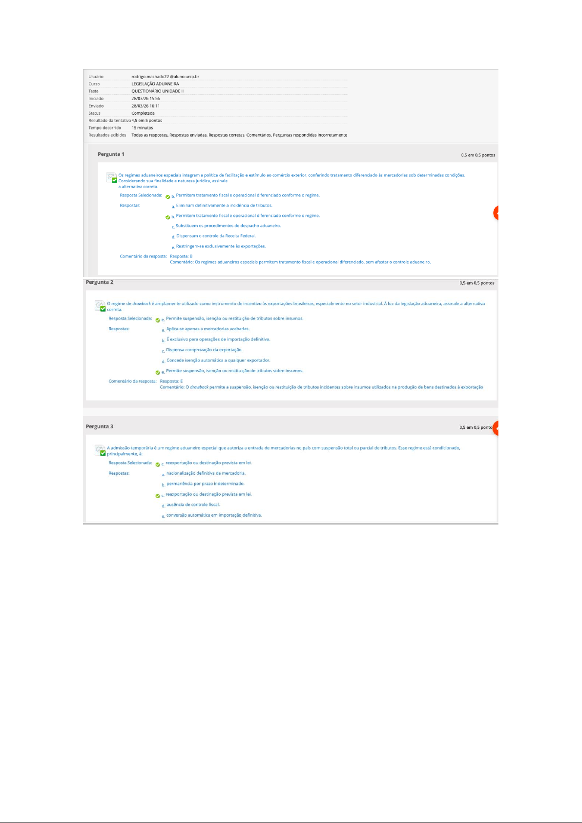 Usuário machado22 Curso LEGISLAÇÃO ADUANEIRA Teste QUESTIONÁRIO UNIDADE Iniciado 28/03/26 15:56 Enviado 28/03/26 16:11 Status Completada Resultado da tentativa 4,5 em pontos Tempo decorrido 15 minutos Resultados exibidos Todas as respostas, Respostas enviadas, Respostas corretas, Comentários, Perguntas respondidas incorretamente Pergunta 1 0,5 em 0,5 pontos Os regimes aduaneiros especiais integram política de facilitação e estímulo ao comércio exterior, conferindo tratamento diferenciado às mercadorias sob determinadas condições. Considerando sua finalidade e natureza jurídica, assinale a alternativa correta. Resposta Selecionada: b. Permitem tratamento fiscal e operacional diferenciado conforme regime. Respostas: Eliminam definitivamente a incidência de tributos. b. Permitem tratamento fiscal e operacional diferenciado conforme regime. Substituem os procedimentos de despacho aduaneiro. d. Dispensam controle da Receita Federal. Restringem-s exclusivamente às exportações. Comentário da resposta: Resposta: Comentário: Os regimes aduaneiros especiais permitem tratamento fiscal e operacional diferenciado, sem afastar o controle aduaneiro. Pergunta 2 0,5 em 0,5 pontos regime de drawback amplamente utilizado como instrumento de incentivo às exportações brasileiras, especialmente no setor À luz da legislação aduaneira, assinale a alternativa correta. Resposta Selecionada: Permite suspensão, isenção ou restituição de tributos sobre insumos. Respostas: Aplica-se apenas a mercadorias acabadas. b. É exclusivo para operações de importação definitiva. Dispensa comprovação da exportação. d. Concede isenção automática a qualquer exportador. Permite suspensão, isenção ou restituição de tributos sobre insumos. Comentário da resposta: Resposta: E Comentário: drawback permite a suspensão, isenção ou restituição de tributos incidentes sobre insumos utilizados na produção de bens destinados à exportação Pergunta 3 0,5 em 0,5 ponto A admissão temporária é um regime aduaneiro especial que autoriza a entrada de mercadorias no pais com suspensão total ou parcial de tributos. Esse regime está condicionado, principalmente, à: Resposta Selecionada: reexportação ou destinação prevista em lei. Respostas: nacionalização definitiva da mercadoria. b. permanência por prazo indeterminado. reexportação ou destinação prevista em lei. d. ausência de controle fiscal. conversão automática em importaçãoPergunta 4 0,5 em 0,5 pontos regime de entreposto aduaneiro permite que mercadorias permaneçam armazenadas sob controle aduaneiro antes de sua destinação final. Sobre esse regime, assinale a alternativa correta. Resposta Selecionada: a. Suspende tributos enquanto a mercadoria estiver armazenada. Respostas: a. Suspende tributos enquanto a mercadoria estiver armazenada. b. Elimina a necessidade de despacho Permite circulação irrestrita no território nacional. d. Aplica-se apenas a mercadorias nacionais. e. Exclui a fiscalização administrativa. Comentário da resposta: Resposta: A Comentário: No regime de entreposto aduaneiro, os tributos incidentes ficam suspensos enquanto a mercadoria permanecer sob controle fiscal. Pergunta 5 0,5 em 0,5 ponto As Zonas de Processamento de Exportação (ZPE) constituem áreas especiais destinadas à produção voltada ao mercado externo, mediante compromissos específicos assumidos pelas empresas Para fins de controle aduaneiro, as ZPE: Resposta Selecionada: d. equiparam-se à zona primária. Respostas: não estão sujeitas à fiscalização da Receita Federal. b. são consideradas zona secundária. C. dispensam compromissos de exportação. d. equiparam-se à zona primária. e. permitem livre ingresso de pessoas do exterior. Pergunta 6 0,5 em 0,5 pontos despacho aduaneiro de importação constitui etapa essencial para a nacionalização da mercadoria estrangeira. Considerando sua finalidade principal, assinale a alternativa correta. Resposta Selecionada: Verificar a regularidade fiscal, documental e física da importação. Respostas: a. Autorizar transporte internacional. b. Definir política cambial da operação. Verificar a regularidade fiscal, documental e física da importação. d. Registrar contrato de câmbio. Classificar economicamente importador. Comentário da resposta: Resposta: Comentário: despacho aduaneiro de importação tem como objetivo verificar a regularidade documental, fiscal física da mercadoria importada. Pergunta 7 0,5 em 0,5 pontos A conferência aduaneira integra procedimento de despacho e pode ocorrer por diferentes níveis de verificação. Sua finalidade principal é: Resposta Selecionada: e. confirmar a veracidade das informações declaradas. Respostas: eliminar riscos b. substituir a fiscalização posterior. apurar exclusivamente valor aduaneiro. d. dispensar revisão e. confirmar a veracidade das informações declaradas. Comentário da resposta: Resposta: E visa confirmar veracidade das informações importador ou autoridadePergunta 8 0,5 em 0,5 ponto As penalidades aplicáveis às infrações aduaneiras incluem perdimento de mercadorias, veículos ou moeda. Sobre perdimento de mercadoria, assinale a alternativa correta. Resposta Selecionada: b. Resulta na perda da mercadoria em favor da União. Respostas: Aplica- se apenas a mercadorias tributadas. b. Resulta na perda da mercadoria em favor da União. Depende exclusivamente de decisão judicial. d. É sempre substituída por multa. e. Ocorre automaticamente em qualquer infração. Comentário da resposta: Resposta: Comentário: perdimento é penalidade administrativa que implica a incorporação da mercadoria ao patrimônio da Pergunta 9 0,5 em ponto Programa Brasileiro de Operador Econômico Autorizado (OEA) insere no contexto da facilitação do comércio e da gestão de riscos aduaneiros. Sua principal finalidade é: Resposta Selecionada: reconhecer operadores de baixo risco e confiáveis. Respostas: reconhecer oper