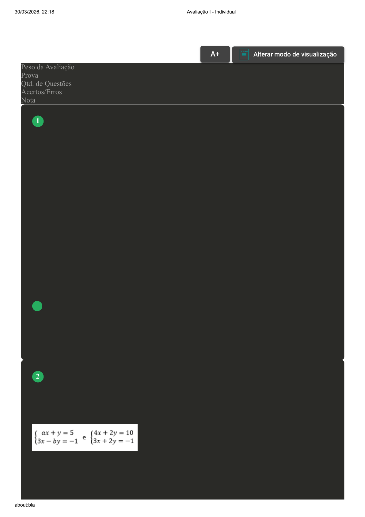 Prova Impressa GABARITO | Avaliação I - Individual (Cod.:958035) Peso da Avaliação 2,00 Prova 83114051 Qtd. de Questões 10 Acertos/Erros 10/0 Nota 10,00 No estudo das matrizes, verificamos que podemos realizar uma série de operações entre elas. No entanto, os procedimentos a serem realizados não são tão simples assim e alguns critérios devem ser verificados antes de realizar os procedimentos de cálculo. Por exemplo, é muito importante na multiplicação entre matrizes saber realizar a análise da ordem das matrizes a serem operadas para verificar a viabilidade da realização do cálculo e prever a ordem da matriz resposta. Sobre o exposto, analise as sentenças a seguir: I- O produto das matrizes A(3 x 2) . B(2 x 1) é uma matriz 3 x 1. II- O produto das matrizes A(5 x 4) . B(5 x 2) é uma matriz 4 x 2. III- O produto das matrizes A(2 x 3) . B(3 x 2) é uma matriz quadrada 2 x 2. Assinale a alternativa CORRETA: A Somente a sentença I está correta. B Somente a sentença III está correta. C As sentenças I e III estão corretas. D As sentenças I e II estão corretas. Dizemos que dois sistemas lineares são equivalentes quando possuem o mesmo conjunto solução. No entanto, podemos realizar esta análise, verificando os coeficientes numéricos das incógnitas e os termos independentes de cada sistema. Assim, dado o sistema a seguir, determine quais são os valores de a e b para que os sistemas sejam equivalentes: Assinale a alternativa CORRETA: A a = 4 e b = 2. VOLTAR A+Aumentar, FonteAlterar modo de visualização 1 2 30/03/2026, 22:18 Avaliação I - Individual about:blank 1/5 B a = 4 e b = -2. C a = 2 e b = 4. D a = 2 e b = -2. A discussão dos sistemas lineares consiste em analisar parâmetros dos coeficientes em relação ao determinante da matriz que representa os coeficientes das equações e, através desses parâmetros, classificar os sistemas quanto as suas soluções. Desta forma, com relação à solução do sistema linear, assinale a alternativa CORRETA: A Não admite solução. B Admite infinitas soluções. C Admite apenas uma solução. D Admite somente duas soluções. Joaquim faltou na aula e pegou emprestado o caderno de seu amigo Manoel para estudar e copiar a matéria atrasada. No entanto, como este seu amigo não era nada caprichoso parte da resolução de uma das questões de multiplicação de matrizes aprendida estava apagada. Sobre a resolução ilegível na matriz apresentada, analise as opções a seguir e assinale a alternativa CORRETA: A Somente a matriz II. B Somente a matriz IV. 3 4 30/03/2026, 22:18 Avaliação I - Individual about:blank 2/5 C Somente a matriz I. D Somente a matriz III. Uma das aplicações que envolvem o cálculo de determinantes de uma matriz de ordem 3 é o cálculo de volume dos vetores escritos na forma matricial. A partir deste cálculo, principalmente na engenharia, podemos projetar a quantidade de material necessário na confecção de peças em geral. Nessa perspectiva, retomando o processo de cálculo, leia a questão a seguir e assinale a alternativa CORRETA: A det(A) = -8. B det(A) = 8. C det(A) = 12. D det(A) = -12. Matriz quadrada é a que tem o mesmo número de linhas e de colunas. Esse tipo especial de matriz possui um número real associado. A este número real, damos o nome de determinante da matriz. Baseado nisso, sabendo que o determinante de uma matriz é igual a 2, qual o valor do novo determinante, obtido pela troca de posição de linhas entre si? Assinale a alternativa CORRETA: A 1/2. B 4. C -2. D 2. Arthur Cayley (1821-1895) foi um dos pioneiros no estudo das matrizes e, por volta de 1850., divulgou esse nome e passou a demonstrar sua aplicação. As matrizes, inicialmente, eram aplicadas quase que exclusivamente na resolução de sistemas lineares e apenas há pouco mais de 150 anos tiveram sua importância detectada. Com base no exposto, classifique V para as sentenças verdadeiras e F para as falsas: 5 6 7 30/03/2026, 22:18 Avaliação I - Individual about:blank 3/5 ( ) Se A é uma matriz do tipo 3x5 então o sistema de equações A.X = B será indeterminado. ( ) Se A é triangular do tipo nxn então det(A) = a11 . a22 . a33 . . . ann. ( ) Se det(A) é diferente de 0 então existe a inversa de A. ( ) Se A.B pode ser calculada então B.A sempre tem como resultado uma matriz diferente. Assinale a alternativa que apresenta a sequência CORRETA: A V - V - V - F. B V - F - V - F. C F - V - V - F. D V - F - F - V. O esquema a seguir indica as diversas possibilidades de soluções de um sistema linear: A a = 3/4. B a = 1. C a = 0. D a = -14/3. Para realizar a discussão de um sistema linear, devemos verificar se o sistema é SPD (possível e determinado), SPI (possível e indeterminado) ou SI (impossível). Com base no sistema apresentado, analise as opções a seguir e , em seguida, assinale a alternativa CORRETA: A Somente a opção I está correta. 8 9 30/03/2026, 22:18 Avaliação I - Individual about:blank 4/5 B Somente a opção III está correta. C Somente a opção IV está correta. D Somente a opção II está correta. Podemos construir uma matriz de acordo com uma lei de formação baseada em situações variadas. Cada uma destas situações poderá representar (ou modelar) alguma situação prática que necessite a utilização das matrizes para sua resolução. Baseado nisso, dado a matriz a seguir, determine o termo a23: A = (aij)3x3 = i + 2j² Assinale a alternativa CORRETA: A 6. B 20. C 10. D 5. 10 Imprimir 30/03/2026, 22:18 Avaliação I - Individual about:blank 5/5