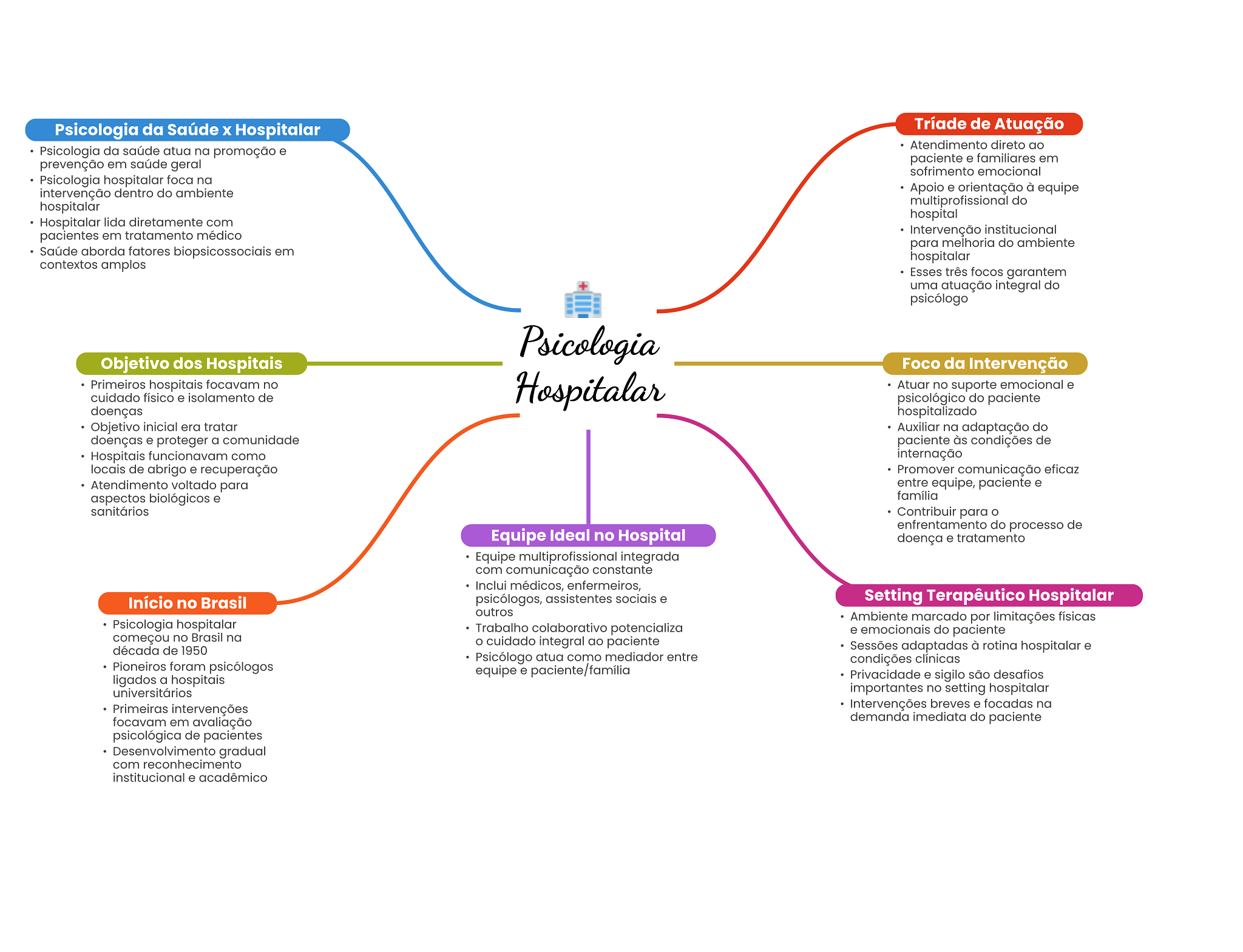 Psicologia da Saúde Hospitalar Tríade de Atuação Atendimento direto ao Psicologia da saúde atua na promoção e prevenção em saúde geral paciente e familiares em sofrimento emocional Psicologia hospitalar foca na intervenção dentro do ambiente Apoio e orientação à equipe hospitalar multiprofissional do hospital Hospitalar lida diretamente com pacientes em tratamento médico Intervenção institucional para melhoria do ambiente Saúde aborda fatores biopsicossociais em hospitalar contextos amplos Esses três focos garantem uma atuação integral do psicólogo Psicologia Objetivo dos Hospitais Foco da Intervenção Primeiros hospitais focavam no Hospitalar Atuar no suporte emocional e cuidado físico e isolamento de psicológico do paciente doenças hospitalizado Objetivo inicial era tratar Auxiliar na adaptação do doenças e proteger a comunidade paciente às condições de Hospitais funcionavam como internação locais de abrigo e recuperação Promover comunicação eficaz Atendimento voltado para entre equipe, paciente e aspectos biológicos e família sanitários Contribuir para O enfrentamento do processo de Equipe Ideal no Hospital doença e tratamento Equipe multiprofissional integrada com comunicação constante Inclui médicos, enfermeiros, Início no Brasil psicólogos, assistentes sociais e Setting Terapêutico Hospitalar outros Ambiente marcado por limitações físicas Psicologia hospitalar Trabalho colaborativo potencializa e emocionais do paciente começou no Brasil na cuidado integral ao paciente década de 1950 Sessões adaptadas à rotina hospitalar e Psicólogo atua como mediador entre condições clínicas Pioneiros foram psicólogos equipe e paciente/família ligados a hospitais Privacidade e sigilo são desafios universitários importantes no setting hospitalar Primeiras intervenções Intervenções breves e focadas na focavam em avaliação demanda imediata do paciente psicológica de pacientes Desenvolvimento gradual com reconhecimento institucional e acadêmico