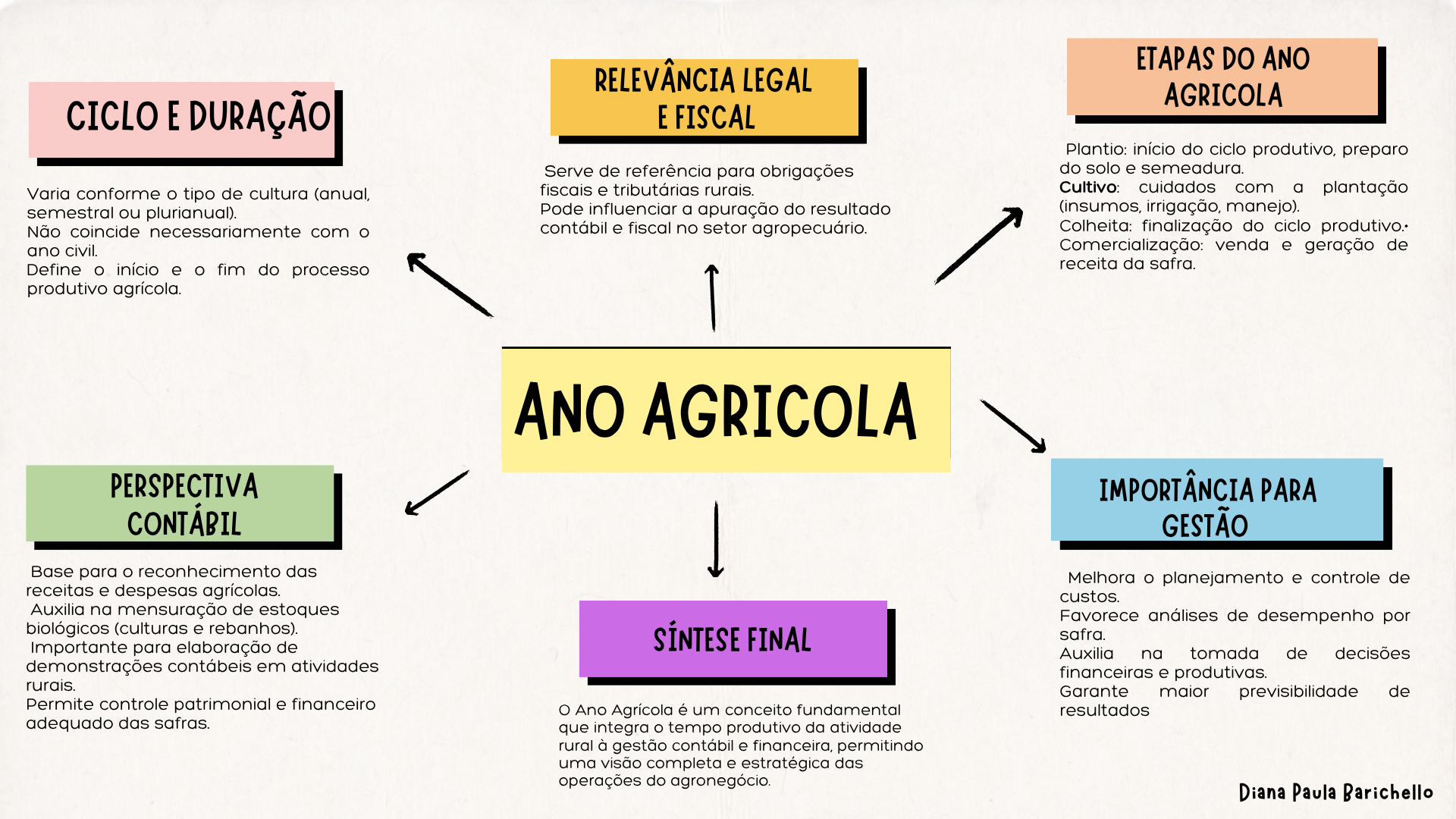 ETAPAS DO ANO RELEVÂNCIA LEGAL CICLO E DURAÇÃO AGRICOLA E FISCAL Plantio: início do ciclo produtivo, preparo Serve de referência para obrigações do solo e semeadura. Varia conforme tipo de cultura (anual, fiscais e tributárias rurais. Cultivo: cuidados com a plantação semestral ou plurianual). Pode influenciar a apuração do resultado (insumos, irrigação, manejo). Não coincide necessariamente com contábil e fiscal no setor agropecuário. Colheita: finalização do ciclo ano civil. Comercialização: venda e geração de Define início e fim do processo receita da safra. produtivo agrícola. ANO AGRICOLA PERSPECTIVA IMPORTÂNCIA PARA CONTÁBIL GESTÃO Base para reconhecimento das Melhora planejamento e controle de receitas e despesas agrícolas. custos. Auxilia na mensuração de estoques Favorece análises de desempenho por biológicos (culturas e rebanhos). Importante para elaboração de SÍNTESE FINAL safra. Auxilia na tomada de decisões demonstrações contábeis em atividades financeiras e produtivas. rurais. Garante maior previsibilidade de Permite controle patrimonial e financeiro Ano Agrícola é um conceito fundamental resultados adequado das safras. que integra tempo produtivo da atividade rural à gestão contábil e financeira, permitindo uma visão completa e estratégica das operações do agronegócio. Diana Paula Barichello