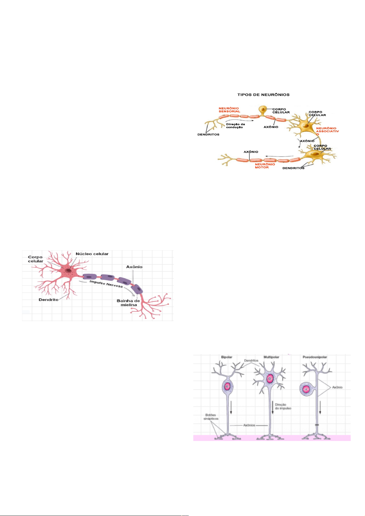 Roberta Freitas – T14 1 Caracteríicas ® Conjunto de órgãos que transmitem a todo o organismo os impulsos necessários e recebem do próprio organismo as sensações; sistema de integração que coordena as funções de vários órgãos especializados; controla nosso organismo junto com sistema endócrino. Neurônio ® Célula ou unidade estrutural e funcional; responsável pela recepção, transmissão e processamento de estímulos; especializado; composto por dendritos, corpo celular e axônio. Dendritos: ® Prolongamentos numerosos e ramificados; aumentam a superfície de contato; recebem os estímulos. Corpo celular: ® Centro da célula; receptor; núcleo esférico, central. e pouco corado, possui nucléolo evidente; possui corpúsculos de Nissl (RER + ribossomos), portanto, alta atividade sintética. Axônio: ® Prolongamento que conduz impulsos nervosos do corpo celular para células efetoras. ® Mielina acelera o transporte do estímulo. ® Categorias dos neurônios: o Sensitivo: transmitem impulsos receptivos para o SNC. Relacionados com dor, temperatura, tato e pressão a partir da superfície corporal. Também fornecem informações ao encéfalo em relação aos órgãos internos e membros. o Motor: transmitem impulsos do SNC ou gânglios para as células. o Interneurônios: formam uma rede de integração entre neurônios motores e sensitivos. São a maioria dos neurônios do corpo. Claificaçõ morfológicas ® Bipolar: 1 dendrito e 1 axônio; presentes nas regiões de sentidos (retina, mucosa, olfatória) Tecido Nervoso Roberta Freitas – T14 2 ® Multipolar: Vários dendritos e 1 axônio. ® Pseudounipolar: Corpo + prolongamento único que não se diferencia em dendrito e axônio. Impulso nervo ® É uma corrente elétrica (íons) que passa pelo neurônio através de canais de voltagem independentes localizados na membrana plasmática do neurônio. Células da Glia ® Não conduzem impulsos nervosos; função de sustentação, proteção, isolamento e nutrição dos neurônios. Oligodendrócit ® SNC (Sistema Nervoso Central); tem prolongamentos que se enrolam em volta dos axônios; produz bainha de mielina (cada um é capaz de mielinizar vários axônios). Células de Schwann ® SNP (Sistema Nervoso Periférico); não possui prolongamentos; produz bainha de mielina (cada uma forma mielina em torno de um segmento de um único axônio). BAINHA DE MIELINA: aumenta a velocidade, impulso saltatório e membrana lipídica Arócit ® Forma estrelada com vários processos irradiando do corpo celular; ligam os neurônios aos capilares sanguíneos e à pia- máter; nutrição; pode ser: protoplasmático (mais prolongamentos curtos e ramificados, presentes principalmente na substância cinzenta) e fibrosos (prolongamentos longos e menos numerosos, presentes principalmente na substância branca). Micróglia ® Pequenas e alongadas com prolongamentos curtos e irregulares; são fagocitárias e participam da inflamação e reparação do SNC; quando ativadas, retraem seus prolongamentos e assumem a forma dos macrófagos. Células ependimárias ® Colunares, revestem os ventrículos do cérebro e o canal central da medula espinhal; algumas são ciliadas, o que facilita o movimento. Siema Nervo Central (SNC) ® Onde partem os estímulos e chegam as sensações; ® Composto pelo encéfalo e pela medula. Roberta Freitas – T14 3 Subância cinzenta ® Corpos celulares dos neurônios, dendritos, porção inicial não mielinizada dos axônios e células da glia; onde ocorrem as sinapses do SNC; no córtex cerebral. Cerebelo: Subância branca ® Prolongamentos dos corpos celulares dos neurônios, axônios mielinizados, oligodendrócitos e outras células da glia; vias de condução; central cerebral e cerebelar e externa medular. Área de transição medula espinhal Mening Dura-máter ® Mais externa; revestida por epitélio simples pavimentoso; aderida aos periósteos dos ossos da caixa craniana; espaço peridural (entre periósteos dos ossos da caixa craniana; espaço peridural (entre periósteo e dura-máter; veias muito finas e tecido adiposo). Aracnóide ® Mediana; espaço subaracnóideo (constituído por traves que ligam o aracnóide com a pia- máter; cheio de LCR e constitui um colchão hidráulico que protege o SNC contra traumatismo); espaço subdural (não existe em condições normais, devido a traumas pode acumular-se sangue). Pia-Máter ® A pia-máter é a camada mais interna do sistema nervoso central, altamente vascularizada e aderente ao tecido nervoso. Responsável pela nutrição das células, não tem contato direto com elas devido aos prolongamentos dos astrócitos. Os vasos sanguíneos penetram o tecido nervoso por túneis revestidos pela pia-máter. Substância Branca Substância Cinzenta ® 3 camadas sendo que a molecular é a mais externa, a central possui células de purkinje e a granulosa é a mais interna. ® Protegem o encéfalo e a medula espinhal, apoiam os elementos vasculares e cercam o espaço subaracnóideo. Roberta Freitas – T14 4 A – Dura-máter B – Espaço Subdural C – Espaço Subaracnoideo D – Pia-máter Baeira Hemato Encefálica ® Estrutural e funcional que dificulta a passagem de substâncias do sangue para o tecido, evitando a entrada de patógenos junções oclusivas. Plexo Coróide ® Secreta o Líquido Cefalorraquidiano (LCR); são dobras da pia-máter que provocam saliências para o interior dos ventrículos. Líquido cefalorraquidiano: ® Ocupa as cavidades dos ventrículos, o canal central da medula, o espaço subaracnóideo e os espaços perivasculares; protege contra traumatismos e nutre os neurônios. Siema Nervo Periférico ® Conduzem a corrente nervosa ® Composta por nervos e gânglios Componente sensorial aferente: ® Recebe e transmite impulsos ao SNC para o processamento. Componente motor eferente: ® Transmite os impulsos nervosos aos órgãos efetores. Nerv ® Grupos de feixes de fibras nervosas; estabelecem comunica