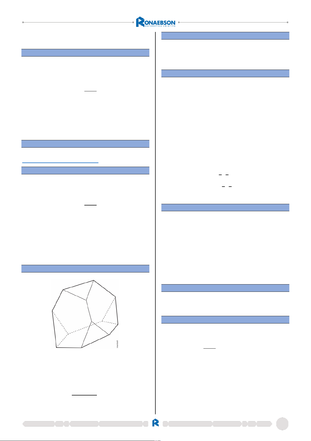1 Capítulo 29: Poliedros Resposta da questão 01: [B] Pela imagem, vemos que o poliedro possui 12 faces pentagonais, e de cada uma delas partem 5 lados de polígonos. Unindo-os dois a dois, temos o total de arestas do poliedro: 𝐴 = 12 ⋅ 5 2 𝐴 = 30 Pela Relação de Euler, descobrimos o total de vértices do poliedro: 𝑉 + 𝐹 = 𝐴 + 2 𝑉 + 12 = 30 + 2 𝑉 = 20 Resposta da questão 02: [D] Resolução em Vídeo: https://youtu.be/YX2QN4mAWn8 Resposta da questão 03: [A] Cada uma das 20 faces triangulares possui 3 lados de polígonos, unindo-os dois a dois obtemos a quantidade de arestas do icosaedro correspondente: 𝐴 = 20 ⋅ 3 2 𝐴 = 30 Como há uma espícula em cada vértice, então o total de espículas é igual ao total de vértices, que pode ser encontrado pela Relação de Euler: 𝑉 + 𝐹 = 𝐴 + 2 𝑉 + 20 = 30 + 2 𝑉 = 12 Resposta da questão 04: [D] O sólido resultante da divisão proposta pelo problema será formado por 4 faces hexagonais e 4 faces triangulares. Sabendo que cada aresta mede 2 cm e o número de arestas será dado por: 𝐴 = 4 ∙ 6 + 4 ∙ 3 2 = 18 temos que a soma das medidas de todas as arestas será: 18 × 2 = 36 𝑐𝑚 Resposta da questão 05: [E] O único desenho que pode ser reproduzido em um modelo tridimensional real é o octaedro regular da alternativa (E). Resposta da questão 06: [E] Como a questão diz que a área do cubo é numericamente igual ao seu volume, podemos descobrir o valor da aresta do cubo inicial: 𝐴!"#$ = 𝑉!"#$ 6 ⋅ 𝑎% = 𝑎& 𝑎 = 6 Pela sequência de cortes, percebemos que o yangma possui um terço do volume do lifang, uma vez que possui a mesma base e a mesma altura (𝑎), e, como o yangma é dividido em dois bienuam iguais, então o volume de cada bienuam é metade do volume do yangma, sendo assim, descobrimos o volume do bienuam: 𝑉# = 1 2 ⋅ 1 3 ⋅ 𝑉!"#$ 𝑉# = 1 2 ⋅ 1 3 ⋅ 6 & 𝑉# = 36 𝑢𝑛𝑖𝑑𝑎𝑑𝑒𝑠 𝑑𝑒 𝑣𝑜𝑙𝑢𝑚𝑒 Resposta da questão 07: [C] Sabendo que o poliedro possui 32 vértices, tem-se 𝑉 = 32. Por conseguinte, sendo F e A, respectivamente, o número de faces e o número de arestas, pelo Teorema de Euler, vem 𝑉 + 𝐹 = 𝐴 + 2 → 32 + 𝐹 = 𝐴 + 2 𝐹 = 𝐴 − 30. Daí, como o poliedro possui apenas faces triangulares, temos 3𝐹 = 2𝐴 e, portanto, 3(𝐴 − 30) = 2𝐴 → 𝐴 = 90. Resposta da questão 08: [A] O sólido da figura é um icosaedro. Portanto, só pode ser a alternativa [A]. Resposta da questão 09: [D] Para o dodecaedro regular, temos: 12 faces pentagonais. 12 ∙ 5 2 = 30 𝑎𝑟𝑒𝑠𝑡𝑎𝑠 Utilizando a relação de Euler, temos: 𝑉 − 𝐴 + 𝐹 = 2 → 2 + 30 − 12 → 𝑉 = 20 (𝑣�́�𝑟𝑡𝑖𝑐𝑒𝑠) Portanto, o poliedro formado terá: 12 + 12 − 2 = 22 𝑓𝑎𝑐𝑒𝑠 (𝐹 = 22) 30 + 30 − 5 = 55 𝑎𝑟𝑒𝑠𝑡𝑎𝑠 (𝐴 = 55) 20 + 20 − 5 = 35 𝑣�́�𝑟𝑡𝑖𝑐𝑒𝑠 (𝑉 = 35) A soma pedida será dada por: 𝑉 + 𝐹 + 𝐴 = 35 + 22 + 55 = 112. 2 Resposta da questão 10: [C] A molécula possui um total de 32 faces. Cada uma das 12 faces pentagonais possui 5 lados, e cada uma das 20 faces hexagonais possui 6 lados, unindo os lados de polígono dois a dois, obtemos o total de arestas da molécula: 𝐴 = 12 ⋅ 5 + 20 ⋅ 6 2 𝐴 = 60 + 120 2 𝐴 = 90 Como cada vértice representa um átomo de carbono, o total de átomos é igual ao total de vértices, que pode ser descoberto pela Relação de Euler: 𝑉 + 𝐹 = 𝐴 + 2 𝑉 + 32 = 90 + 2 𝑉 = 60 Resposta da questão 11: [A] Número de arestas: ((%×*) % = 30. Número de arestas visíveis: 20. Número de arestas não visíveis: 30 – 20 = 10. Resposta da questão 12: [C] O octaedro possui 6 vértices. Ao retirarmos uma pirâmide regular de base quadrangular de cada vértice do octaedro, obtemos um octaedro truncado com 6 × 4 = 24 vértices. Portanto, a resposta é 360° × (24 − 2) = 7920°. Resposta da questão 13: [B] Dada a desigualdade 𝐴 + 6 ≤ 3𝑉 ≤ 2𝐴 e usando 𝐴 = 25 , resolvemos separadamente as inequações para achar os valores mínimo e máximo para a quantidade de vértices da geodésica em questão: I) 𝐴 + 6 ≤ 3𝑉 25 + 6 ≤ 3𝑉 31 ≤ 3𝑉 𝑉 ≥ 10,333… Logo, como o número de vértices precisa ser inteiro, a quantidade mínima é 11. II) 3𝑉 ≤ 2𝐴 3𝑉 ≤ 2 ⋅ 25 3𝑉 ≤ 50 𝑉 ≤ 16,666… Logo, como o número de vértices precisa ser inteiro, a quantidade máxima é 16. Resposta da questão 14: [E] 𝐴 = 8.3 2 = 12 𝑒 𝐹 = 8 𝐿𝑜𝑔𝑜, 𝑉–𝐴 + 𝐹 = 2 𝑉 – 12 + 8 = 2 𝑉 = 6 Resposta da questão 15: [C] F: número de faces A: número de arestas V: número de vértices 𝐴 = 20 × 6 + 12 × 5 2 = 90 𝐹 = 32 𝑉 = 2 + 𝐴–𝐹 𝑉 = 2 + 90 – 32 𝑉 = 60. Resposta da questão 16: [D] Do enunciado, o número máximo de imagens distintas do botão, que podem ser vistas por João é dado por: 𝑁 = 360° 60° − 1 = 5 Resposta da questão 17: [D] Total de faces: 𝐹 = 32 (12 pentagonais e 20 hexagonais) Total de Arestas: 𝐴 = 12 ∙ 5 + 20 ∙ 6 2 = 90 Total de vértices (V): 𝑉 − 𝐴 + 𝐹 = 2 𝑉 − 90 + 32 = 2 𝑉 = 60 Portanto, 90 arestas e 60 vértices. Resposta da questão 18: [E] Resolução em Vídeo: https://youtu.be/NBSgvMObvLQ Resposta da questão 19: [A] A única alternativa que apresenta a propriedade dos poliedros regulares que justifica o fato de a cavidade no interior da esfera ser octaédrica é a alternativa [A]. As alternativas [C] e [D] apresentam assertivas corretas, porém não justificam o fato supra. Resposta da questão 20: [E] Cada face triangular possui 3 lados, e como cada lado é contado duas vezes quando se forma o poliedro, o total de Arestas é dado por 𝐴 = &⋅- % . Substituindo essa equação na relação de Euler, temos: 𝑉 + 𝐹 = 𝐴 + 2 20 + 𝐹 = 3𝐹 2 + 2 𝐹 2 = 18 𝐹 = 36 𝑓𝑎𝑐𝑒𝑠 3 Resposta da quest