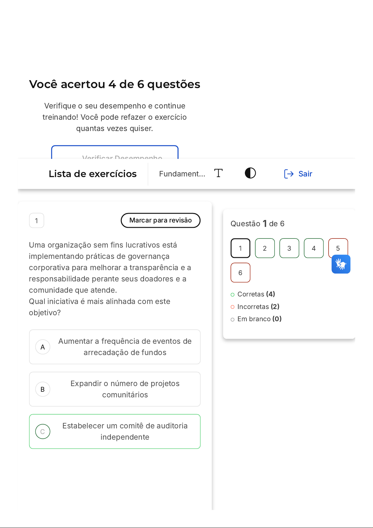 Você acertou 4 de 6 questões Verifique o seu desempenho e continue treinando! Você pode refazer o exercício quantas vezes quiser. Verificar Desempenho A B C 1 Marcar para revisão Uma organização sem fins lucrativos está implementando práticas de governança corporativa para melhorar a transparência e a responsabilidade perante seus doadores e a comunidade que atende. Qual iniciativa é mais alinhada com este objetivo? Aumentar a frequência de eventos de arrecadação de fundos Expandir o número de projetos comunitários Estabelecer um comitê de auditoria independente Questão 1 de 6 Corretas 4 Incorretas 2 Em branco 0 1 2 3 4 5 6 Lista de exercícios Fundament… Sair D E Lançar uma nova campanha de marketing Focar na contratação de voluntários Resposta correta Parabéns, você selecionou a alternativa correta. Confira o gabarito comentado! Gabarito Comentado Ao implementar práticas de governança corporativa, uma organização sem fins lucrativos deve se concentrar na transparência e responsabilidade. Estabelecer um comitê de auditoria independente é uma medida que reforça a governança ao proporcionar supervisão e avaliação objetiva das operações financeiras, assegurando a transparência e a responsabilidade perante os doadores e a comunidade 2 Marcar para revisão Entre as diversas atividades da área de finanças corporativas, uma que se destaca é o planejamento e controle financeiro, devido à sua relevância para o cumprimento do plano estratégico da empresa. Nesse sentido, podemos definir o planejamento e controle financeiro como o processo de: A B C D E Planejamento e contingenciamento dos recursos financeiros, físicos e humanos, que objetiva garantir o bom funcionamento operacional da empresa, em concordância com seu plano estratégico. Planejamento e contingenciamento dos recursos financeiros corporativos, que objetiva garantir o bom funcionamento de todas as áreas da empresa, em concordância com os objetivos definidos pela área financeira. Planejamento e contingenciamento dos recursos financeiros corporativos, que objetiva garantir o bom funcionamento operacional da empresa, em concordância com seu plano estratégico. Planejamento e contingenciamento de todos os recursos corporativos, que objetiva garantir o bom funcionamento da área financeira da empresa, em concordância com seu plano estratégico. Planejamento e contingenciamento dos recursos financeiros corporativos, que objetiva garantir o bom funcionamento operacional das áreas financeira e contábil da empresa, em concordância com seu plano de marketing. Resposta correta A B C Parabéns, você selecionou a alternativa correta. Confira o gabarito comentado! Gabarito Comentado O planejamento e controle financeiro é um processo que visa garantir o bom funcionamento operacional da empresa, em concordância com seu plano estratégico. Para isso, é necessário planejar e contingenciar os recursos financeiros corporativos, de forma a garantir que a empresa tenha recursos suficientes para cumprir suas metas e objetivos. 3 Marcar para revisão Um varejista está enfrentando dificuldades devido a um planejamento financeiro inadequado. Isso resultou em fluxos de caixa desbalanceados e falta de fundos para operações críticas. Qual deve ser a primeira ação da empresa para resolver essa situação? Diversificar as fontes de receita Renegociar dívidas com fornecedores Revisar e ajustar o planejamento financeiro D E Investir em campanhas de marketing agressivas Contratar mais funcionários para vendas Resposta correta Parabéns, você selecionou a alternativa correta. Confira o gabarito comentado! Gabarito Comentado Diante de problemas com fluxos de caixa e falta de fundos, a ação mais imediata e eficaz é revisar e ajustar o planejamento financeiro. Isso ajudará a empresa a realinhar suas finanças com suas necessidades operacionais, abordando diretamente as causas raízes dos problemas financeiros. 4 Marcar para revisão Uma empresa de tecnologia está revisando seu planejamento financeiro anual. O foco é aprimorar o alinhamento entre os recursos financeiros e as metas estratégicas. Eles estão considerando ajustes no orçamento com base no desempenho do último trimestre. Qual aspecto do planejamento e controle financeiro é mais relevante para esta empresa neste momento? A B C D E Expansão de mercado Aquisição de novos equipamentos Ajuste de orçamento baseado no desempenho passado Lançamento de novos produtos Aumento de capital social Resposta correta Parabéns, você selecionou a alternativa correta. Confira o gabarito comentado! Gabarito Comentado A empresa está focada em alinhar seus recursos financeiros com as metas estratégicas, revisando o planejamento financeiro com base no desempenho recente. Isso indica que o ajuste de orçamento, conforme o desempenho passado, é a opção mais relevante, pois reflete diretamente a necessidade de realinhar as projeções e recursos com os resultados atuais. 5 Marcar para revisão Entre diversas ferramentas de gestão, há quatro que se destacam no processo de A B C D E aperfeiçoamento contínuo da gestão das empresas: o planejamento e controle financeiro, a governança corporativa, o compliance e os ERP. Considerando o papel de cada ferramenta e a interação entre elas, o mais correto seria afirmar que: O planejamento financeiro e controle é fundamental para implantação bem- sucedida dos ERPs, do compliance e da governança. A governança e compliance são fundamentais para implantação bem- sucedida dos ERPs e do planejamento financeiro e controle. Os ERPs são fundamentais para implementação do planejamento e controle financeiro, da governança corporativa e do compliance. O compliance é fundamental para implantação bem-sucedida do planejamento financeiro e controle, dos ERPs e da governança. A governança e os ERPs são fundamentais para implantação bem- sucedida do planejamento financeiro e controle e do complian