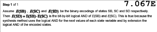 Step 1 of 1 7.067E Assume E(SB) , E(SC) and E(SD) be the binary encodings of states SB, SC and SD respectively. Then E(SD) = is the bit-by-bit logical AND of E(SB) and E(SC). This is true because the synthesis method uses the logical AND for the next values of each state variable and by extension the logical AND of the encoded states.