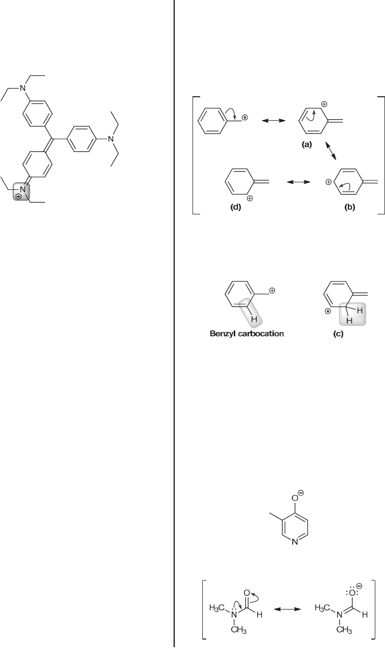 64 CHAPTER 2 (b) The positive charge in basic violet 4 is expected to be more stabilized than the positive charge in basic green 4, because the former is delocalized over thirteen positions, rather than twelve. Specifically, basic violet 4 has an additional resonance structure that basic green 4 lacks, shown below: In basic violet 4, the positive charge is spread over three nitrogen atoms and ten carbon atoms. 2.75. Polymer 2 contains only ester groups, so the IR spectrum of polymer 2 is expected to exhibit a signal near 1740 cm-1 (typical for esters), associated with vibrational excitation (stretching) of the C=O bond. Polymer 4 lacks any ester groups, so the signal near 1740 cm-1 is expected to be absent in the IR spectrum of polymer 4. Instead, polymer 4 has OH groups, which are expected to produce a broad signal in the range 3200- 3600 cm-1. Polymer 3 has both functional groups (alcohol group and ester group), so an IR spectrum of polymer 3 is expected to exhibit both characteristic signals. When polymer 3 is converted to polymer 4, the signal near 1740 cm-1 is expected to vanish, which would indicate complete hydrolysis of polymer 3. In practice, the signal for the C=O stretch in polymer 2 appears at 1733 cm-1, which is very close to our estimated value of 1740 cm-1. 2.76. Compound 1 has an OH group, which is absent in compound 2. Therefore, the IR spectrum of 1 should exhibit a broad signal in the range 3200-3600 cm-1 (associated with O-H stretching), while the IR spectrum of 2 would be expected to lack such a signal. The conversion of 1 to 2 could therefore be confirmed with the disappearance of the signal corresponding with excitation of the O-H bond. Another way to monitor the conversion of 1 to 2 is to focus on the C-H bond of the aldehyde group in compound 1, which is expected to produce a signal in the range 2750-2850 cm-1. Since the aldehyde group is not present in compound 2, we expect this signal to vanish when 1 is converted to 2. There is yet another way to monitor this reaction with IR spectroscopy. Compound 1 possesses only one C=O bond, while compound 2 has two C=O bonds. As such, the latter should exhibit two C=O signals. One signal is expected to be near 1680 cm-1 (for the conjugated ketone), and the other signal should be near 1700 cm-1 (corresponding to the conjugated ester). In contrast compound 1 has only one C=O bond, which is expected to produce a signal near 1680 cm-1 (for the conjugated aldehyde). Therefore, the conversion of 1 to 2 can be monitored by the appearance of a signal near 1700 cm-1. 2.77. Structures (a), (b) and (d) are all significant resonance structures, as shown: Structure (c) is not a resonance form at all. To see this more clearly, notice that the benzyl carbocation does not have any CH2 groups in the ring, but structure (c) does have a CH2 group in the ring: Resonance structures differ only in the placement of electrons. Since structure (c) differs in the connectivity of atoms, it cannot be considered a resonance structure of the benzyl carbocation. Therefore, the answer is (c). 2.78. The atoms in all four structures have complete octets. So we must consider the location of the negative charge. Structure (a) has a negative charge on an electronegative atom (oxygen). A negative charge is more stable on the more electronegative atom (oxygen) than it is on a nitrogen atom or a carbon atom. Therefore, structure (a) will contribute the most character to the resonance hybrid: 2.79. The nitrogen atom in structure (a) is delocalized by resonance, and is therefore sp2 hybridized: www.MyEbookNiche.eCrater.com