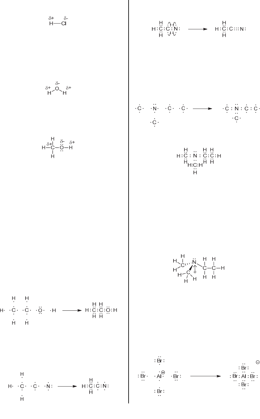 16 CHAPTER 1 will be electron rich (‒), and the H will be electron-poor (+), as shown below: (c) According to Table 1.1, the difference in electronegativity between O and H is 3.5 – 2.1 = 1.4, so an O–H bond is expected to be polar covalent. Oxygen is more electronegative than hydrogen, so for each O–H bond, the O will be electron rich (‒) and the H will be electron-poor (+), as shown below: (d) Oxygen (3.5) is more electronegative than carbon (2.5) or hydrogen (2.1), and a C–O or H–O bond is polar covalent. For each C–O or H–O bond, the O will be electron rich (‒), and the C or H will be electron-poor (+), as shown below: 1.38. (a) The difference in electronegativity between Na (0.9) and Br (2.8) is greater than the difference in electronegativity between H (2.1) and Br (2.8). Therefore, NaBr is expected to have more ionic character than HBr. (b) The difference in electronegativity between F (4.0) and Cl (3.0) is greater than the difference in electronegativity between Br (2.8) and Cl (3.0). Therefore, FCl is expected to have more ionic character than BrCl. 1.39. (a) Each carbon atom has four valence electrons, the oxygen atom has six valence electrons, and each hydrogen atom has one valence electron. In this case, the information provided in the problem statement (CH3CH2OH) indicates how the atoms are connected to each other: (b) Each carbon atom has four valence electrons, the nitrogen atom has five valence electrons, and each hydrogen atom has one valence electron. In this case, the information provided in the problem statement (CH3CN) indicates how the atoms are connected to each other: The unpaired electrons are then paired up to give a triple bond. In this way, each of the atoms achieves an octet. 1.40. Each of the carbon atoms has four valence electrons; the nitrogen atom has five valence electrons; and each of the hydrogen atoms has one valence electron. We begin by connecting the atoms that have more than one bond (in this case, the four carbon atoms and the nitrogen atom). The problem statement indicates how we should connect them: Then, we connect all of the hydrogen atoms, as shown. The nitrogen atom has three bonds and one lone pair, so the steric number is 4, which means that the arrangement of electron pairs is expected to be tetrahedral. One corner of the tetrahedron is occupied by a lone pair, so the geometry of the nitrogen atom (the arrangement of atoms around that nitrogen atom) is trigonal pyramidal. As such, the individual dipole moments associated with the C–N bonds do not fully cancel each other. There is a net molecular dipole moment, as shown: 1.41. Bromine is in group 7A of the periodic table, so each bromine atom has seven valence electrons. Aluminum is in group 3A of the periodic table, so aluminum is supposed to have three valence electrons, but the structure bears a negative charge, which means that there is one extra electron. That is, the aluminum atom has four valence electrons, rather than three, which is why it has a formal negative charge. This gives the following Lewis structure: www.MyEbookNiche.eCrater.com