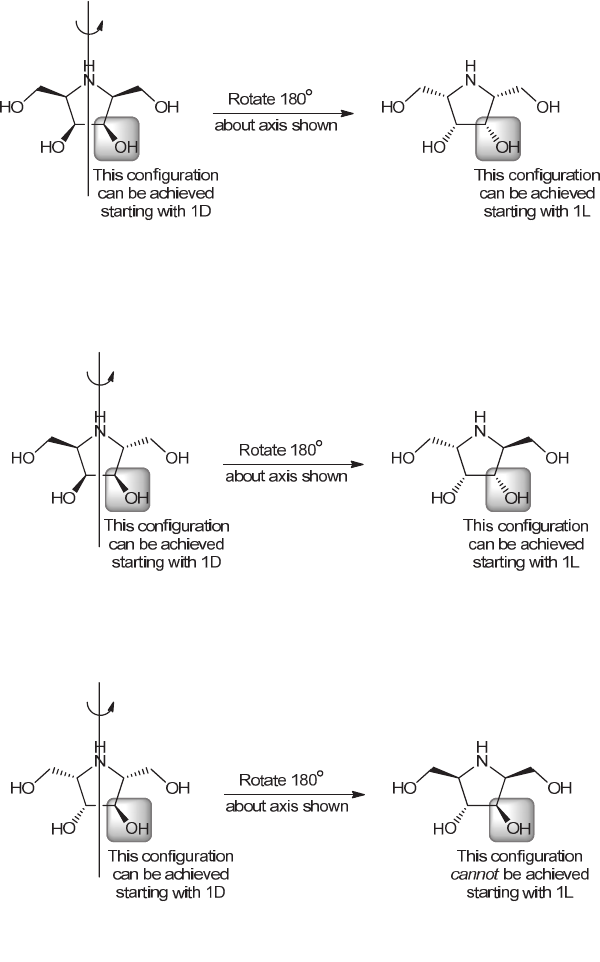 158 CHAPTER 5 Now we look at the configuration of the chiral center in the bottom right corner of each drawing above (highlighted in gray). Notice that they have opposite configuration. This is the necessary feature that enables this compound to be accessible from either 1D or from 1L. Here is another example: Once again, this stereoisomer will be accessible from either 1D or from 1L. In contrast, the first six structures (in the answer to part c) do not have this feature. For example, consider the first structure: let’s draw it, rotate it 180 degrees, and then inspect the configuration in the bottom right corner of each drawing: Note that in this case, the configuration in the bottom right corner of each drawing of this structure is the same. Therefore, this stereoisomer can ONLY be made from 1D. It cannot be made from 1L. A similar analysis for the first six stereoisomers (in the answer to part c) shows that all six of these stereoisomers require a specific enantiomer for the starting material. Only the last four stereoisomers can be made from either 1D or from 1L. www.MyEbookNiche.eCrater.com