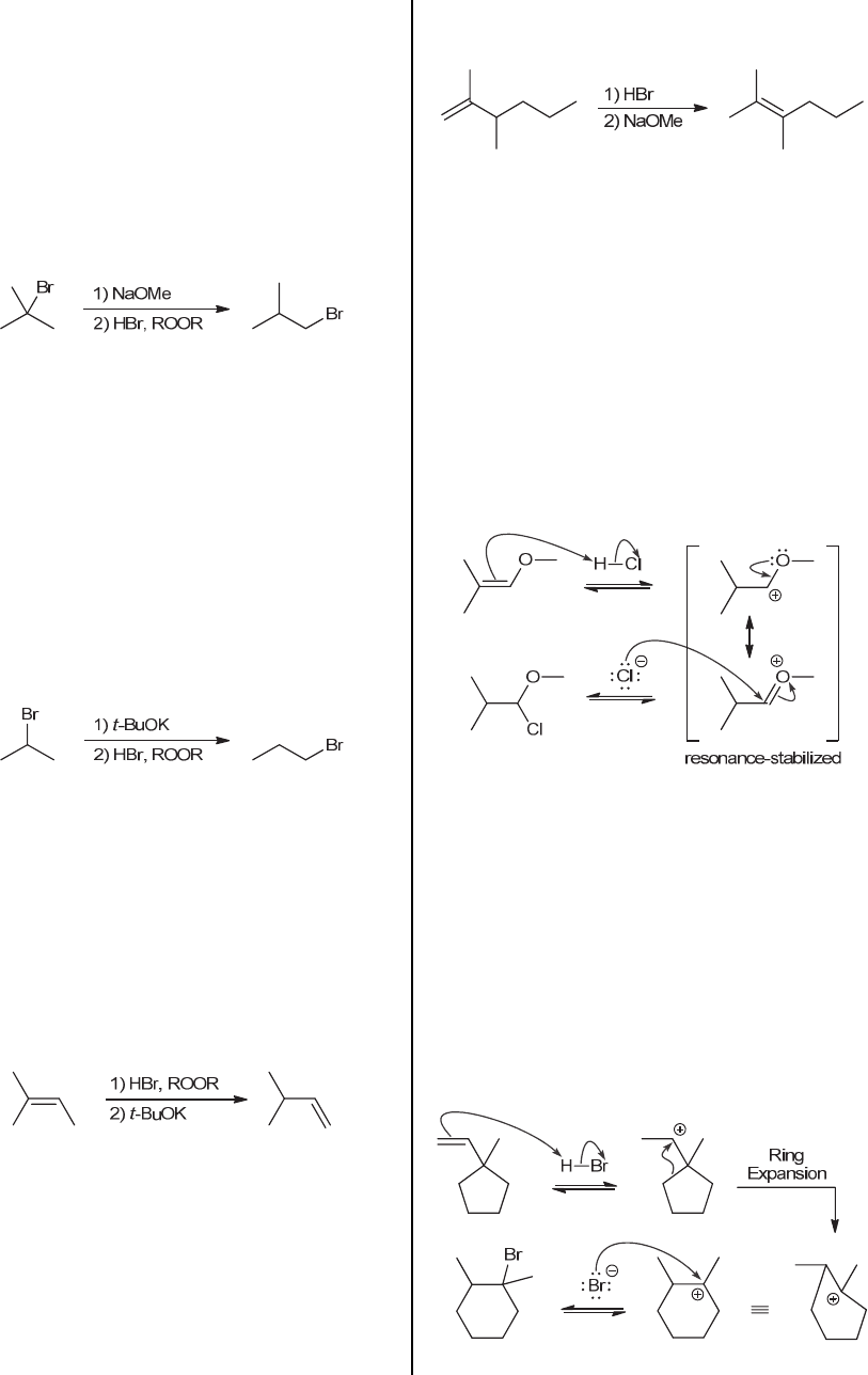 CHAPTER 8 265 8.69. (a) Begin by drawing the starting alkyl halide. This tertiary alkyl halide can be converted into a primary alkyl halide via a two-step process (elimination followed by addition). In each case, we must carefully consider the regiochemical outcome. During the elimination process, there is only one regiochemical outcome, so any strong base will work (even if it is sterically hindered, although that is not necessary). In the addition process, we want to install Br at the less-substituted position, so we will need an anti-Markovnikov addition of HBr (using peroxides): (b) Begin by drawing the starting alkyl halide. This secondary alkyl halide can be converted into a primary alkyl halide via a two-step process (elimination followed by addition). In each case, we must carefully consider the regiochemical outcome. During the elimination process, there is only one regiochemical outcome, so any strong base will work (even if it is sterically hindered). In fact, in this case, there is a distinct advantage to using a sterically hindered base. Specifically, it will suppress the competing SN2 process (the substrate is secondary, so SN2 should be a minor product, unless a sterically hindered base is used). During the addition process, we want to install Br at the less-substituted position, so we will need an anti-Markovnikov addition of HBr (using peroxides): 8.70. (a) Begin by drawing the starting alkene. This trisubstituted alkene can be converted into a monosubstituted alkene via a two-step process (addition, followed by elimination). We must be careful to control the regiochemical outcome of each step of the process. During the addition reaction, we want to install Br at the less-substituted position, so we treat the alkene with HBr in the presence of peroxides. Then, the elimination reaction must be performed in a way that gives the less- substituted alkene, so we must use a strong, sterically hindered base (such as tert-butoxide). (b) Begin by drawing the starting alkene. This disubstituted alkene can be converted into a tetrasubstituted alkene via a two-step process (addition, followed by elimination). We must be careful to control the regiochemical outcome of each step of the process. During the addition reaction, we want to install Br at the more-substituted position, so we treat the alkene with HBr (without peroxides). Then, the elimination process must be performed in a way that gives the more- substituted alkene, so we must use a strong base that is not sterically hindered, such as methoxide (hydroxide or ethoxide can also be used). 8.71. Since this reaction proceeds through an ionic mechanism, we expect the mechanism to be comprised of two steps: 1) proton transfer, followed by 2) nucleophilic attack. In the first step, a proton is transferred from HCl to the alkene, which requires two curved arrows, as shown below. There are two possible regiochemical outcomes for the protonation step, and we might have expected formation of a tertiary carbocation. However, in this particular case, the other regiochemical outcome is favored because it involves formation of a resonance-stabilized cation. As a result of resonance stabilization, this cation is even more stable than a tertiary carbocation, and the reaction proceeds via the more stable intermediate. This cation is then captured by a chloride ion in the second step of the mechanism, which requires two curved arrows, as shown: 8.72. Protonation of the alkene requires two curved arrows, as shown in the first step of the following mechanism. This leads to the more stable, secondary carbocation (rather than a primary carbocation). This secondary carbocation then undergoes a rearrangement, in which one of the carbon atoms of the ring migrates (as described in the problem statement). This is represented with one curved arrow that shows the formation of a more stable, tertiary carbocation. In the final step of the mechanism (nucleophilic attack), the carbocation is captured by a bromide ion. This step requires one curved arrow, going from the nucleophile (bromide) to the electrophile (the carbocation), as shown: www.MyEbookNiche.eCrater.com