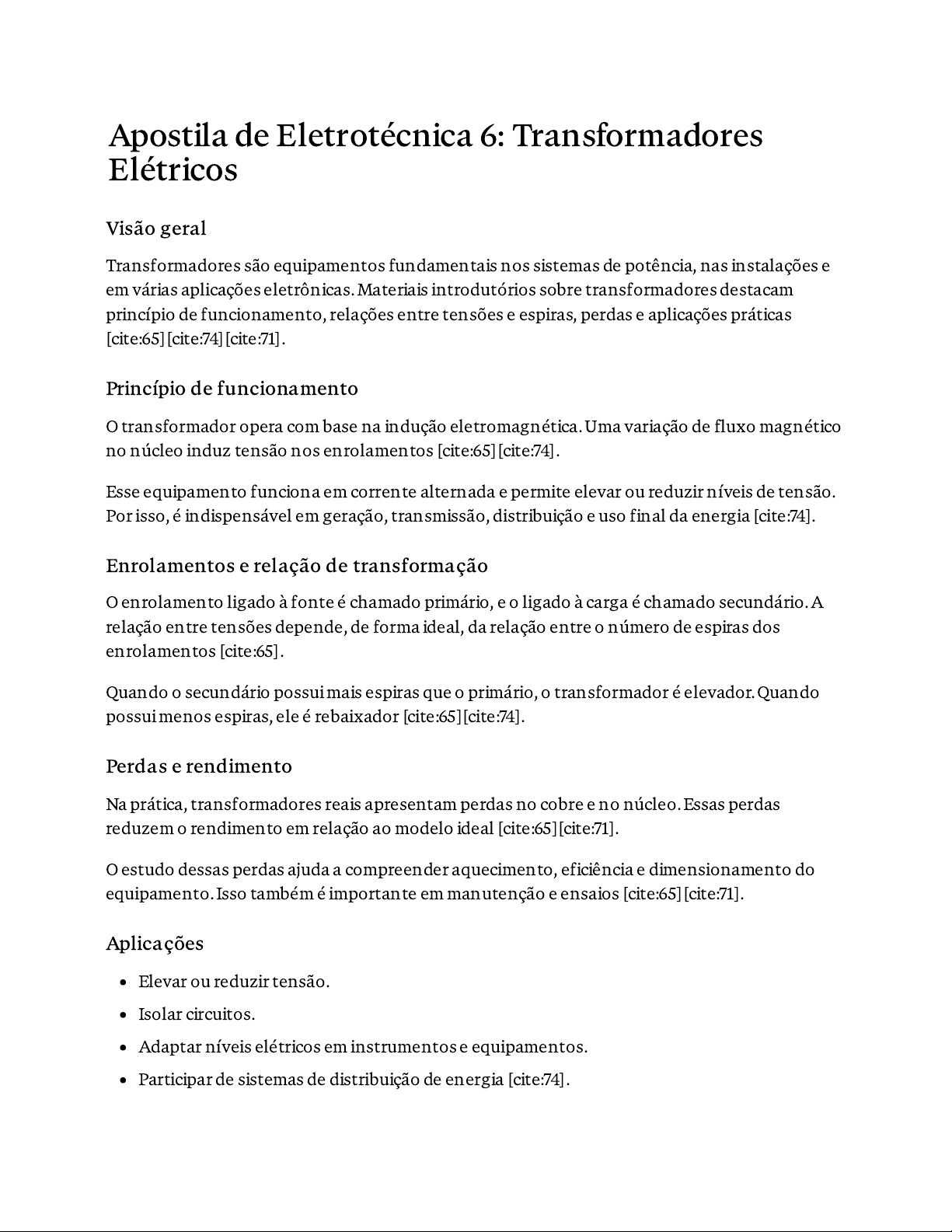 Transformadores são equipamentos fundamentais nos sistemas de potência, nas instalações e em várias aplicações eletrônicas. Materiais introdutórios sobre transformadores destacam princípio de funcionamento, relações entre tensões e espiras, perdas e aplicações práticas [cite:65][cite:74][cite:71]. O transformador opera com base na indução eletromagnética. Uma variação de fluxo magnético no núcleo induz tensão nos enrolamentos [cite:65][cite:74]. Esse equipamento funciona em corrente alternada e permite elevar ou reduzir níveis de tensão. Por isso, é indispensável em geração, transmissão, distribuição e uso final da energia [cite:74]. O enrolamento ligado à fonte é chamado primário, e o ligado à carga é chamado secundário. A relação entre tensões depende, de forma ideal, da relação entre o número de espiras dos enrolamentos [cite:65]. Quando o secundário possui mais espiras que o primário, o transformador é elevador. Quando possui menos espiras, ele é rebaixador [cite:65][cite:74]. Na prática, transformadores reais apresentam perdas no cobre e no núcleo. Essas perdas reduzem o rendimento em relação ao modelo ideal [cite:65][cite:71]. O estudo dessas perdas ajuda a compreender aquecimento, eficiência e dimensionamento do equipamento. Isso também é importante em manutenção e ensaios [cite:65][cite:71]. Elevar ou reduzir tensão. Isolar circuitos. Adaptar níveis elétricos em instrumentos e equipamentos. Participar de sistemas de distribuição de energia [cite:74]. Apostila de Eletrotécnica 6: Transformadores Elétricos Visão geral Princípio de funcionamento Enrolamentos e relação de transformação Perdas e rendimento Aplicações �. Em que princípio físico se baseia o transformador? �. Qual a diferença entre primário e secundário? �. Quando um transformador é elevador? �. Cite duas perdas presentes no transformador real. �. Dê um exemplo de aplicação prática. �. Indução eletromagnética. �. O primário recebe energia da fonte; o secundário entrega energia à carga. �. Quando o secundário tem tensão maior que o primário. �. Perdas no cobre e no núcleo. �. Distribuição de energia ou isolamento de circuitos [cite:74][cite:65]. Exercícios Gabarito comentado