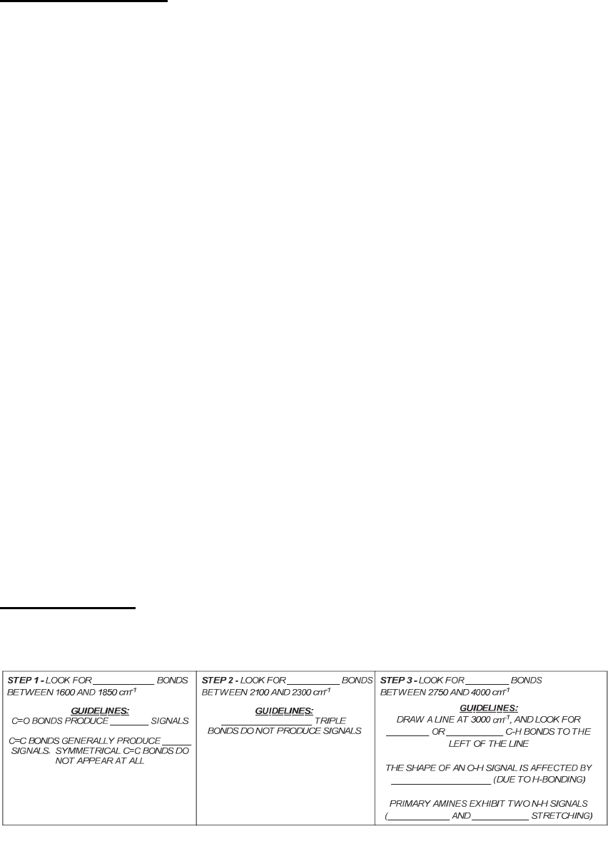 Chapter 14 Infrared Spectroscopy and Mass Spectrometry Review of Concepts Fill in the blanks below. To verify that your answers are correct, look in your textbook at the end of Chapter 14. Each of the sentences below appears verbatim in the section entitled Review of Concepts and Vocabulary. Spectroscopy is the study of the interaction between _______ and ________. The difference in energy (ΔE) between vibrational energy levels is determined by the nature of the bond. If a photon of light possesses exactly this amount of energy, the bond can absorb the photon to promote a __________________ excitation. IR spectroscopy can be used to identify which _____________________ are present in a compound. The location of each signal in an IR spectrum is reported in terms of a frequency-related unit called _________________. The wavenumber of each signal is determined primarily by bond __________ and the __________ of the atoms sharing the bond. The intensity of a signal is dependent on the ______________ of the bond giving rise to the signal. _________________ C=C bonds do not produce signals. Primary amines exhibit two signals resulting from ___________ stretching and _____________ stretching. Mass spectrometry is used to determine the ___________________ and ________________________ of a compound. Electron impact ionization (EI) involves bombarding the compound with high energy _______________, generating a radical cation that is symbolized by (M)+• and is called the molecular ion, or the __________ ion. Only the molecular ion and the cationic fragments are deflected, and they are then separated by their ____________________ (m/z). The tallest peak in a mass spectrum is assigned a relative value of 100% and is called the __________ peak. The relative heights of the (M)+• peak and the (M+1)+• peak indicates the number of ___________________. A signal at M15 indicates the loss of a _________ group; a signal at M29 indicates the loss of an _________ group. ______________ alkanes have a molecular formula of the form CnH2n+2. Each double bond and each ring represents one degree of _______________. Review of Skills Fill in the blanks and empty boxes below. To verify that your answers are correct, look in your textbook at the end of Chapter 14. The answers appear in the section entitled SkillBuilder Review. 14.1 Analyzing an IR Spectrum www.MyEbookNiche.eCrater.com