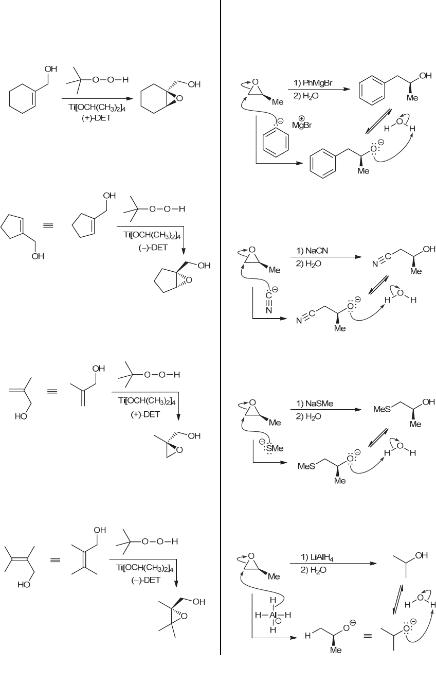 CHAPTER 13 453 13.15. (a) The allylic hydroxyl group appears in the upper right corner, so a Sharpless epoxidation with (+)-DET will generate an epoxide ring above the plane of the bond, giving the following enantiomer. (b) We begin by redrawing the compound so that the allylic hydroxyl group appears in the upper right corner. A Sharpless epoxidation with ()-DET will generate an epoxide ring below the plane of the bond, giving the following enantiomer. (c) We begin by redrawing the compound so that the allylic hydroxyl group appears in the upper right corner. A Sharpless epoxidation with (+)-DET will generate an epoxide ring above the plane of the bond, giving the following enantiomer. (d) We begin by redrawing the compound so that the allylic hydroxyl group appears in the upper right corner. A Sharpless epoxidation with ()-DET will generate an epoxide ring below the plane of the bond, giving the following enantiomer. 13.16. (a) The Grignard reagent (PhMgBr) is a strong nucleophile, and it attacks the epoxide at the less substituted position. The epoxide is opened, resulting in an alkoxide ion. This alkoxide is then protonated upon treatment with water. (b) Cyanide (NC‾) is a good nucleophile, and it attacks the epoxide at the less substituted position. This opens the epoxide, resulting in an alkoxide ion, which is then protonated upon treatment with water. (c) MeS‾ is a very strong nucleophile, and it attacks the epoxide at the less substituted position. This opens the epoxide, resulting in an alkoxide ion, which is then protonated upon treatment with water. (d) LiAlH4 is a source of nucleophilic hydride (H‾), and it attacks the epoxide at the less substituted position. This opens the epoxide, resulting in an alkoxide ion, which is then protonated upon treatment with water. www.MyEbookNiche.eCrater.com
