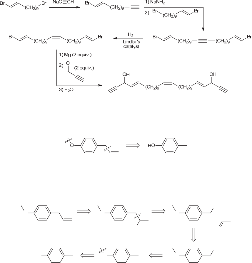 CHAPTER 12 433 a. Duryne can be made from the reaction between the bis-vinyl Grigard reagent (a dianion) and two equivalents of the aldehyde shown. b. The bis-vinyl Grignard is made from the bis-vinyl bromide and two equivalents of magnesium. c. The cis alkene is produced via reduction of the corresponding internal alkyne. d. The alkyne is made by sequentially alkylating each carbon of acetylene with E-1,11-dibromo-1-undecene. Note that while there are two bromines on this molecule, only the bromide attached to the sp3 hybridized atom carbon can serve as a leaving group in an SN2 reaction. Now let’s draw the forward scheme. The starting material, E-1,11-dibromo-1-undecene, is treated with sodium acetylide to produce a terminal alkyne. Deprotonation with sodium amide, followed by treatment with a second equivalent of E-1,11-dibromo-1-undecene gives the internal alkyne. Reduction of the alkyne with H2 and Lindlar’s catalyst affords the cis alkene. Further treatment with two equivalents of magnesium yields the bis-vinyl Grignard, which reacts with two equivalents of the aldehyde. Aqueous workup produces the target molecule, duryne. 12.67. The following synthesis is one suggested synthetic pathway. There are certainly other acceptable approaches that accomplish the same goal. By comparing the structures of the starting material (4-methylphenol) and the product, it is clear that the following bonds (indicated by wavy lines below) need to be made in this synthesis. The left bond (C-O) can be made via an SN2 process, while the right bond (C-C) can be made by either a Grignard reaction or by using an acetylide ion as a nucleophile. It is important that we make the ether bond early in our scheme to avoid an acid/base reaction between the phenolic proton (pKa ≈ 10) and the Grignard reagent or acetylide (both of which are strong bases). If the phenolic proton is subjected to a Grignard reagent, the latter would be destroyed via protonation. The same fate would occur for an acetylide ion that is treated with a compound bearing a phenolic proton. The following is a retrosynthetic analysis for our target compound. An explanation of each of the steps (a-e) follows. O O HO O O MgBr O Br OHO a de b c + a. We can make the monosubstituted alkene by converting the OH group into a tosylate group and then performing an elimination reaction with a sterically hindered base. www.MyEbookNiche.eCrater.com