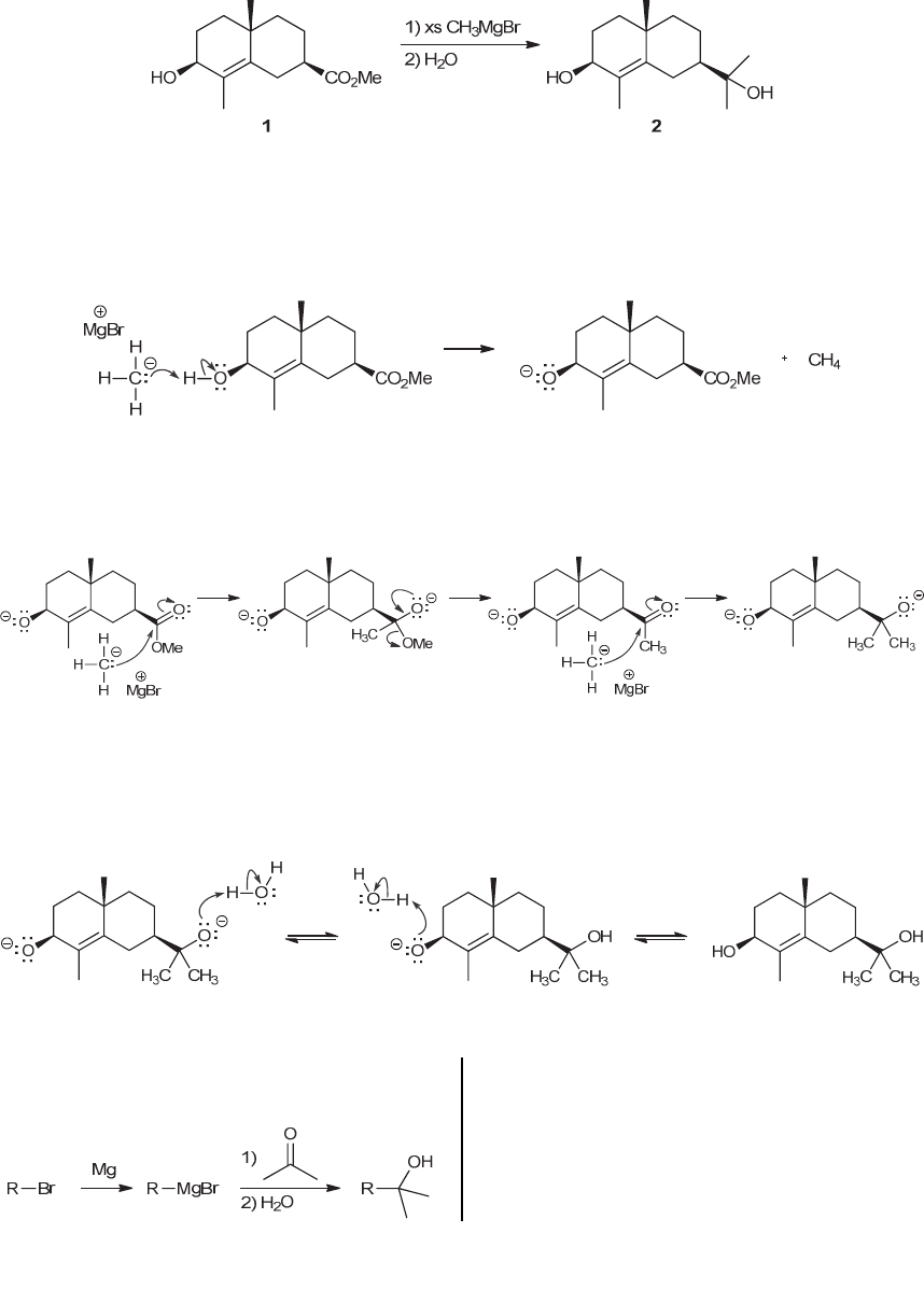 CHAPTER 12 405 12.15. (a) This synthetic transformation converts an ester to an alcohol with the installation of two new methyl groups. Both methyl groups can be installed in the same Grignard reaction, using CH3MgBr (MeMgBr), since two equivalents of a Grignard reagent will react with an ester. After the reaction is complete, an aqueous workup then gives the desired product. (b) In this case, a third equivalent of the Grignard reagent is required because of the presence of the alcohol functional group. The acidic proton of the alcohol will react with one equivalent of the Grignard reagent. (c) In the first step of the mechanism, a proton-transfer reaction occurs. One equivalent of the Grignard reagent (methyl magnesium bromide) functions as a base and removes the proton of the alcohol. This step requires two curved arrows. In the second step of the mechanism, a second equivalent of the Grignard reagent functions as a nucleophile and attacks the C=O bond of the ester. This step requires two curved arrows. The resulting intermediate then ejects a leaving group to give a ketone, which also requires two curved arrows. The ketone is then further attacked by a third equivalent of the Grignard reagent. Once again, two curved arrows are used to show the nucleophilic attack, resulting in a dianion. Finally, the dianion is then protonated upon treatment with water. There are two locations that are protonated, each of which requires two curved arrows, as shown. Notice that each anion is protonated in a separate step (this should not be drawn as one step with four curved arrows, because there are two distinct processes occurring, and it is unlikely that they occur precisely at the same moment). 12.16. (a) This type of transformation can be achieved via a Grignard reaction. However, the starting material has an OH group, which is incompatible with a Grignard reaction. To resolve this issue, we must first protect the OH group and then perform the desired Grignard reaction. Deprotection then gives the desired product, as shown. www.MyEbookNiche.eCrater.com