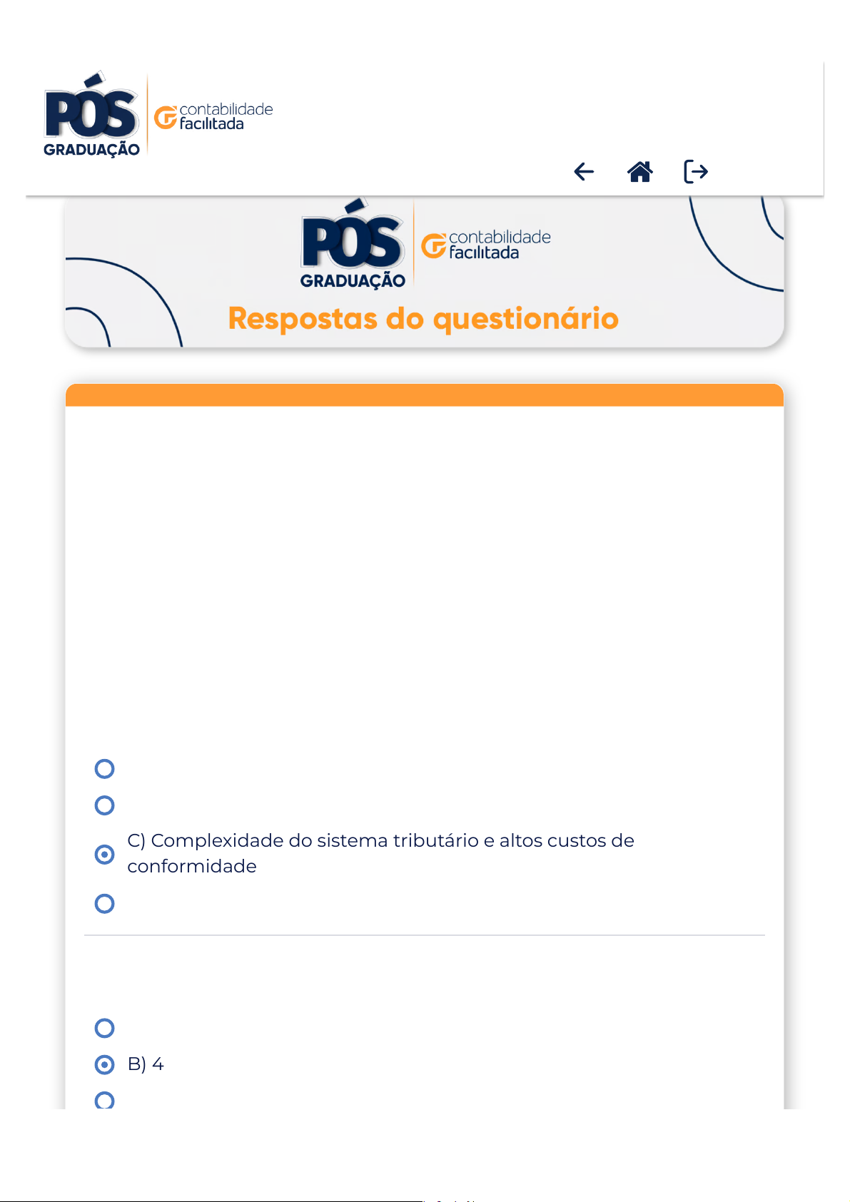 04/04/2026, 08:59Formulário de Avaliação | Contabilidade Facilitada Página 1 de 4https://acesso.contabilidadefacilitada.com/gabarito-pos?tenta…288x228696090741833730&user=1736436579848x932585219144125300 * 1 - Qual é uma das principais razões mencionadas para a urgência de revisõesQual é uma das principais razões mencionadas para a urgência de revisõesQual é uma das principais razões mencionadas para a urgência de revisõesQual é uma das principais razões mencionadas para a urgência de revisões tributárias no Brasiltributárias no Brasiltributárias no Brasiltributárias no Brasil? A) Redução dos níveis de exportação B) Aumento da transparência fiscal C) Complexidade do sistema tributário e altos custos de conformidade D) Crescimento sustentável do PIB * 2 - De acordo com a Emenda Constitucional nDe acordo com a Emenda Constitucional nDe acordo com a Emenda Constitucional nDe acordo com a Emenda Constitucional nº 132/2023, quantos impostos 132/2023, quantos impostos 132/2023, quantos impostos 132/2023, quantos impostos existentes serão substituídos por Impostos sobre o Valor Agregado (IVA)?existentes serão substituídos por Impostos sobre o Valor Agregado (IVA)?existentes serão substituídos por Impostos sobre o Valor Agregado (IVA)?existentes serão substituídos por Impostos sobre o Valor Agregado (IVA)? A) 3 B) 4 C) 5 IMPACTOS DA NOVA REFORMA TRIBUTÁRIA NA GESTÃO FISCAL
