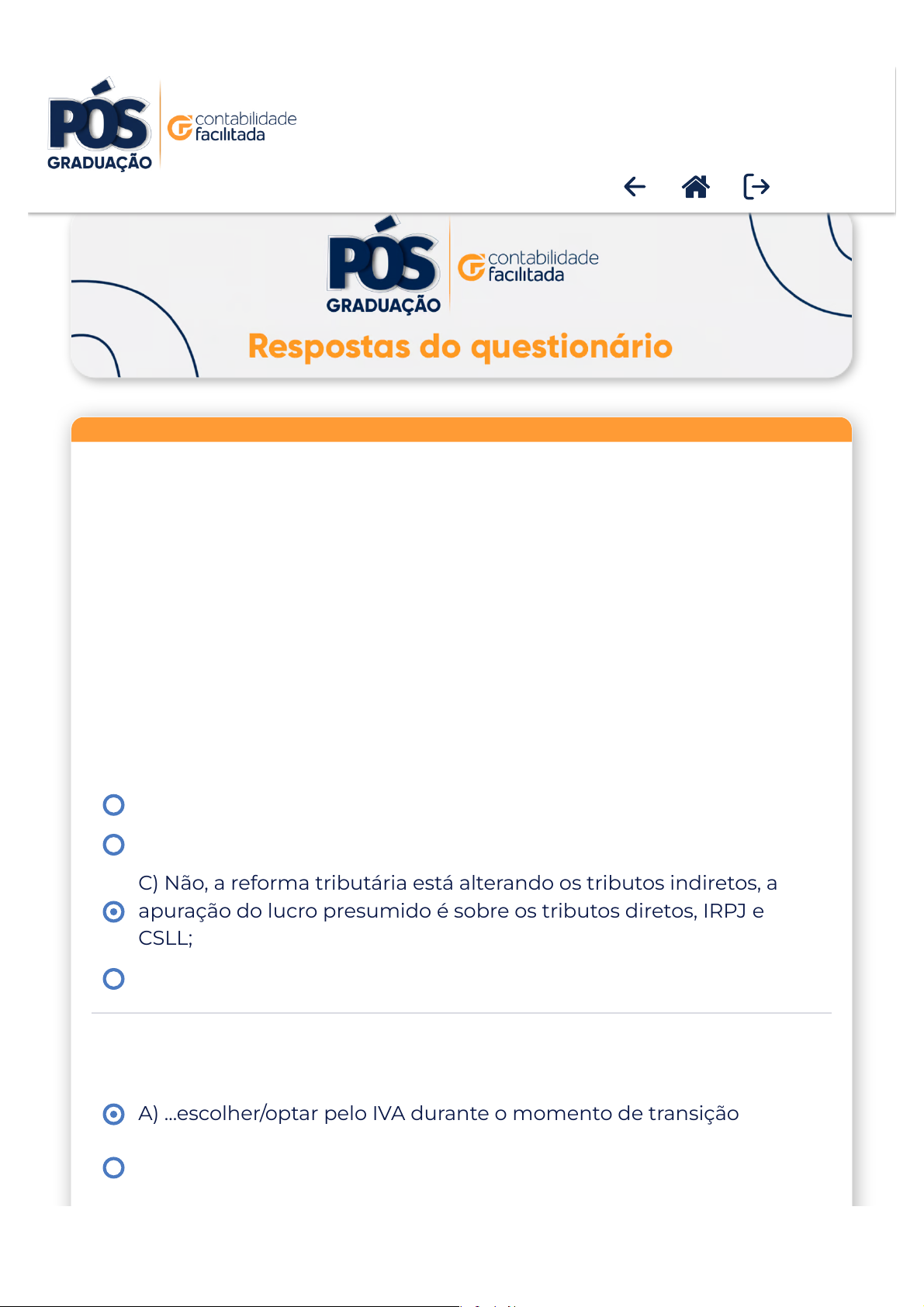 04/04/2026, 09:08Formulário de Avaliação | Contabilidade Facilitada Página 1 de 4https://acesso.contabilidadefacilitada.com/gabarito-pos?tenta…002x529848061427187700&user=1736436579848x932585219144125300 * 1 - Com a reforma tributária, considerando a Ementa Constitucional n. 132/23 dos tributos indiretos, a forma de tributação do Lucro Presumido deixará de existir? A) Sim, com certeza; B) Apenas o IRPJ passará por alterações; C) Não, a reforma tributária está alterando os tributos indiretos, a apuração do lucro presumido é sobre os tributos diretos, IRPJ e CSLL; D) Apenas o CSLL passará por alterações. * 2 - Considerando as empresas enquadradas no simples nacional, com a reforma tributária, as empresas poderão: A) ...escolher/optar pelo IVA durante o momento de transição; B) ...obrigada a participar do IVA durante todos o período de transição; TRIBUTOS FEDERAIS