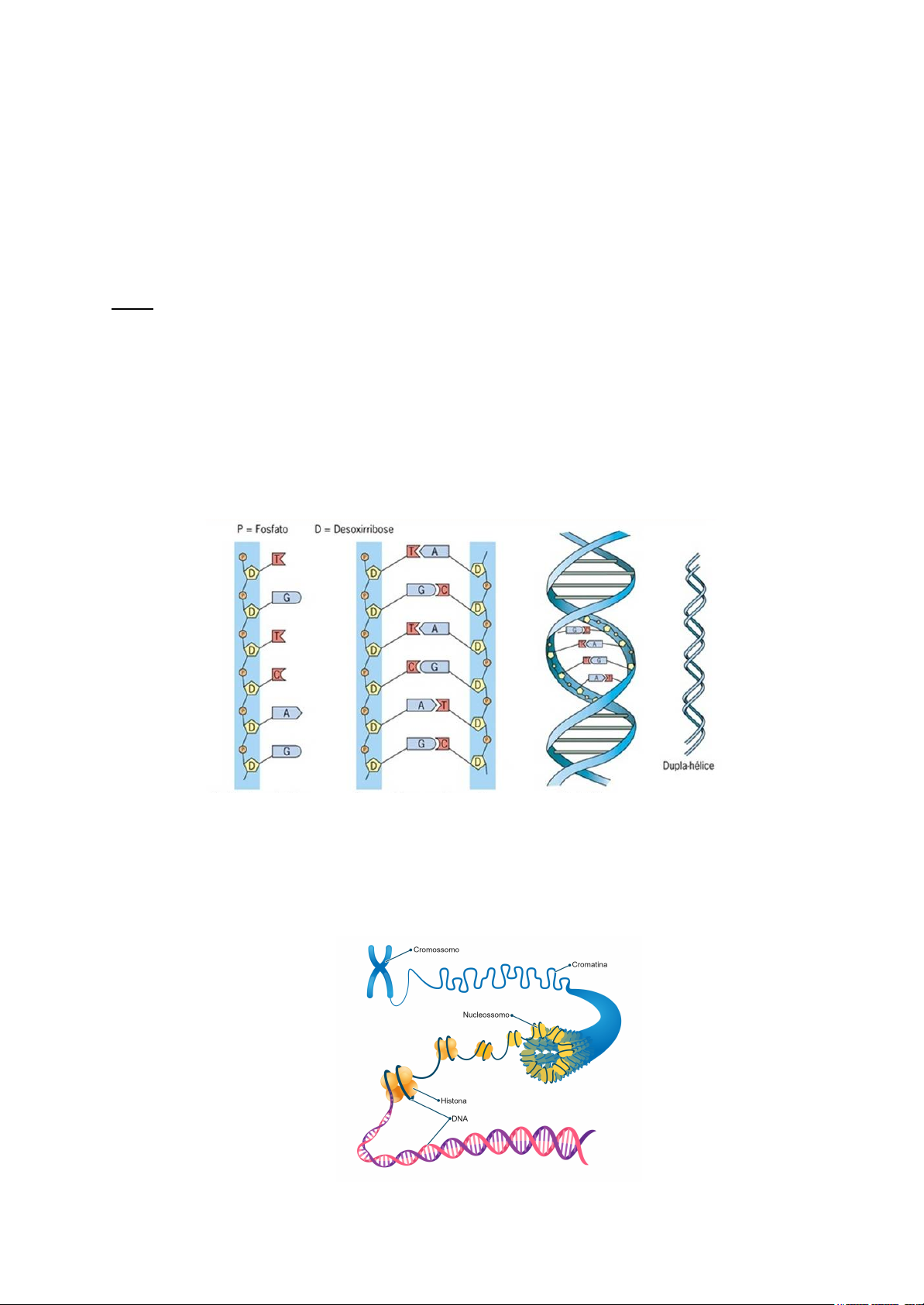 Genoma humano ● 46 cromossomos, 2 sexuais (X e Y) ● Linhagem germinativa: células que desenvolvem gametas ● Células somáticas: todas as outras células → 46 cromossomos ● Nas células somáticas → 22 cromossomos pareados (autossomos) + XX ou XY DNA ● Desoxirribose + base nitrogenada + grupo fosfato ● Bases púricas: A e G → ÁGua Pura Base pirimídicas: T, C e U ● Fitas antiparalelas: 5’ → 3’ “sentido da vida” ● Desoxirribose e fosfato no exterior ● Bases no interior ligadas por ligações de hidrogênio: A-T são 2 e C-G são 3 ● Sequência não restrita mas pareamento restrito ● Cadeias são complementares ● Replicação semiconservativa ● Pareadas reversivelmente → rompidas e formadas facilmente ● Cromatina: fita de DNA localizada no núcleo da célula e com presença de histonas (proteínas) → DNA + histonas = nucleossomos → octâmero de histonas EUCROMATINA: menos condensada → Replicação e multiplicação celular HETEROCROMATINA: mais condensada → cromossomo Sequência do genoma humano ● DNA repetitivo: LINEs, SINEs, sequências de repetição simples… ● DNA de cópia única: íntrons e éxons ● Éxons é o que realmente codifica proteínas → 2% do DNA DNA mitocondrial ● Herança materna ● Tem 37 genes Divisão celular ● Intérfase: não ocorre divisão celular → G1, S e G2 ● G1: duplicação do conteúdo celular, exceto DNA ● S: replicação do DNA → chega e sai com 46 cromossomos → chega com uma cromátide apenas e depois da duplicação fica com cromátides irmãs ● G2: checagem por erros ➢ MITOSE: equacional, para multiplicar células somáticas Prófase: formação dos centrossomos início da condensação dos cromossomos Prometáfase: rompimento do núcleo Metáfase: máximo de condensação alinhamento no plano equatorial *MELHOR FASE PARA EXAMINAR O CARIÓTIPO Anáfase: separação das cromátides irmãs Telófase: formação dos núcleos início da separação Citocinese: separação ➢ MEIOSE: reducional, para a formação de gametas Prófase I: LEPTÓTENO: início da condensação ZIGÓTENO: início das sinapses PAQUÍTENO: sinapses completas e crossing over DIPLÓTENO: sinapses desaparecem e quiasma fica visível (ponto de encontro das cromossomos homólogos) DIACINESE: fragmentação do envelope nuclear e célula pronta para metáfase Metáfase I: alinhamento no plano equatorial Anáfase I: separação dos CROMOSSOMOS HOMÓLOGOS Telófase I: formação dos núcleos e início da separação Prófase II: igual Metáfase II: igual Anáfase II: separação das CROMÁTIDES IRMÃS Telófase II: igual *ANÁFASE I SEPARA OS CROMOSSOMOS HOMÓLOGOS E ANÁFASE II SEPARA AS CROMÁTIDES IRMÃS Gametogênese humana e fertilização ● Espermatócitos ou ovócitos primários ● Meiose feminina iniciada durante a vida fetal, parando e voltando quando necessário e número limitado de células ● Meiose masculina iniciada na puberdade, ocorre por todas a vida do homem e muitas células ➢ ESPERMATOGÊNESE: iniciada na puberdade espermatogônia espermatócito primário: 2n, meiose I espermatócito secundário: n, meiose II espermátide (célula no fim dessa meiose) se diferencia em espermatozóides feita continuamente ➢ OVOCITOGÊNESE: iniciada no desenvolvimento fetal ovogônia desenvolve em ovócito primário (2n) por volta do 3 mês de desenvolvimento fetal → meiose I - prófase I → PARA AQUI maioria dos ovócitos primários degeneram pouco antes da ovulação, o ovócito completa a meiose I → ovócito secundário (n) e primeiro glomérulo polar (n) se ocorrer fertilização, a meiose II vai ser concluída e o segundo glomérulo polar vai aparecer ➢ FECUNDAÇÃO: penetração do espermatozoide no ovócito conclusão da meiose II no ovócito e formação do segundo glomérulo polar zigoto diploide → várias mitoses RELEVÂNCIA CLÍNICA: garantia da constância do número de cromossomos fetos cromossomicamente anormais doenças genéticas câncer Família de genes ● Compartilham sequências de DNA estritamente relacionadas EX: receptores olfativos ● Pseudogenes: se assemelha a um gene codificante, mas não codifica nada pode ou não ter íntrons está em uma região não promotora de codificação ou é tão mutado que influencia a não codificação (teorias) Estrutura gênica ● ÍNTRONS: região não codificante de proteínas → não traduzidos retirados no splicing transcritas inicialmente em RNA no núcleo ● ÉXONS: região codificante determinam a sequência de aminoácidos RNA não codificante (RNAnc) → Íntrons ● RNAr ● RNAt (transferência) ● RNAs: envolvidos no splicing ● RNApno: nucleolares - envolvidos na modificação do RNAr ● RNAlnc: não codificantes longos - regulação e silenciação gênica ● microRNA: suprimem tradução de genes alvo e controlam a atividade de até 30% dos genes codificantes CASO CLÍNICO: Síndrome de Feingold - mutação no gene de miRNA → anomalias digitais, microcefalia, dismorfias faciais, déficit de aprendizagem, anormalidades cardíacas e renais, perda da audição Transcrição ● Sempre 5’ → 3’ ● Feita no núcleo DNA 5’...ATG GTG CAC CTG…3’ → FITA CODIFICANTE 3’...TAC CAC GTG GAC…5’ → FITA MOLDE RNA 5’...AUG GUG CAC CUG…3’ ● Adição de “cap” (início), cauda poliA (final) e splicing → Estabilizadores Tradução ● Feita no citoplasma ● Código genético degenerado → diferentes códons codificam o mesmo aa ● Uma trinca codifica apenas um aa ● Códon de iniciação: AUG → pode codificar metionina ou não ● Códon de parada: UAA, UAG, UGA → não codifica aa ● Feita por ribossomos, RNAm e RNAt ● Uma região do DNA pode ser transcrita mas não traduzida Aspectos epigenéticos e epigenômicos ● Epigenética: diferentes expressões do mesmo DNA ➢ METILAÇÃO DO DNA Inibe a expressão gênica, silenciando a transcrição Em ilhas CpG Regulação dos promoto