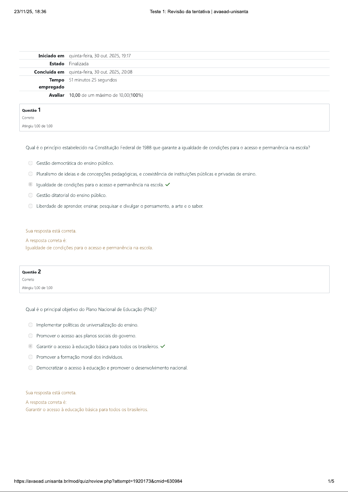 23/11/25, 18:36 Teste 1: Revisão da tentativa avaead-unisanta Iniciado em quinta-feira, 30 out. 2025, 19:17 Estado Finalizada Concluída em quinta-feira, 30 out. 2025, 20:08 Tempo 51 minutos 25 segundos empregado Avaliar 10,00 de um máximo de 10,00(100%) Questão 1 Correto Atingiu 1,00 de 1,00 Qual é princípio estabelecido na Constituição Federal de 1988 que garante a igualdade de condições para acesso e permanência na escola? Gestão democrática do ensino público. Pluralismo de ideias e de concepções pedagógicas, e coexistência de instituições públicas e privadas de ensino. Igualdade de condições para acesso e permanência na escola. Gestão ditatorial do ensino público. Liberdade de aprender, ensinar, pesquisar e divulgar pensamento, a arte e o saber. Sua resposta está correta. A resposta correta é: Igualdade de condições para acesso e permanência na escola. Questão 2 Correto Atingiu 1,00 de 1,00 Qual é principal objetivo do Plano Nacional de Educação (PNE)? Implementar políticas de universalização do ensino. Promover acesso aos planos sociais do governo. Garantir acesso à educação básica para todos os brasileiros. Promover a formação moral dos indivíduos. Democratizar acesso à educação e promover desenvolvimento nacional. Sua resposta está correta. A resposta correta é: Garantir acesso à educação básica para todos os brasileiros. 1/523/11/25, 18:36 Teste 1: Revisão da tentativa avaead-unisanta Questão 3 Correto Atingiu 1,00 de 1,00 Qual é dever do Estado em relação à educação, segundo Guia da Disciplina? Garantir acesso à educação básica para todos os brasileiros. Garantir educação pública de qualidade para alguns Brasileiros. Promover a formação moral dos indivíduos. Implementar políticas de universalização do ensino. Democratizar acesso à educação e promover desenvolvimento nacional. Sua resposta está correta. A resposta correta é: Garantir acesso à educação básica para todos os brasileiros. Questão 4 Correto Atingiu 1,00 de 1,00 De acordo com texto, qual é a função da Constituição Federal de 1988 no sistema jurídico brasileiro? Ela pode ser modificada livremente por qualquer autoridade governamental, sem a necessidade de emendas constitucionais. Ela ocupa mais alto patamar no sistema hierárquico das leis, prevalecendo sobre todas as outras legislações e estabelecendo os direitos e garantias dos cidadãos. Ela define apenas a estrutura do Poder Executivo, sem tratar dos demais poderes ou dos direitos dos cidadãos. Ela permite que os estados e municípios criem leis que prevalecem sobre a legislação federal, desde que se refiram a questões de interesse local. Ela estabelece que apenas as leis ordinárias, e não a Constituição, têm poder de regular direitos dos cidadãos e as instituições governamentais. Sua resposta está correta. A resposta correta é: Ela ocupa mais alto patamar no sistema hierárquico das leis, prevalecendo sobre todas as outras legislações e estabelecendo direitos e garantias dos cidadãos. 2/523/11/25, 18:36 Teste 1: Revisão da tentativa avaead-unisanta Questão 5 Correto Atingiu 1,00 de 1,00 De acordo com a Constituição Federal de 1988, qual é objetivo da educação no Brasil? Democratizar acesso à educação e promover desenvolvimento nacional. Garantir a não doutrinação de indivíduos. Garantir acesso à educação básica para todos brasileiros. Implementar políticas de universalização do ensino. Promover a formação moral dos indivíduos. Sua resposta está correta. A resposta correta é: Democratizar acesso à educação e promover desenvolvimento nacional. Questão 6 Correto Atingiu 1,00 de 1,00 De acordo com texto do Guia da Disciplina, qual é a lei que ocupa mais alto patamar no sistema hierárquico das leis? Leis ordinárias. Constituição Federal. Lei do Retorno. Leis complementares. Medidas provisórias. Sua resposta está correta. A resposta correta é: Constituição Federal. 3/523/11/25, 18:36 Teste 1: Revisão da tentativa avaead-unisanta Questão 7 Correto Atingiu 1,00 de 1,00 De acordo com texto, qual é objetivo da reflexão sobre a estrutura e organização do sistema educacional brasileiro? Discutir os principais desafios e características do sistema educacional brasileiro. Refletir sobre a evolução histórica da educação no Brasil. Promover uma educação de qualidade e equitativa. Interromper a educação doutrinadora no Brasil Compreender os diferentes níveis de ensino presentes no sistema educacional brasileiro. Sua resposta está correta. A resposta correta é: Discutir os principais desafios e características do sistema educacional brasileiro. Questão 8 Correto Atingiu 1,00 de 1,00 Segundo texto, qual é primeiro e mais amplo nível de ensino no Brasil? Educação Profissional. Ensino Técnico Educação Básica. Educação Superior. Educação Infantil. Sua resposta está correta. A resposta correta é: Educação Básica. 4/523/11/25, 18:36 Teste 1: Revisão da tentativa avaead-unisanta Questão 9 Correto Atingiu 1,00 de 1,00 Segundo Guia da disciplina, qual é principal desafio enfrentado pelo sistema educacional brasileiro? Desigualdades educacionais. Déficit de qualificação docente. Carência de infraestrutura nas escolas. Inclusão Educacional. Incorporação das tecnologias digitais na prática educativa. Sua resposta está correta. A resposta correta é: Desigualdades educacionais. Questão 10 Correto Atingiu 1,00 de 1,00 De acordo com texto, qual é a lei que estabelece a educação como um direito fundamental? Constituição Federal de 1988. Plano Nacional de Educação. Lei de Diretrizes e Bases da Educação Nacional (LDB). Estatuto da Criança e do Adolescente. Currículo Educacional Sua resposta está correta. A resposta correta é: Constituição Federal de 1988. 5/5