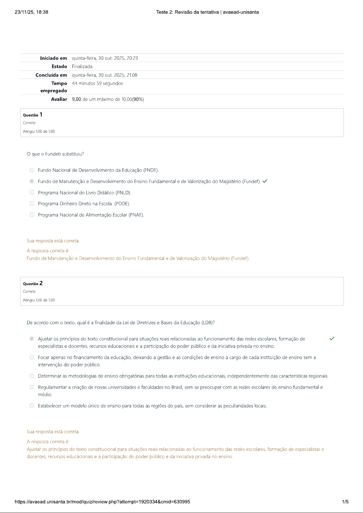 23/11/25, 18:38 Teste 2: Revisão da tentativa avaead-unisanta Iniciado em quinta-feira, 30 out. 2025, 20:23 Estado Finalizada Concluída em quinta-feira, 30 out. 2025, 21:08 Tempo 44 minutos 59 segundos empregado Avaliar 9,00 de um máximo de 10,00(90%) Questão 1 Correto Atingiu 1,00 de 1,00 que Fundeb substituiu? Fundo Nacional de Desenvolvimento da Educação (FNDE). Fundo de Manutenção e Desenvolvimento do Ensino Fundamental e de Valorização do Magistério (Fundef). Programa Nacional do Livro Didático (PNLD). Programa Dinheiro Direto na Escola (PDDE). Programa Nacional de Alimentação Escolar (PNAE). Sua resposta está correta. A resposta correta é: Fundo de Manutenção e Desenvolvimento do Ensino Fundamental e de Valorização do Magistério (Fundef). Questão 2 Correto Atingiu 1,00 de 1,00 De acordo com texto, qual é a finalidade da Lei de Diretrizes e Bases da Educação (LDB)? Ajustar princípios do texto constitucional para situações reais relacionadas ao funcionamento das redes escolares, formação de especialistas e docentes, recursos educacionais e a participação do poder público e da iniciativa privada no ensino. Focar apenas no financiamento da educação, deixando a gestão e as condições de ensino a cargo de cada instituição de ensino sem a intervenção do poder público. Determinar as metodologias de ensino obrigatórias para todas as instituições educacionais, independentemente das características regionais. Regulamentar a criação de novas universidades e faculdades no Brasil, sem se preocupar com as redes escolares de ensino fundamental e médio. Estabelecer um modelo único de ensino para todas as regiões do país, sem considerar as peculiaridades locais. Sua resposta está correta. A resposta correta é: Ajustar os princípios do texto constitucional para situações reais relacionadas ao funcionamento das redes escolares, formação de especialistas e docentes, recursos educacionais e a participação do poder público e da iniciativa privada no ensino. 1/523/11/25, 18:38 Teste 2: Revisão da tentativa avaead-unisanta Questão 3 Correto Atingiu 1,00 de 1,00 Quais são os temas transversais abordados nos Parâmetros Curriculares Nacionais? Ética, meio ambiente, pluralidade cultural, saúde, orientação sexual e trabalho e consumo. Todas as alternativas estão incorretas. Língua portuguesa, matemática, ciências naturais, geografia, história, arte, educação física e língua estrangeira. Movimento, música, artes visuais, linguagem oral e escrita, natureza e sociedade e matemática. Todas as alternativas anteriores estão corretas. Sua resposta está correta. A resposta correta é: Ética, meio ambiente, pluralidade cultural, saúde, orientação sexual e trabalho e consumo. Questão 4 Correto Atingiu 1,00 de 1,00 De acordo com a Lei de Diretrizes e Bases da Educação Nacional, qual é a duração mínima do ensino fundamental? 6 anos 12 anos 8 anos 9 anos 4 anos Sua resposta está correta. A resposta correta é: 9 anos 2/523/11/25, 18:38 Teste 2: Revisão da tentativa avaead-unisanta Questão 5 Correto Atingiu 1,00 de 1,00 No texto do capítulo 4 do Guia da Disciplina, qual é objetivo principal dos Referenciais Curriculares Nacionais para a Educação? Todas as alternativas estão corretas. Fornecer diretrizes e orientações para a construção dos currículos escolares. Promover a qualidade da educação em todo país. Promover a equidade da educação em todo país. Garantir que todos os estudantes tenham acesso a uma formação consistente e abrangente. Sua resposta está correta. A resposta correta é: Todas as alternativas estão corretas. Questão 6 Incorreto Atingiu 0,00 de 1,00 De acordo com a Lei de Diretrizes e Bases da Educação Nacional, qual é a finalidade da educação infantil? Promover a formação básica do cidadão, mediante a consolidação e aprofundamento dos conhecimentos adquiridos no ensino fundamental. Preparar a criança para exercício da cidadania e sua qualificação para trabalho. Desenvolver integralmente a criança em seus aspectos físico, psicológico, intelectual e social. Desenvolver parcialmente a criança em seus aspectos físico, psicológico, intelectual e social. Todas as alternativas anteriores estão corretas. Sua resposta está incorreta. A resposta correta é: Desenvolver integralmente a criança em seus aspectos físico, psicológico, intelectual e social. 3/523/11/25, 18:38 Teste 2: Revisão da tentativa avaead-unisanta Questão 7 Correto Atingiu 1,00 de 1,00 No texto, qual é objetivo das políticas educacionais voltadas para a universalização do acesso, qualidade e equidade? Estudar as políticas educacionais voltadas para a universalização do acesso, qualidade e equidade. Todas as alternativas estão corretas. Conhecer os programas governamentais para a melhoria do ensino. Conhecer ações governamentais para a melhoria do ensino. Refletir sobre a avaliação e monitoramento das políticas públicas educacionais. Sua resposta está correta. A resposta correta é: Todas as alternativas estão corretas. Questão 8 Correto Atingiu 1,00 de 1,00 Qual é um dos desafios enfrentados pelo financiamento da educação no Brasil? Insuficiência de recursos. Desvio de verbas Todas as alternativas estão corretas. Falta de transparência na aplicação dos recursos. Má gestão dos recursos. Sua resposta está correta. A resposta correta é: Todas as alternativas estão corretas. 4/523/11/25, 18:38 Teste 2: Revisão da tentativa avaead-unisanta Questão 9 Correto Atingiu 1,00 de 1,00 Qual é a principal fonte de financiamento do Fundeb? Imposto sobre Produtos Industrializados (IPI). Imposto sobre Circulação de Mercadorias e Serviços (ICMS). Imposto sobre Propriedade de Veículos Automotores (IPVA). Imposto de Renda. Imposto Predial e Territorial Urbano (IPTU). Sua resposta está correta. A resposta correta é: Imposto sobre Circulação de Mercadorias e Serviços (ICMS). Questão 10 C