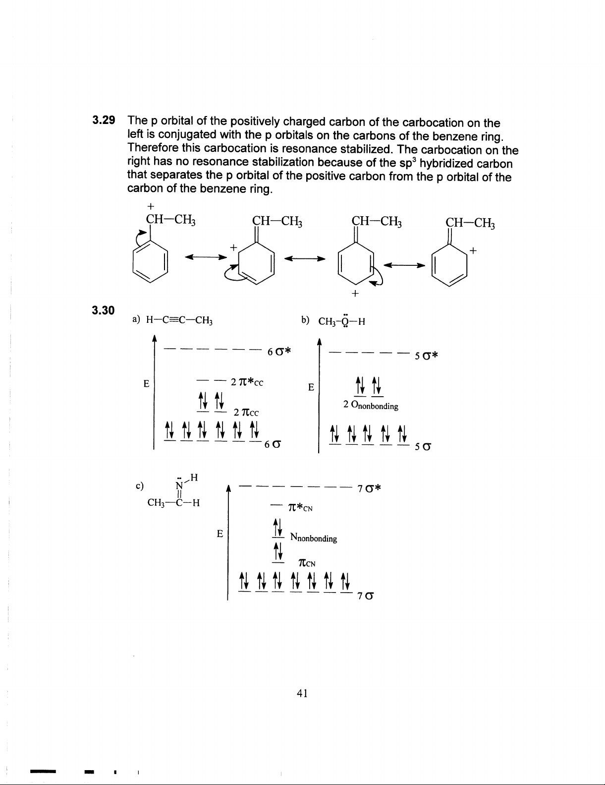 3.29 The p orbital of the positively charged carbon of the carbocation on the left is conjugated with the p orbitals on the carbons of the benzene ring. Therefore this carbocation is resonance stabilized. The carbocation on the right has no resonance stabilization because of the sp³ hybridized carbon that separates the p orbital of the positive carbon from the p orbital of the carbon of the benzene ring. + CH-CH₃ CH-CH₃ CH-CH₃ CH-CH₃ + + + 3.30 a) b) 60* E 2π*cc E N 2 Ononbonding 2 πcc 60 c) N H E Nnonbonding 70 41